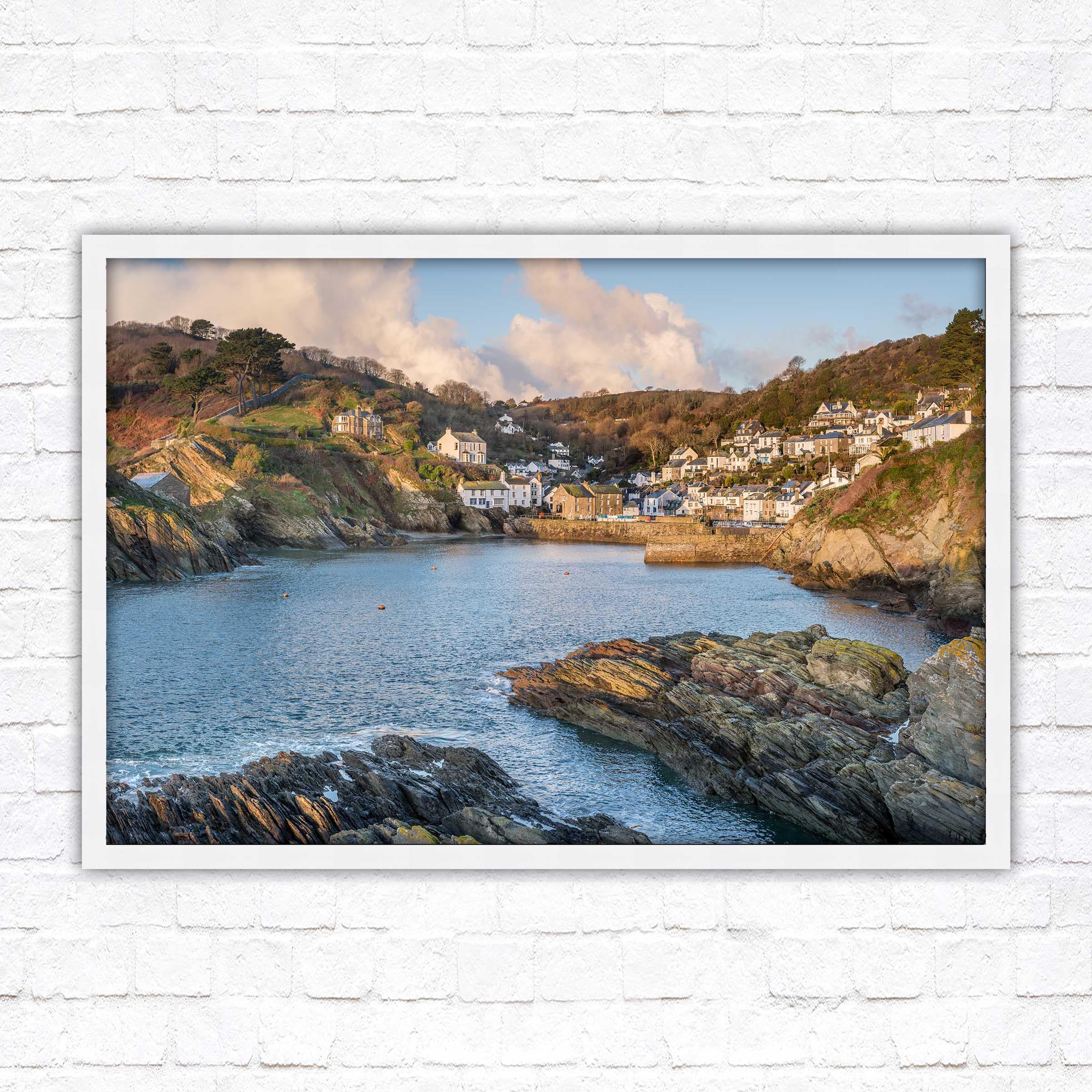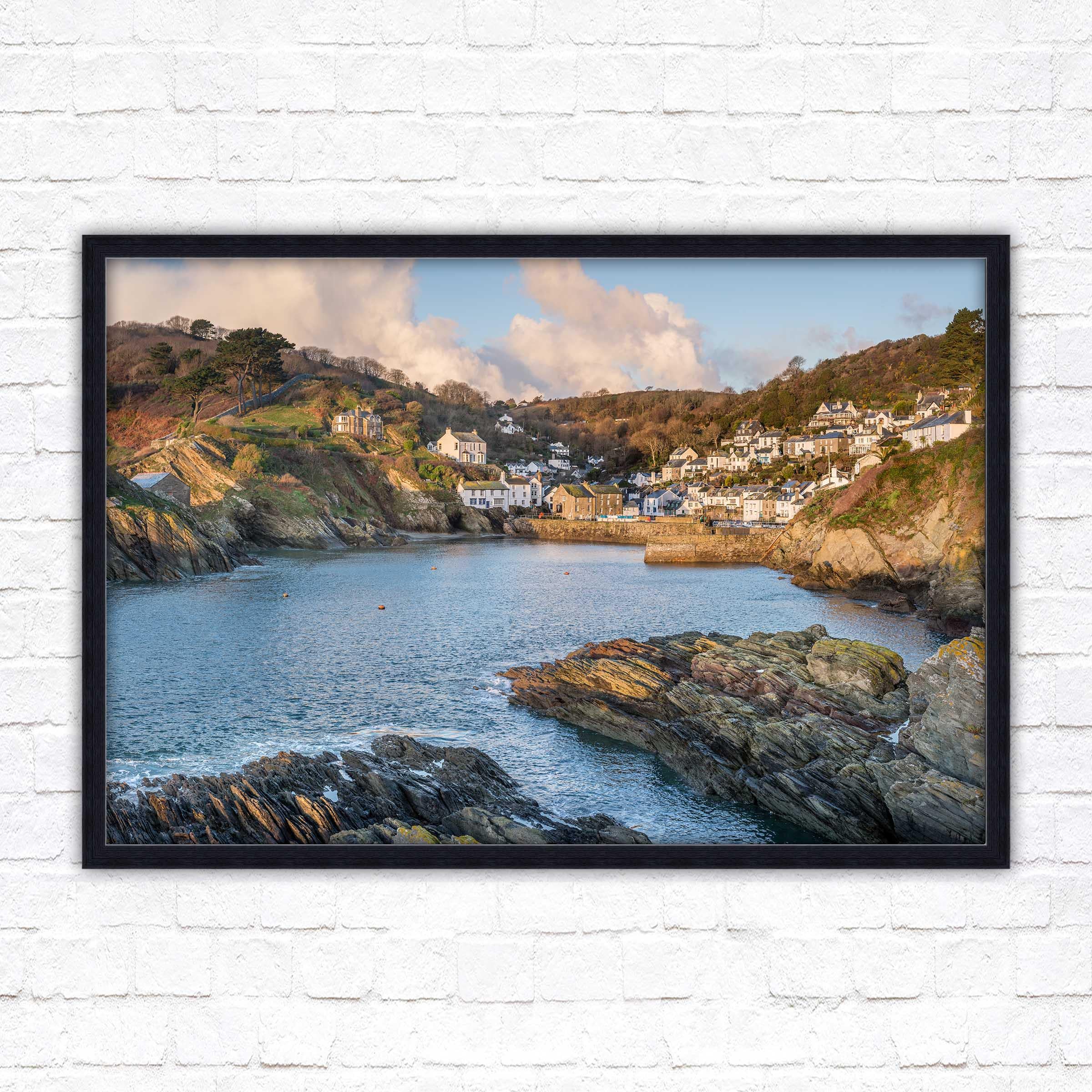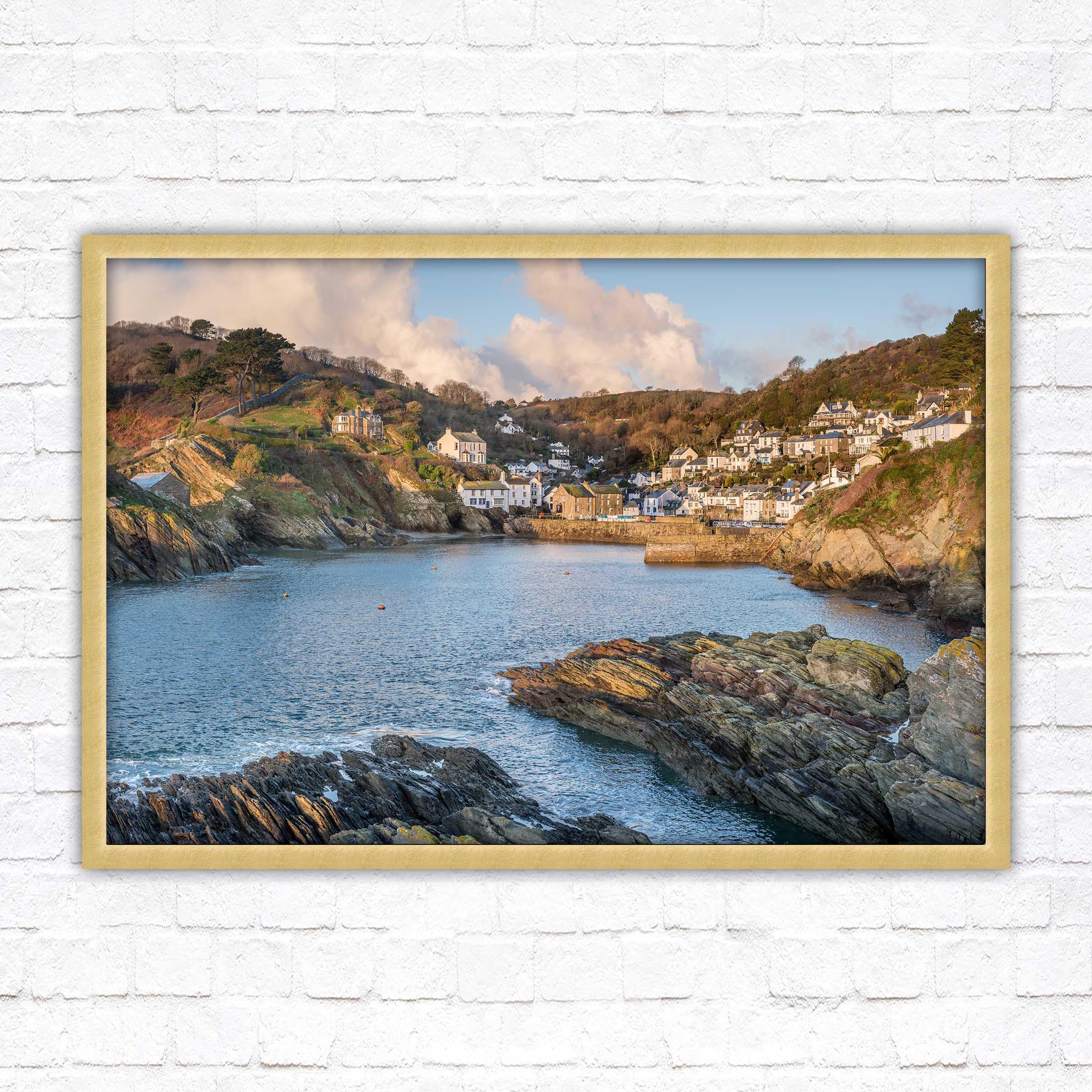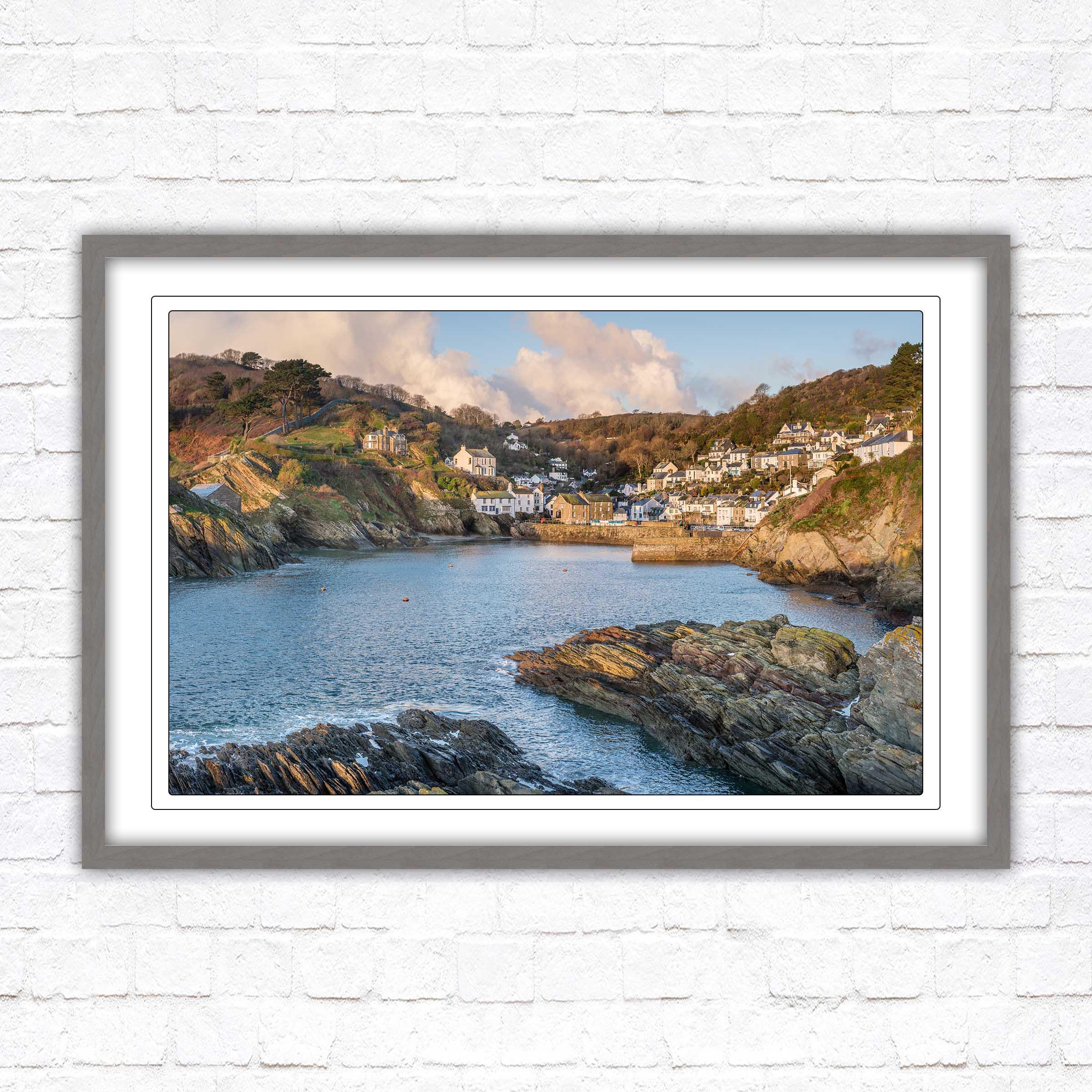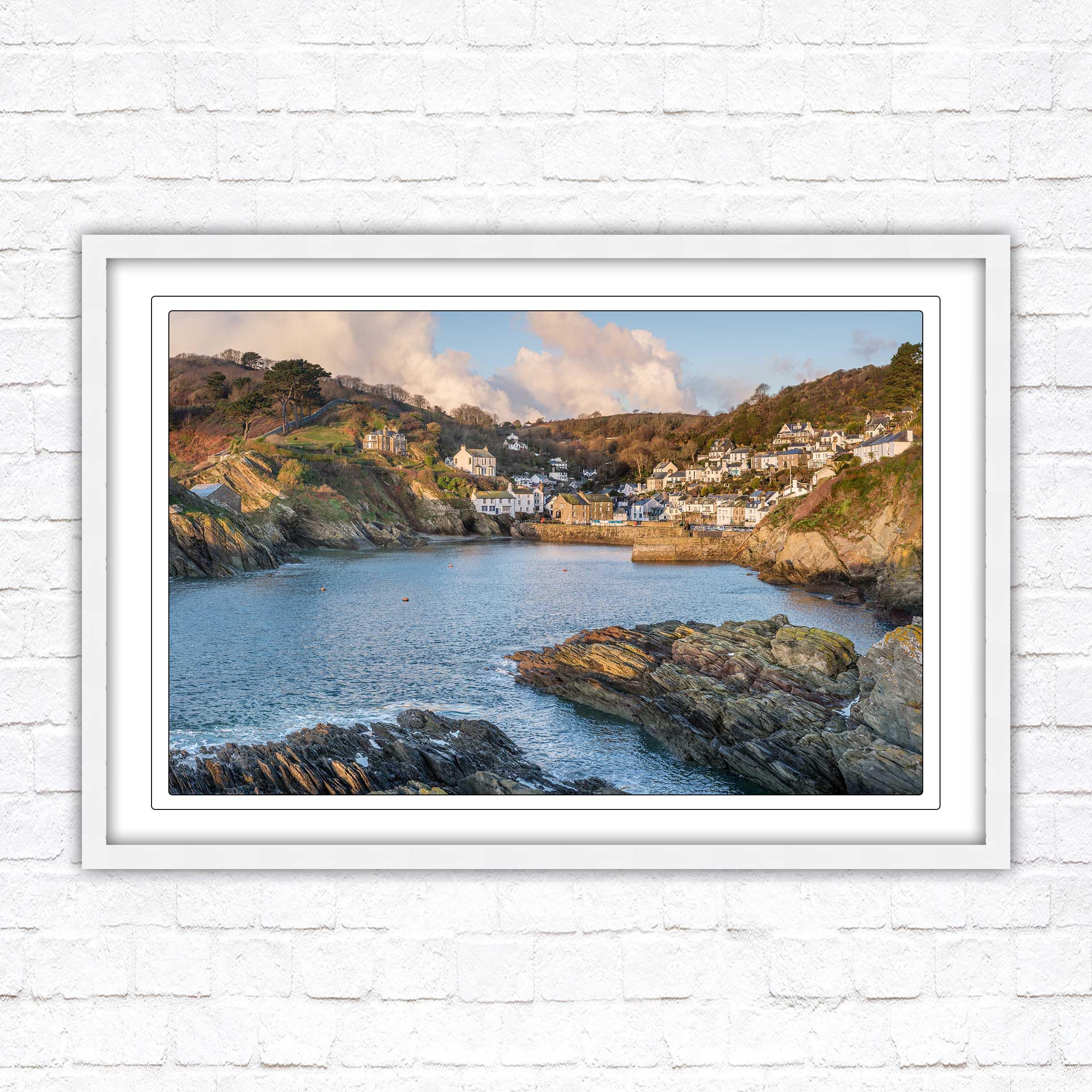 Polperro harbour in early morning light, Cornwall. Framed picture. Choose from a selection of frame styles.