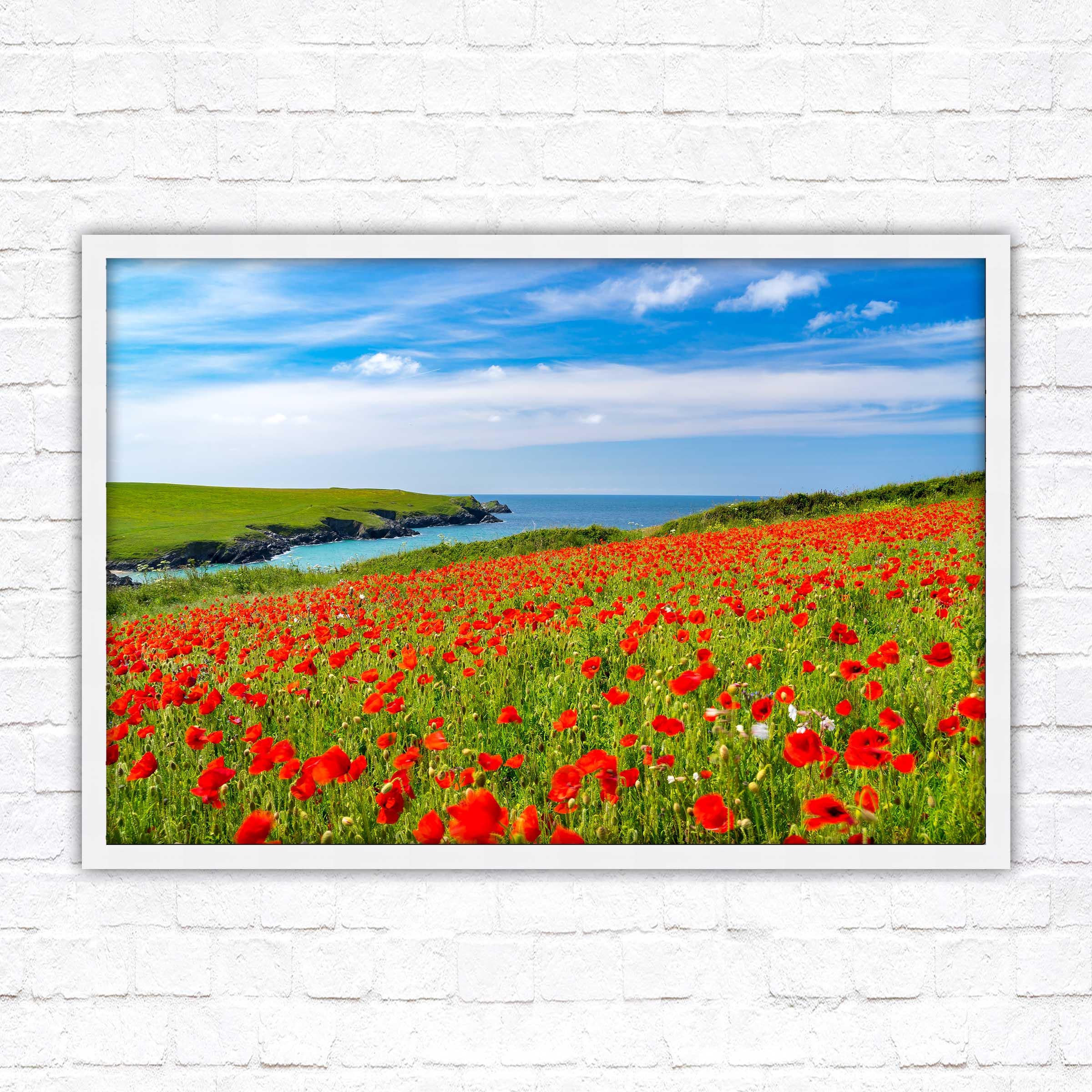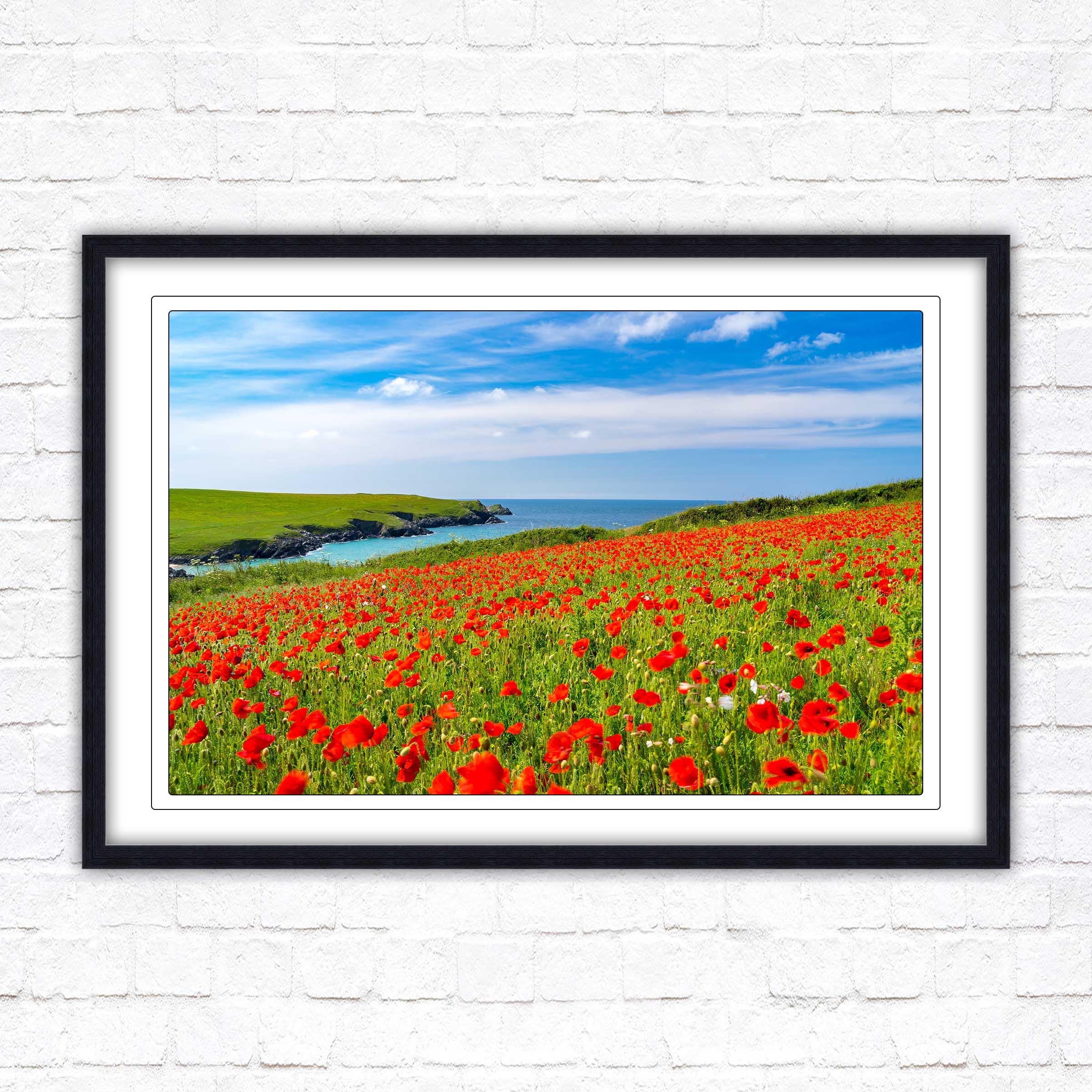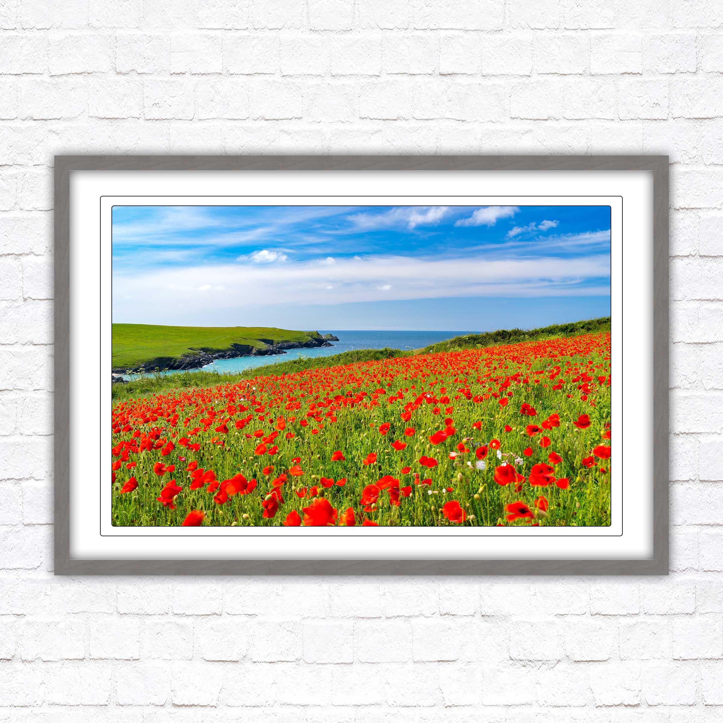 Poppies near Polly Joke beach, Cornwall. Framed picture. Choose from a selection of frame styles.