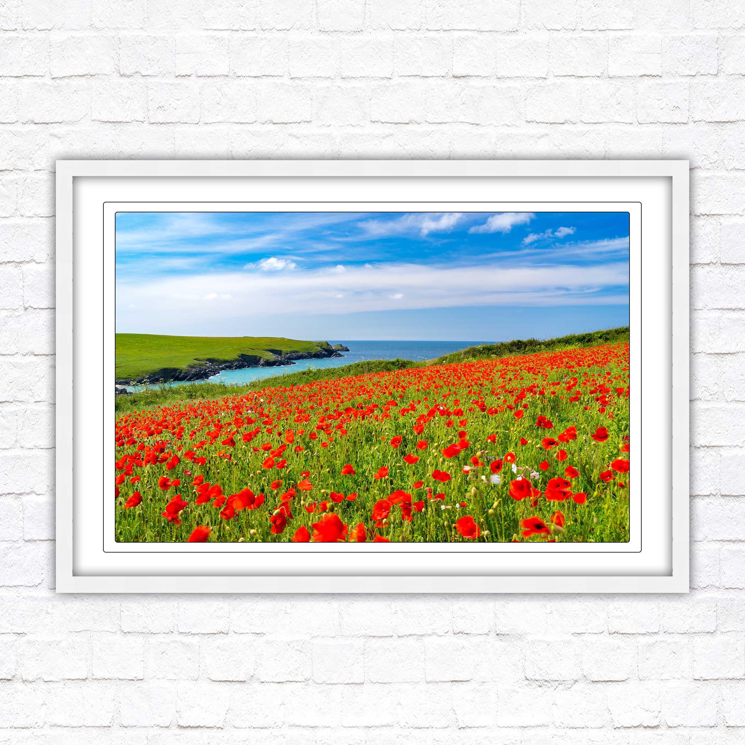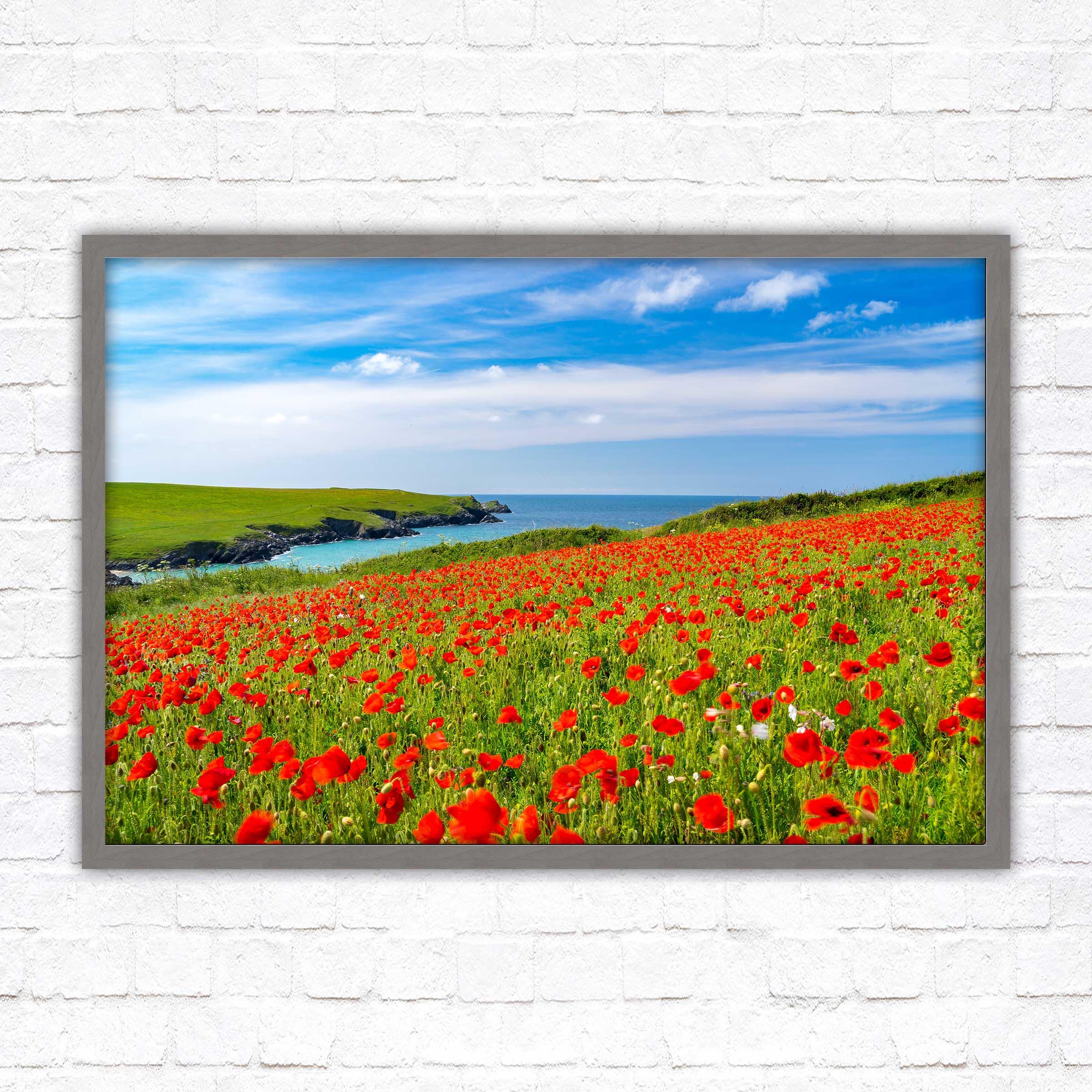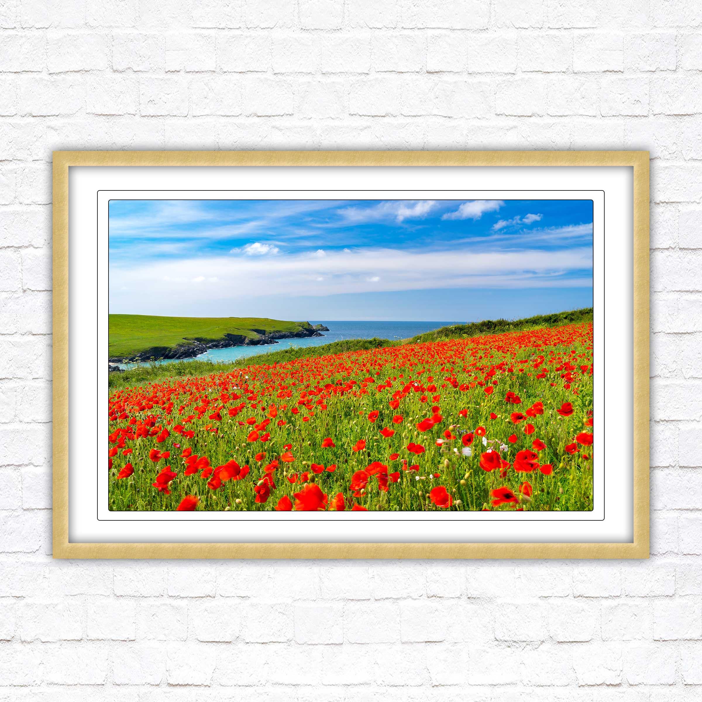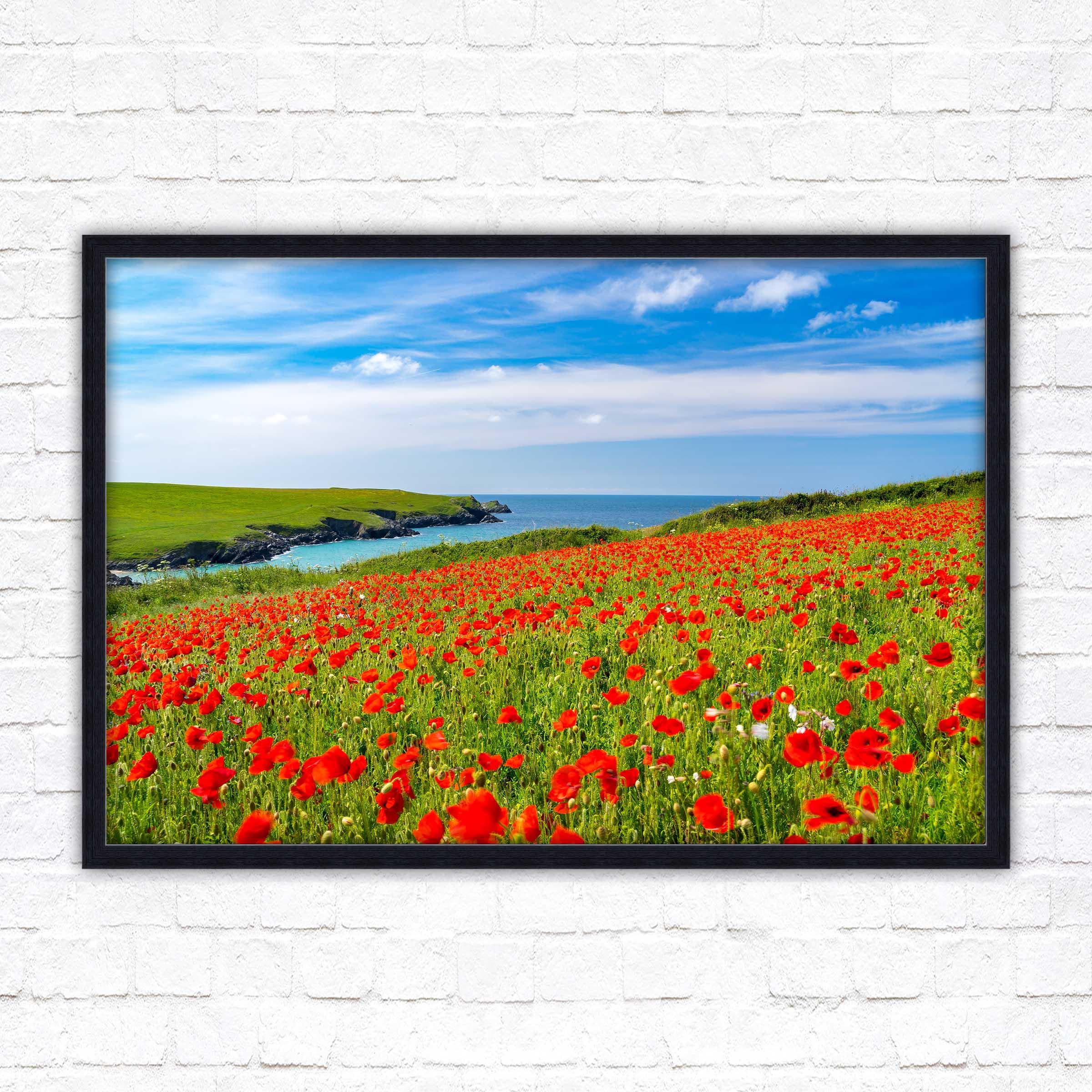 Poppies near Polly Joke beach, Cornwall. Framed picture. Choose from a selection of frame styles.