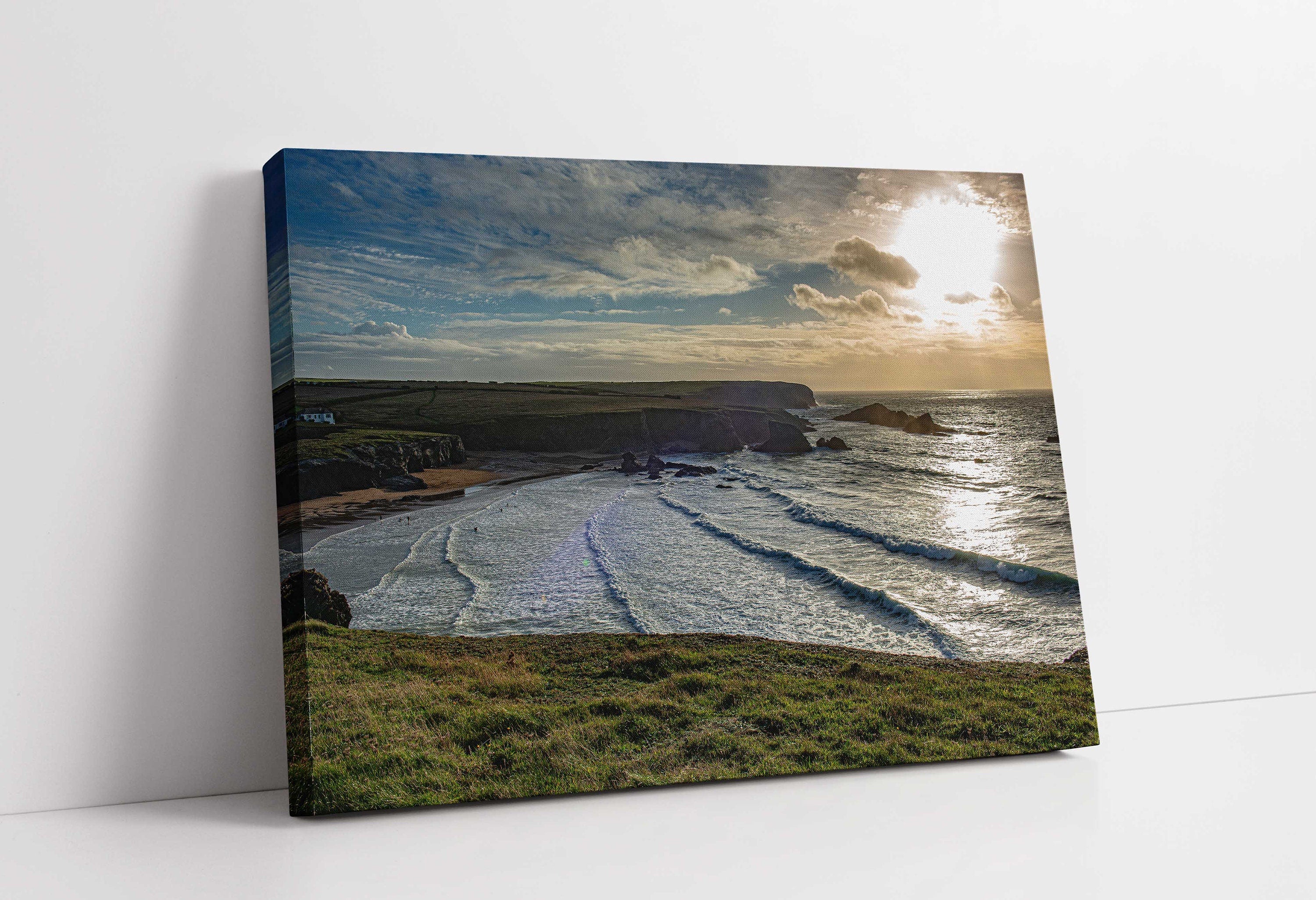 A beautiful landscape canvas picture of Porthcothan beach, near Padstow, North Cornwall. Stunning picture taken from the clifftops, capturing the scenery of the coast.