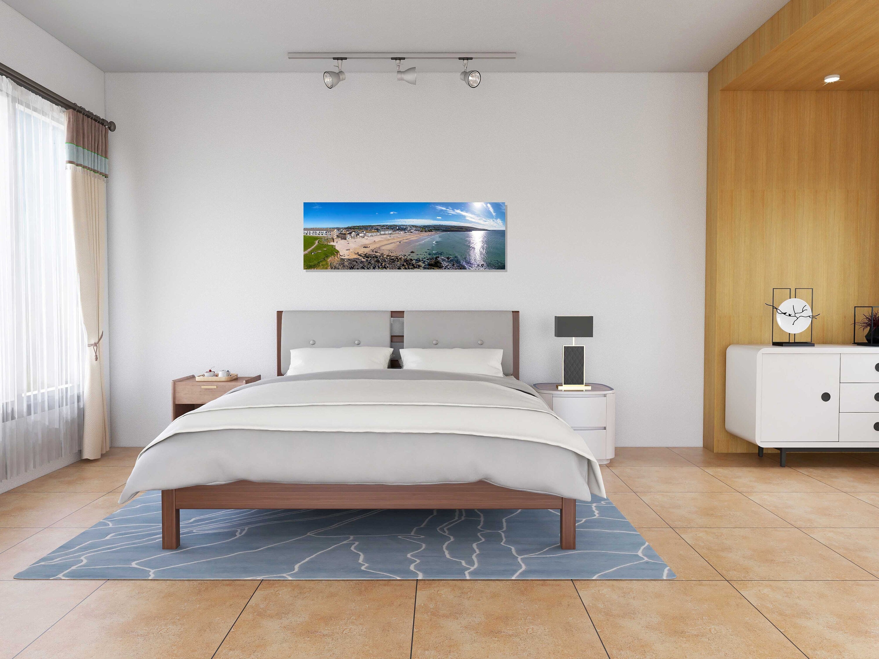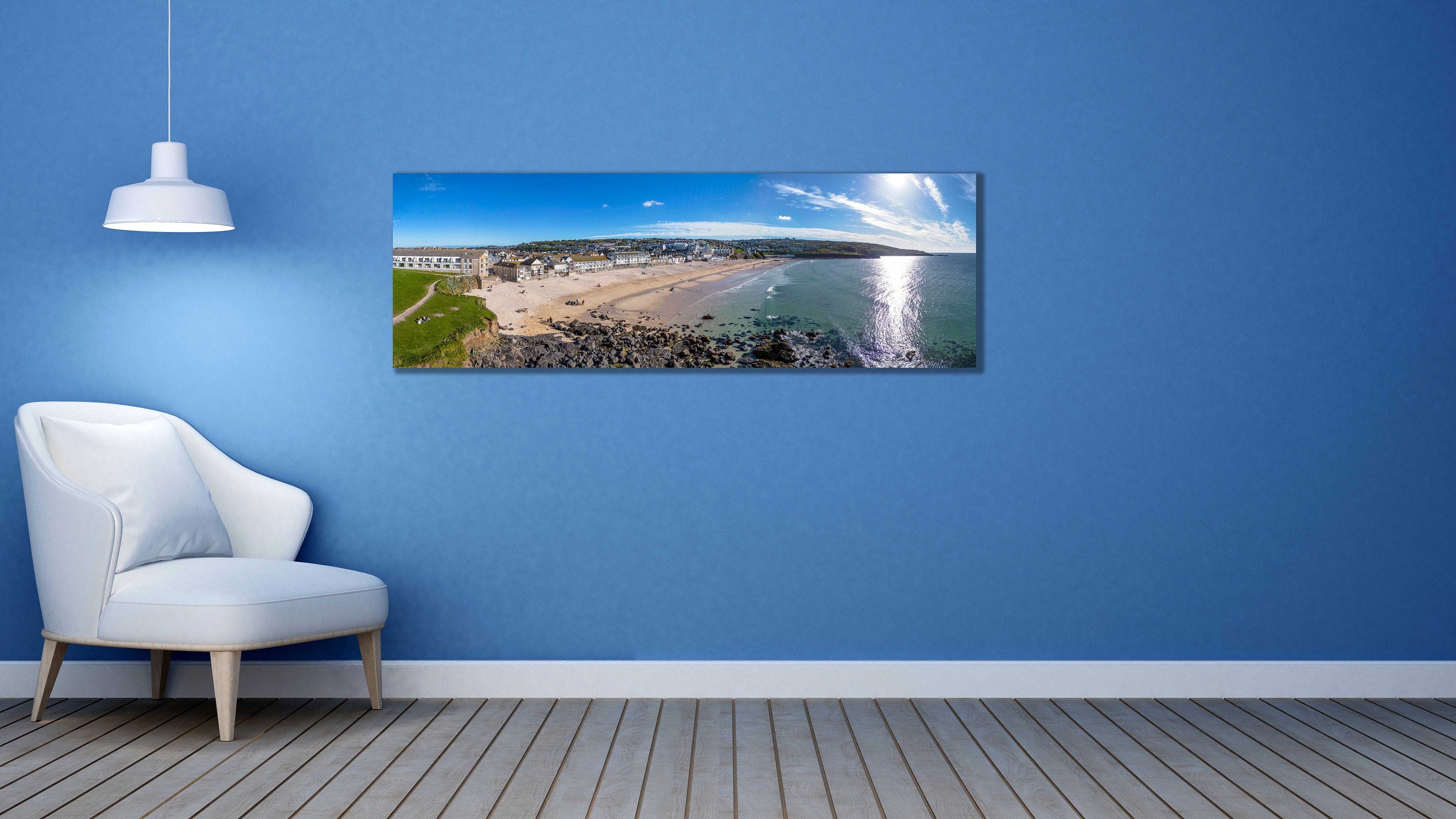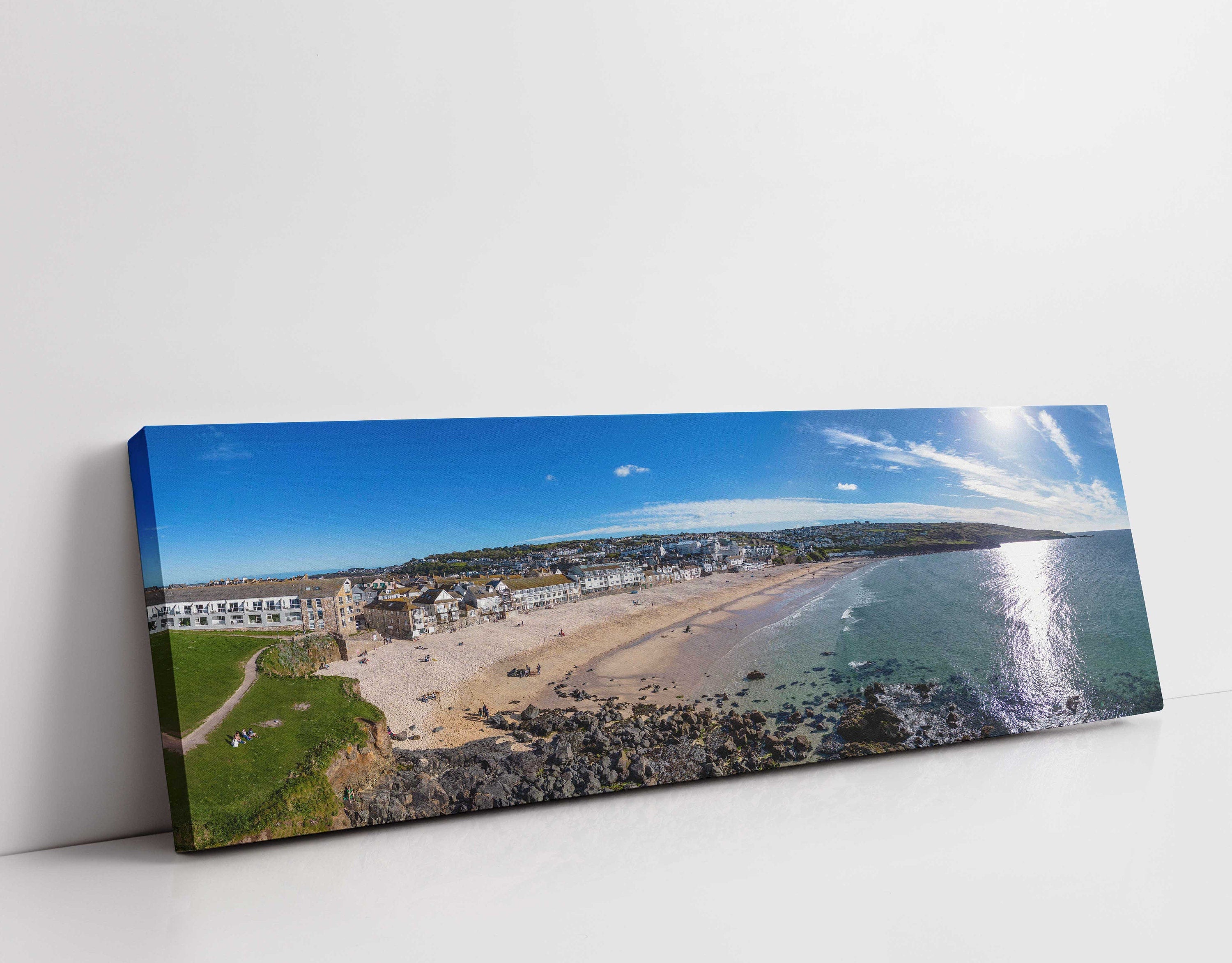 A beautiful aerial panoramic picture of Porthmeor Beach in Cornwall