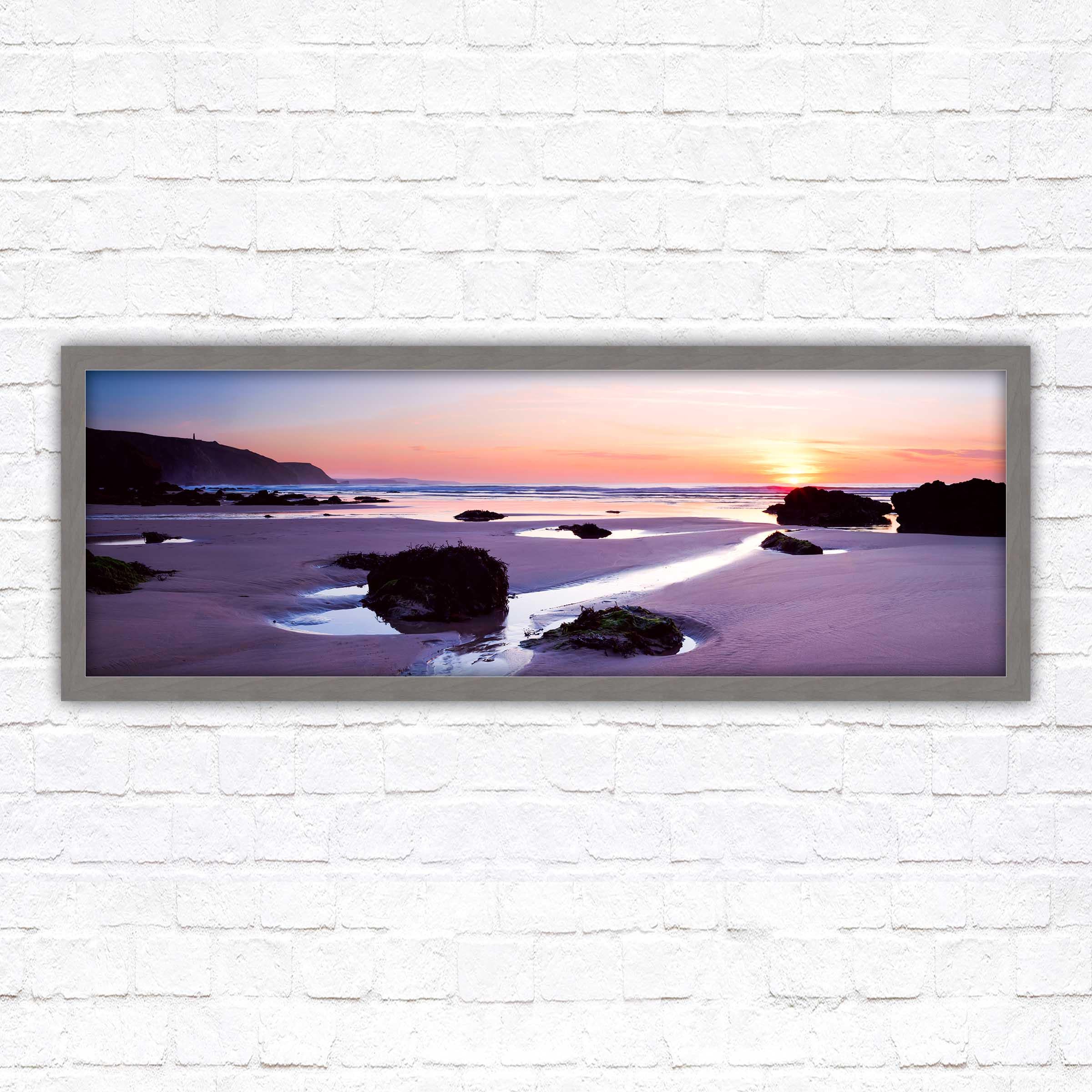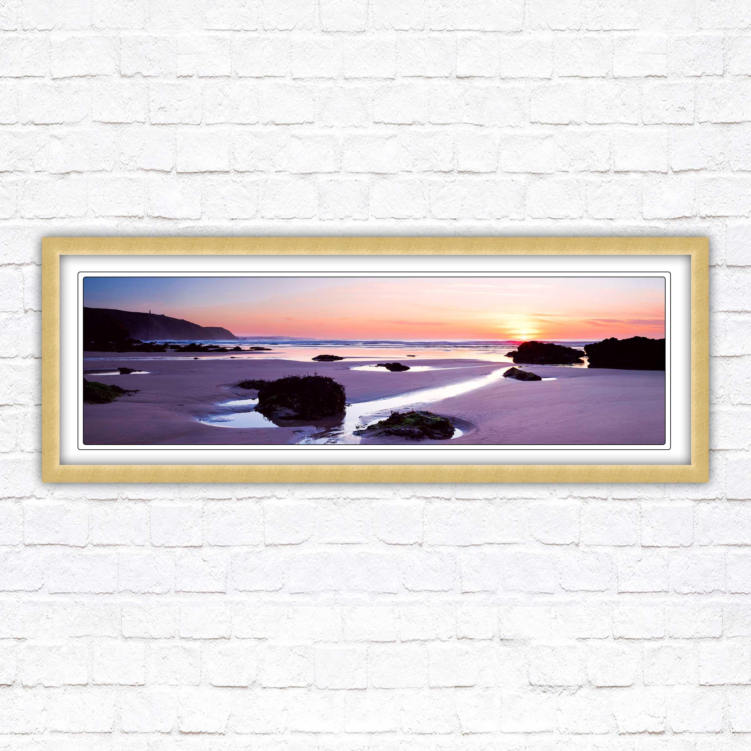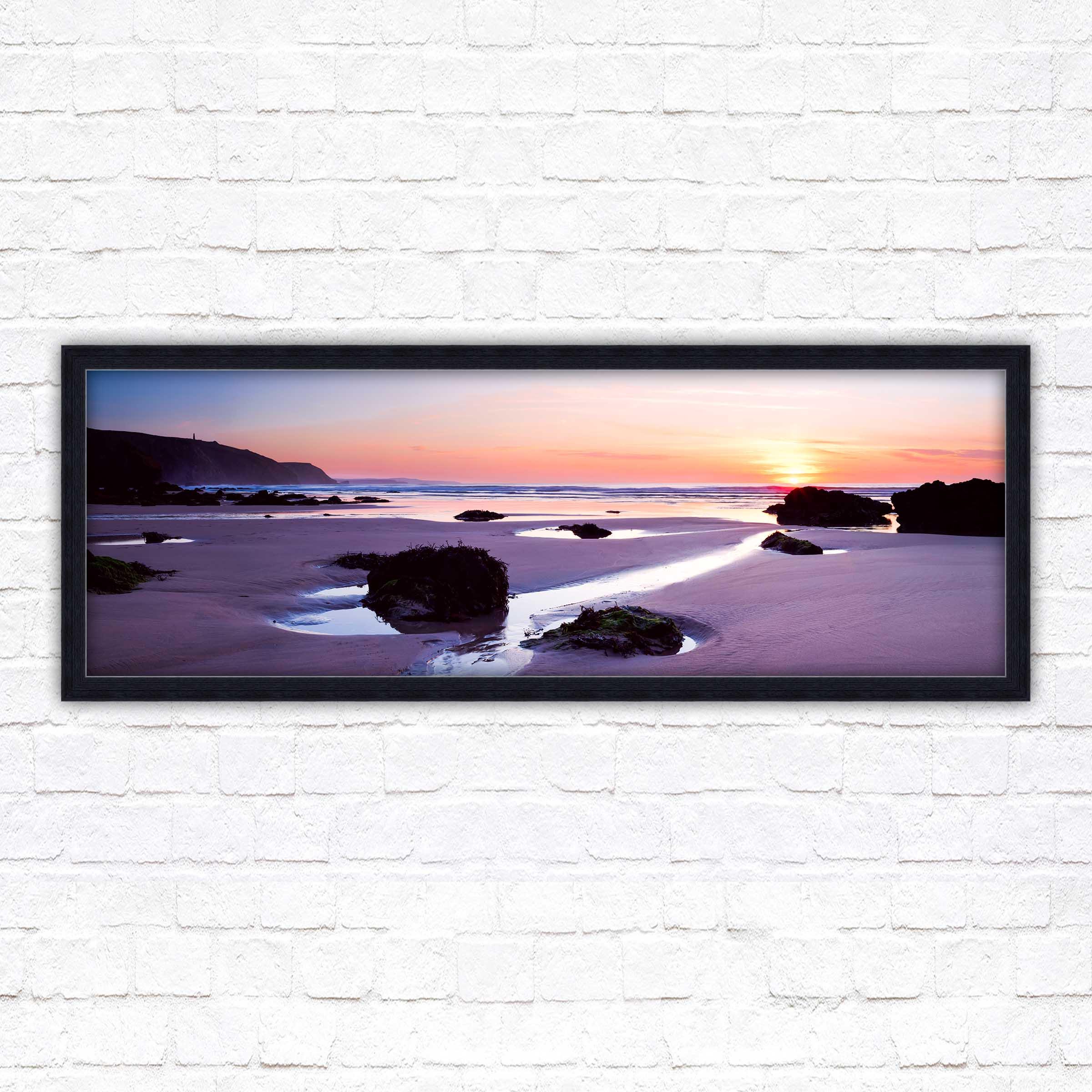 A beautiful panoramic framed picture of Porthtowan beach at sunset, Cornwall. A choice of frames available. Cornish coastal sunset. Beautiful home gift.