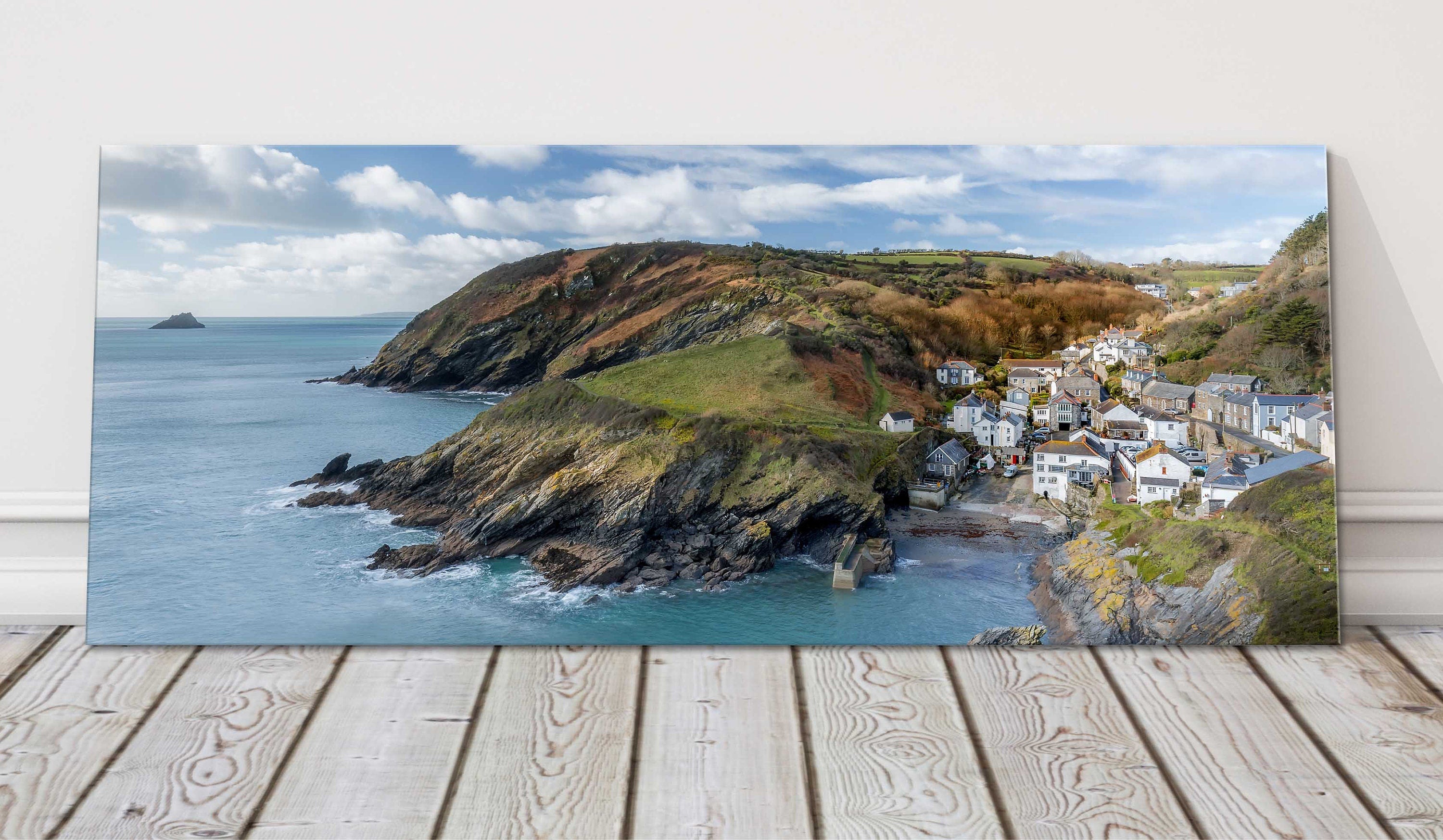 A beautiful panoramic picture of fishing village of Portloe, on the coast of Cornwall. Harbour view, seascape picture. Printed and framed as a canvas print. Choice of sizes available to order.