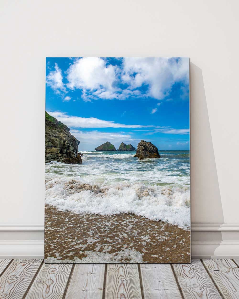 Portrait view of Holywell Bay, Cornwall. Iconic Gul rock Canvas Print Wall decor for home or office (Interior) beach seascape.