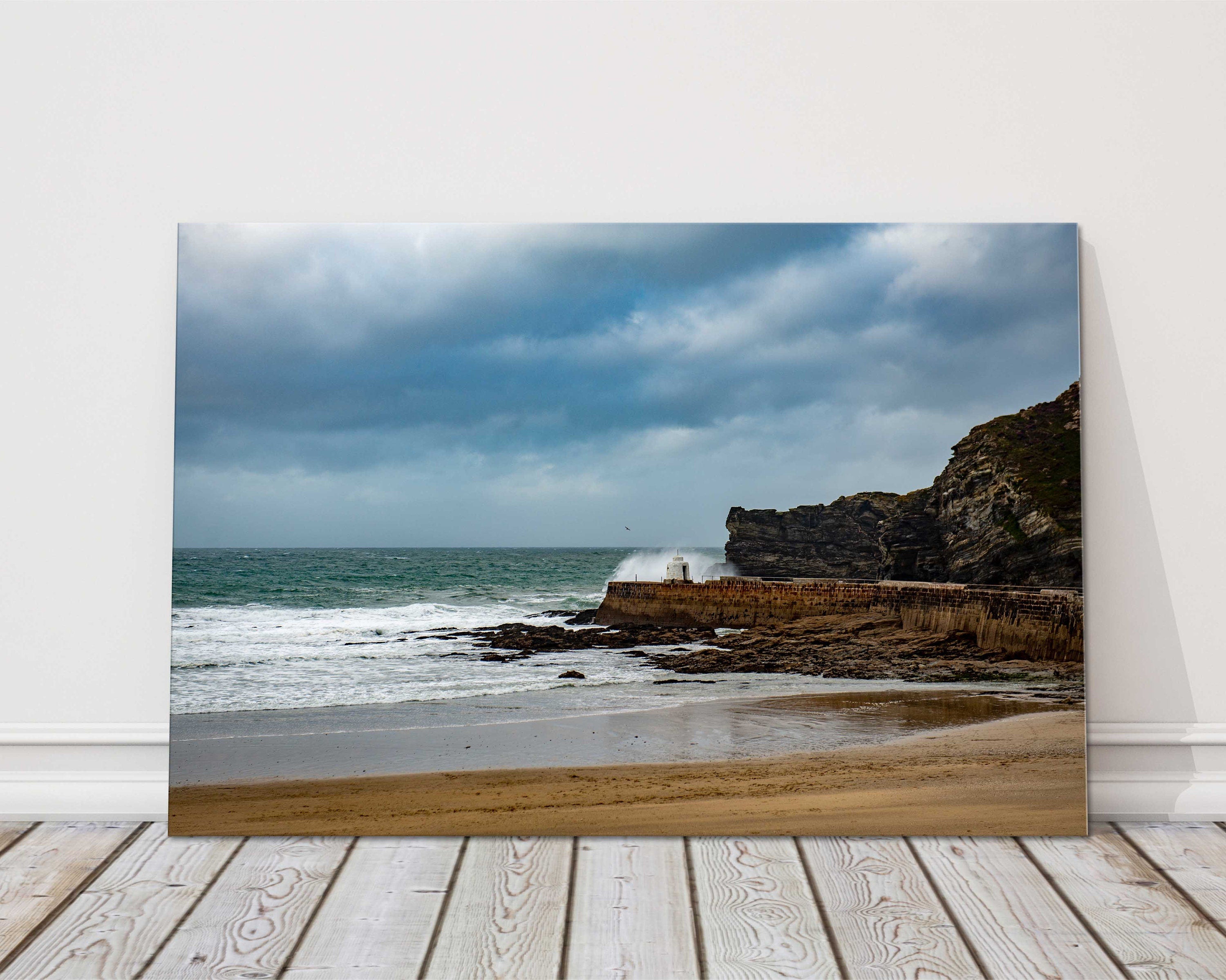 Portreath harbour, Cornwall. Dramatic stormy seas and sky capturing the iconic harbour wall. Printed and framed as a canvas picture.