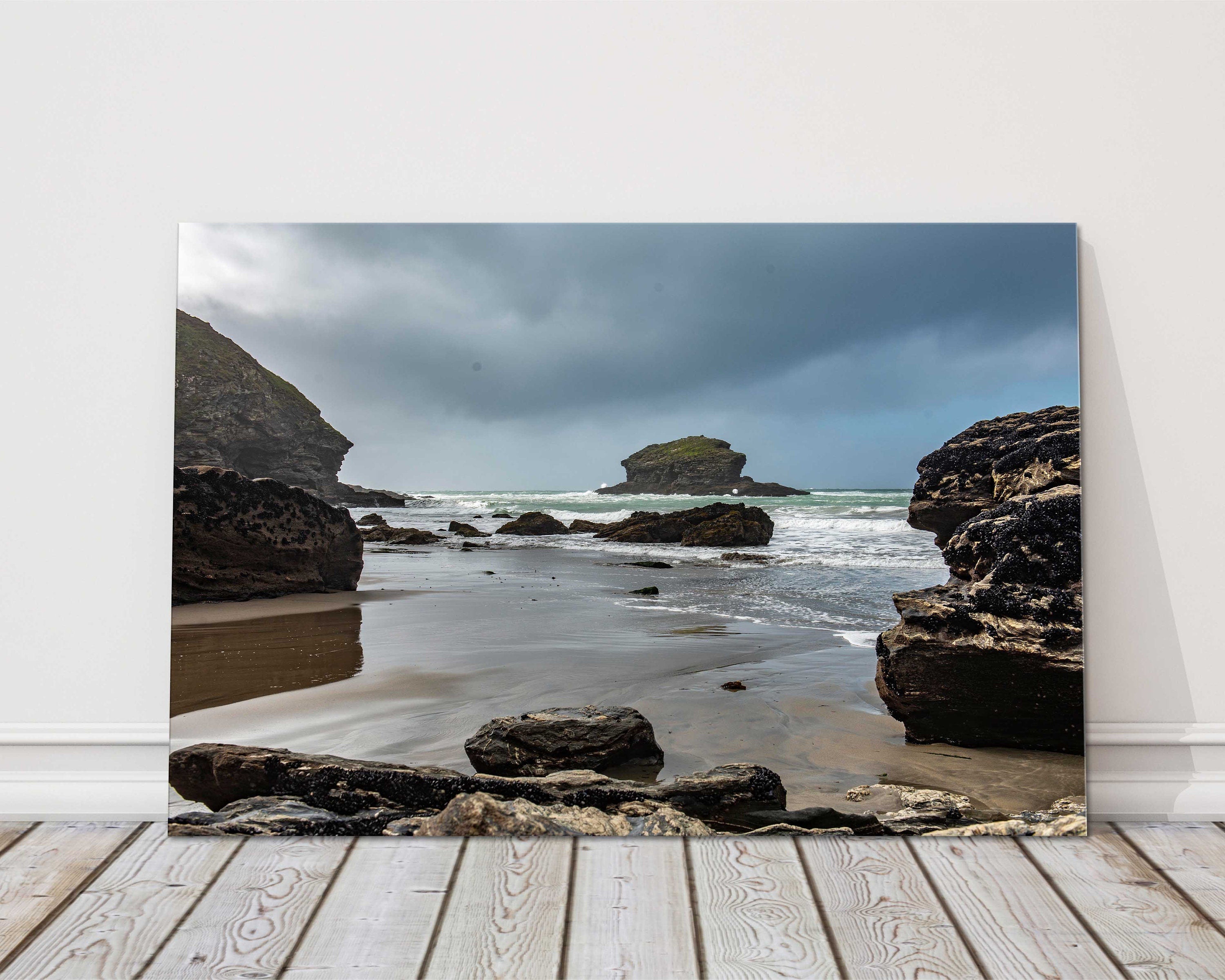 Portreath beach on a stormy day. View from beach and detailing sea stacks on the coastline. Printed and framed as... Read more