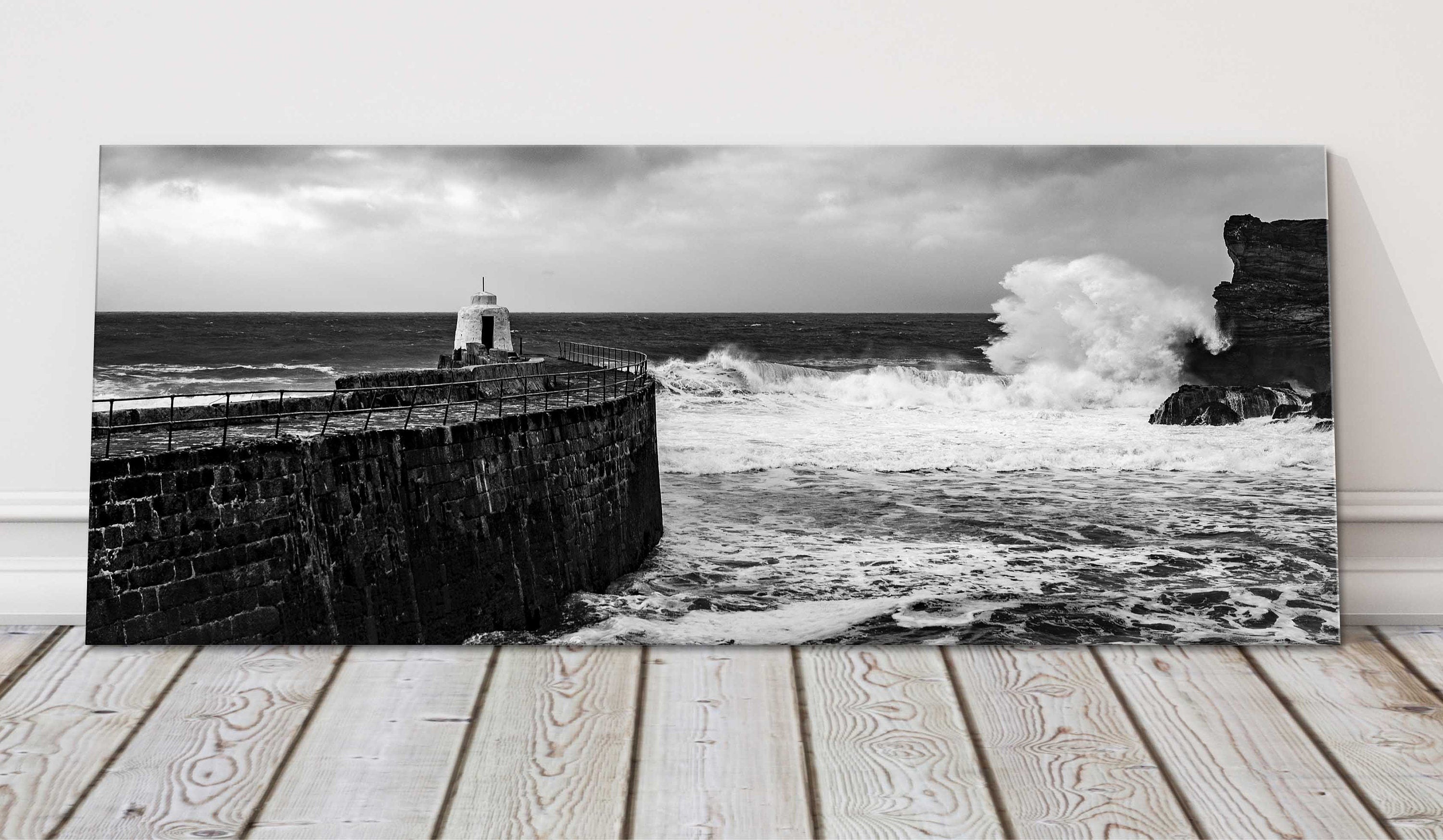 Black and white Panoramic view from Portreath Harbour, Waves crashing on the rocks. Printed on to a canvas picture.