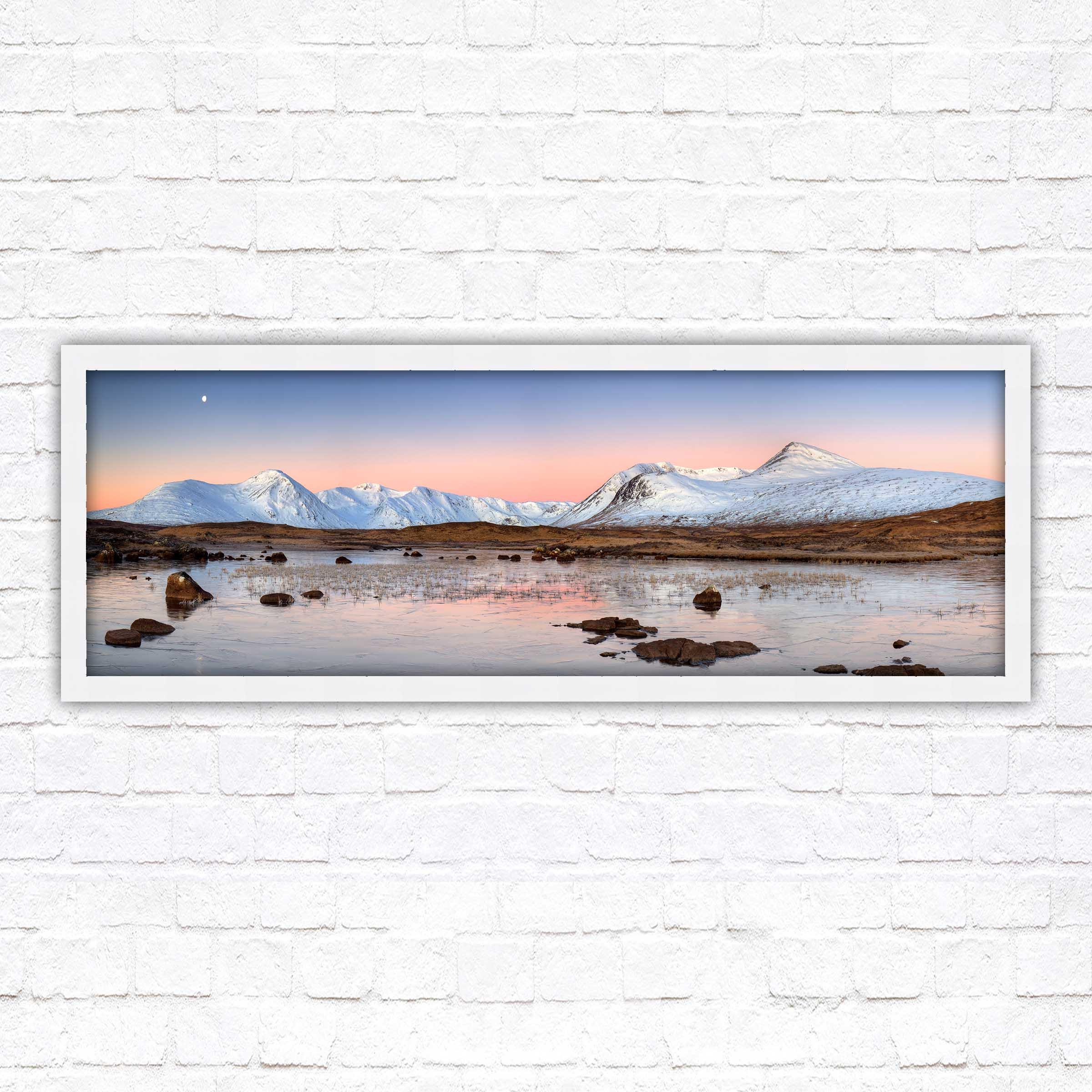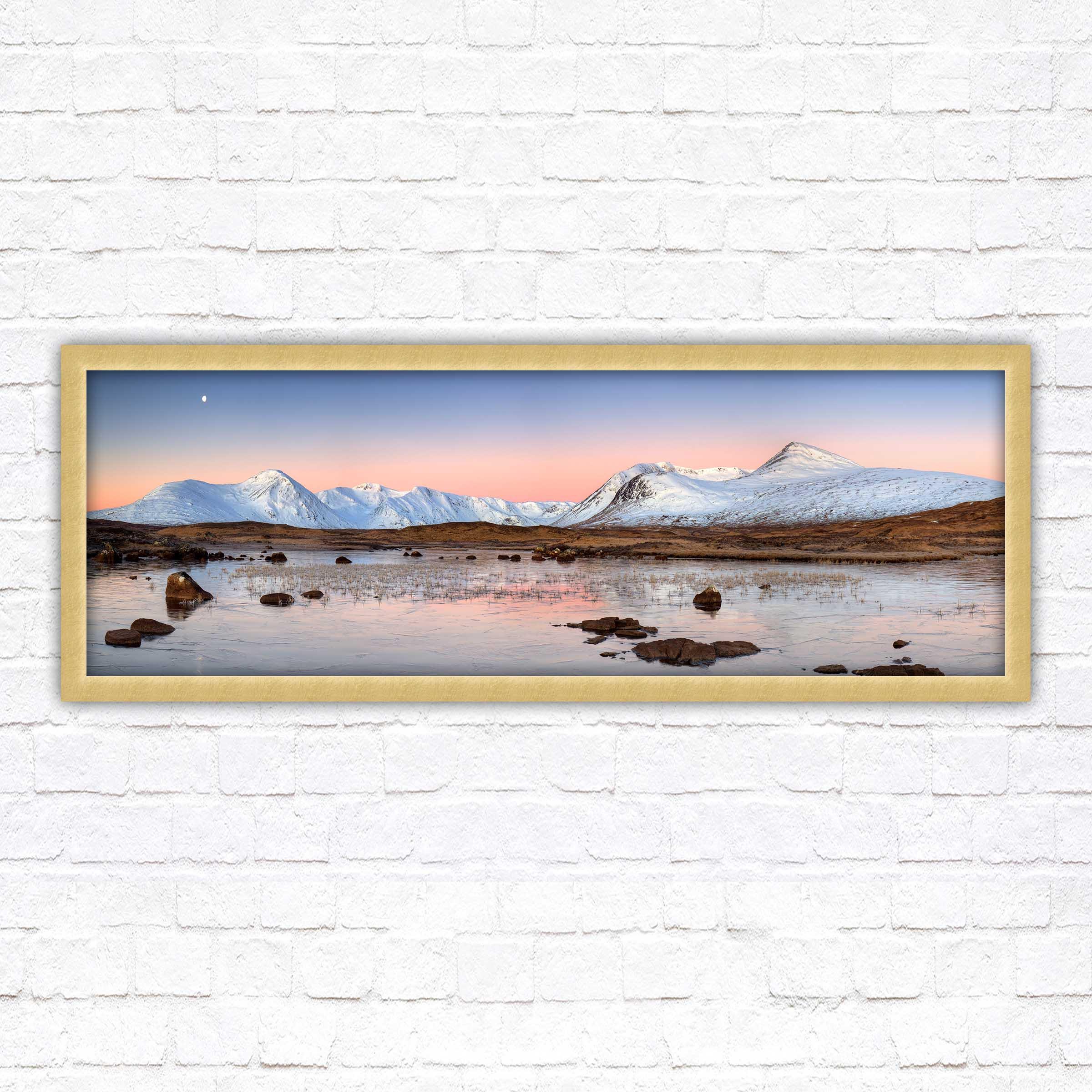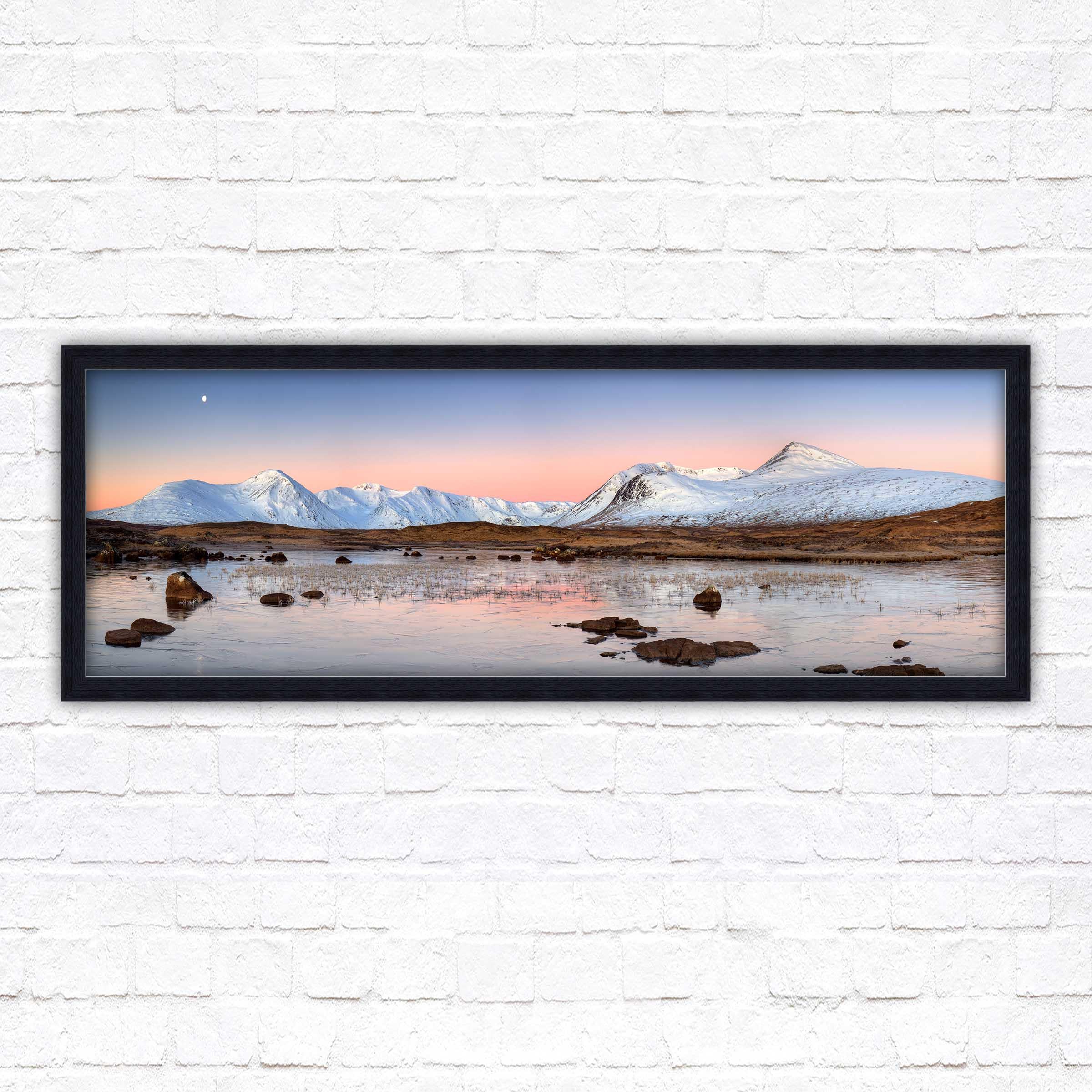 A beautiful panoramic framed picture of Rannoch Moor, Scotland. Sunrise over the lake and mountains. A choice of frames available. Beautiful gift. Birthday, Mothers Day.