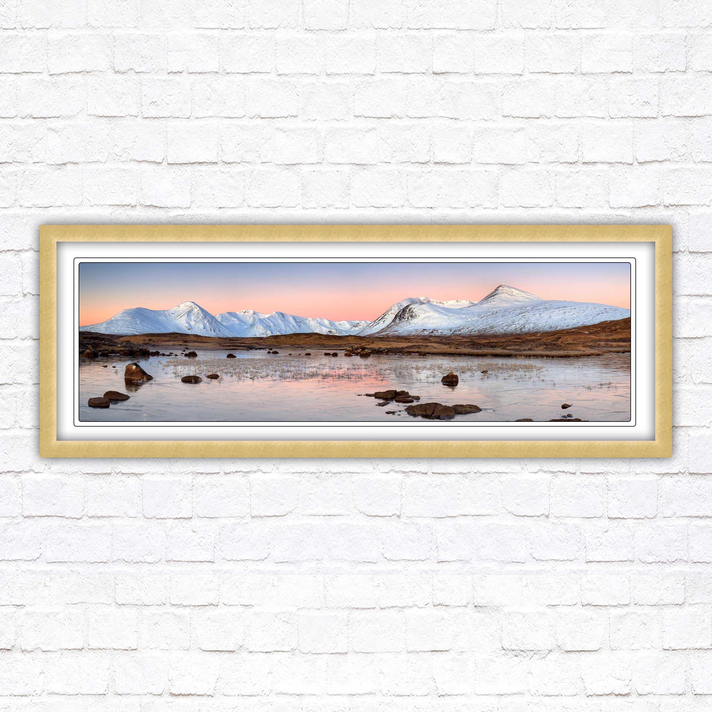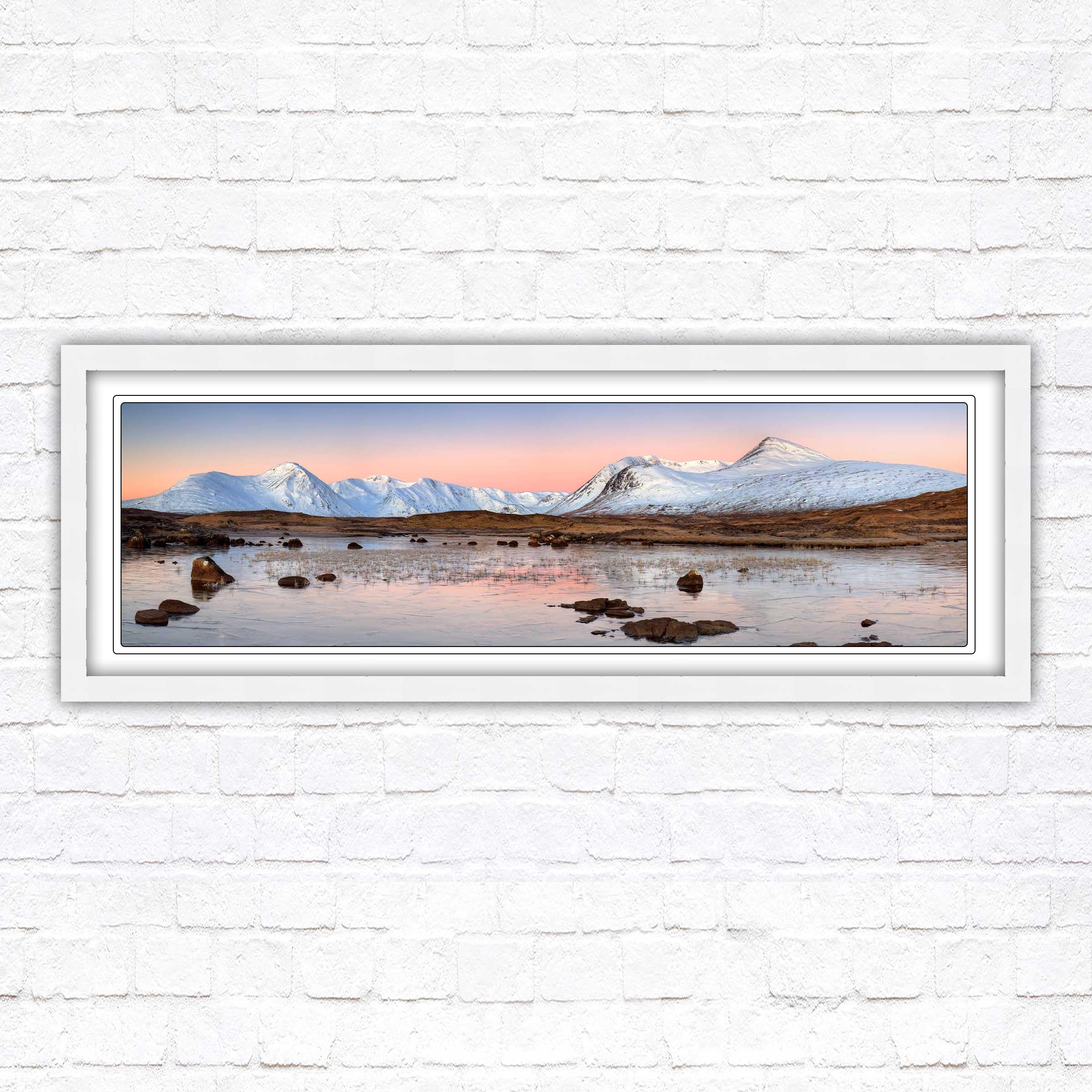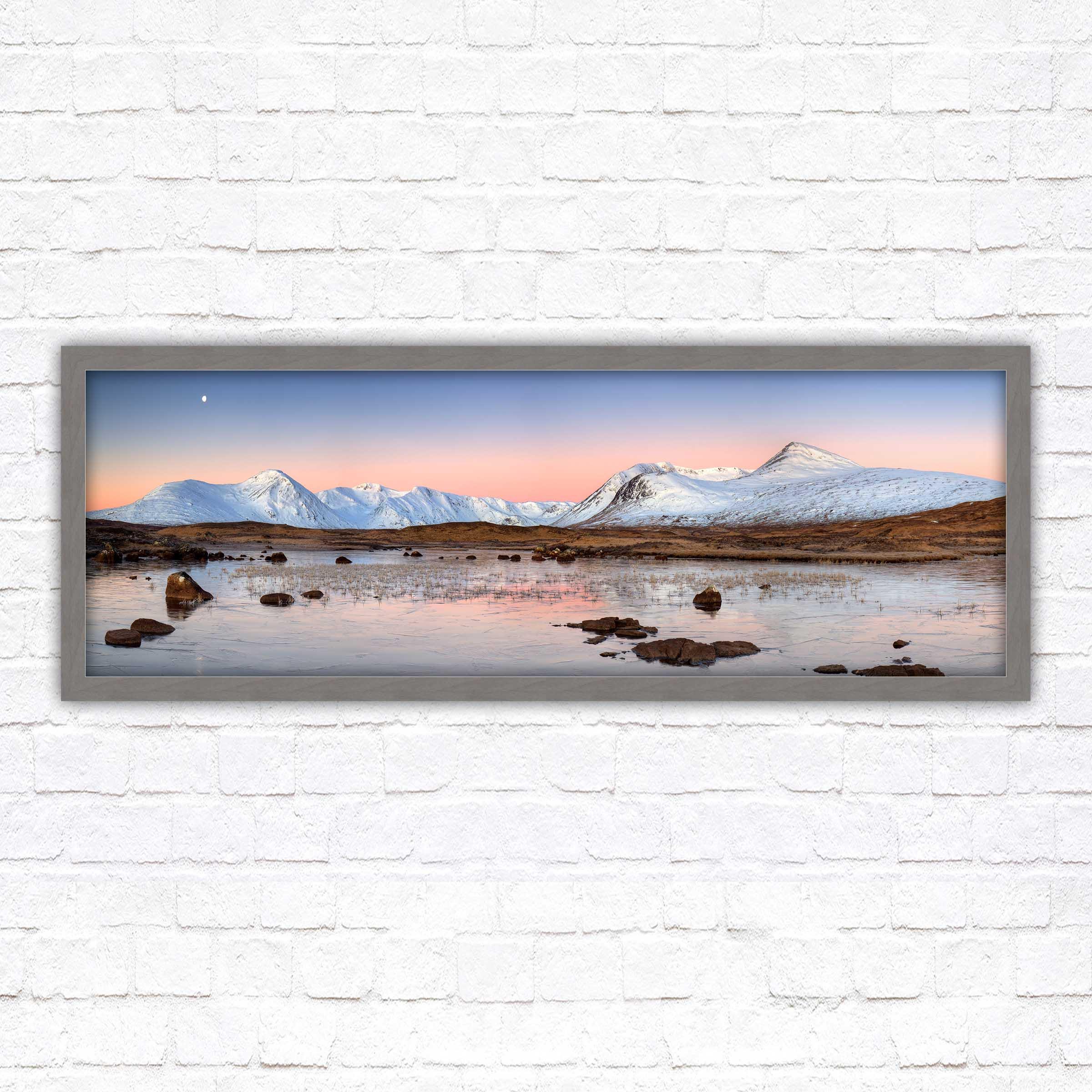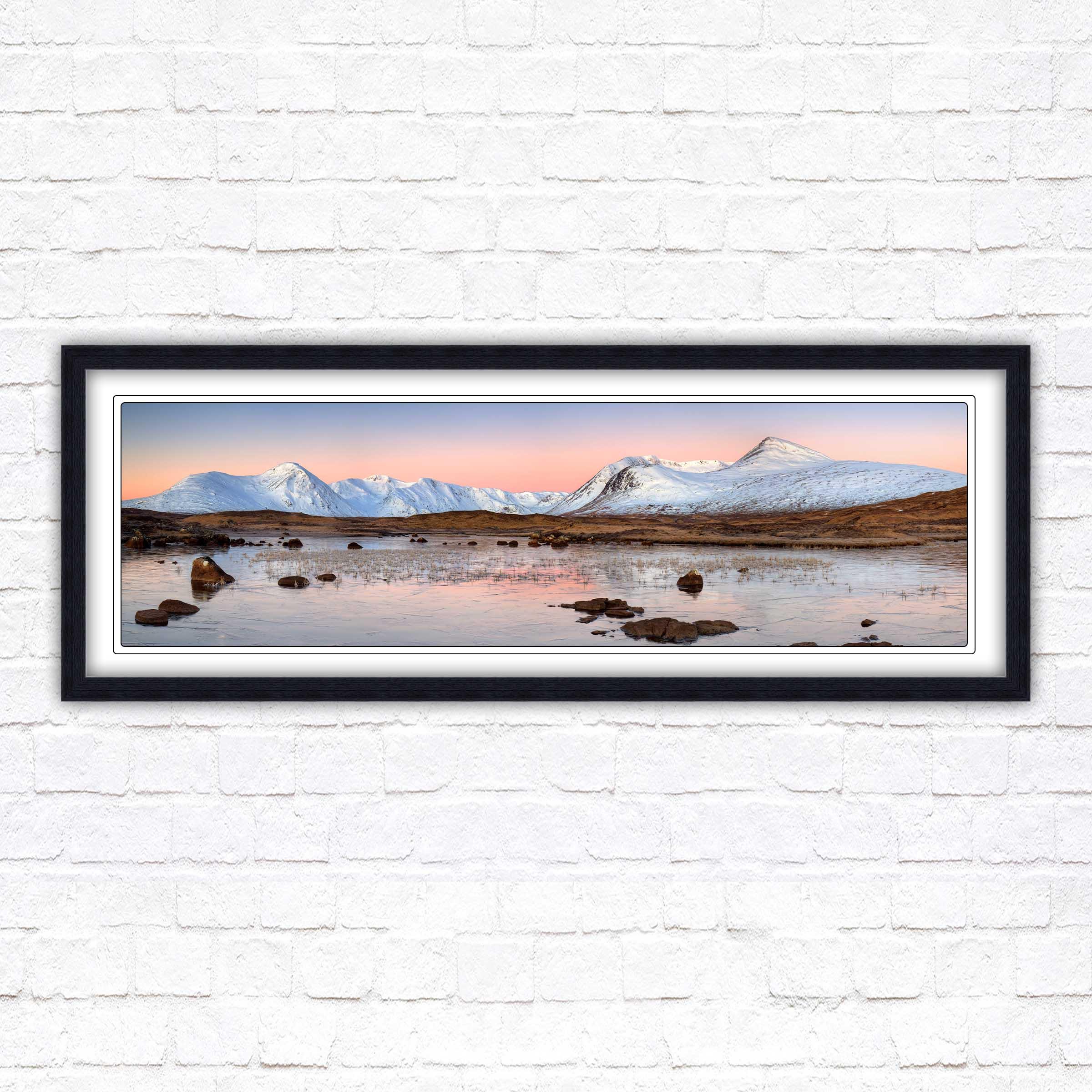 A beautiful panoramic framed picture of Rannoch Moor, Scotland. Sunrise over the lake and mountains. A choice of frames available. Beautiful gift. Birthday, Mothers Day.