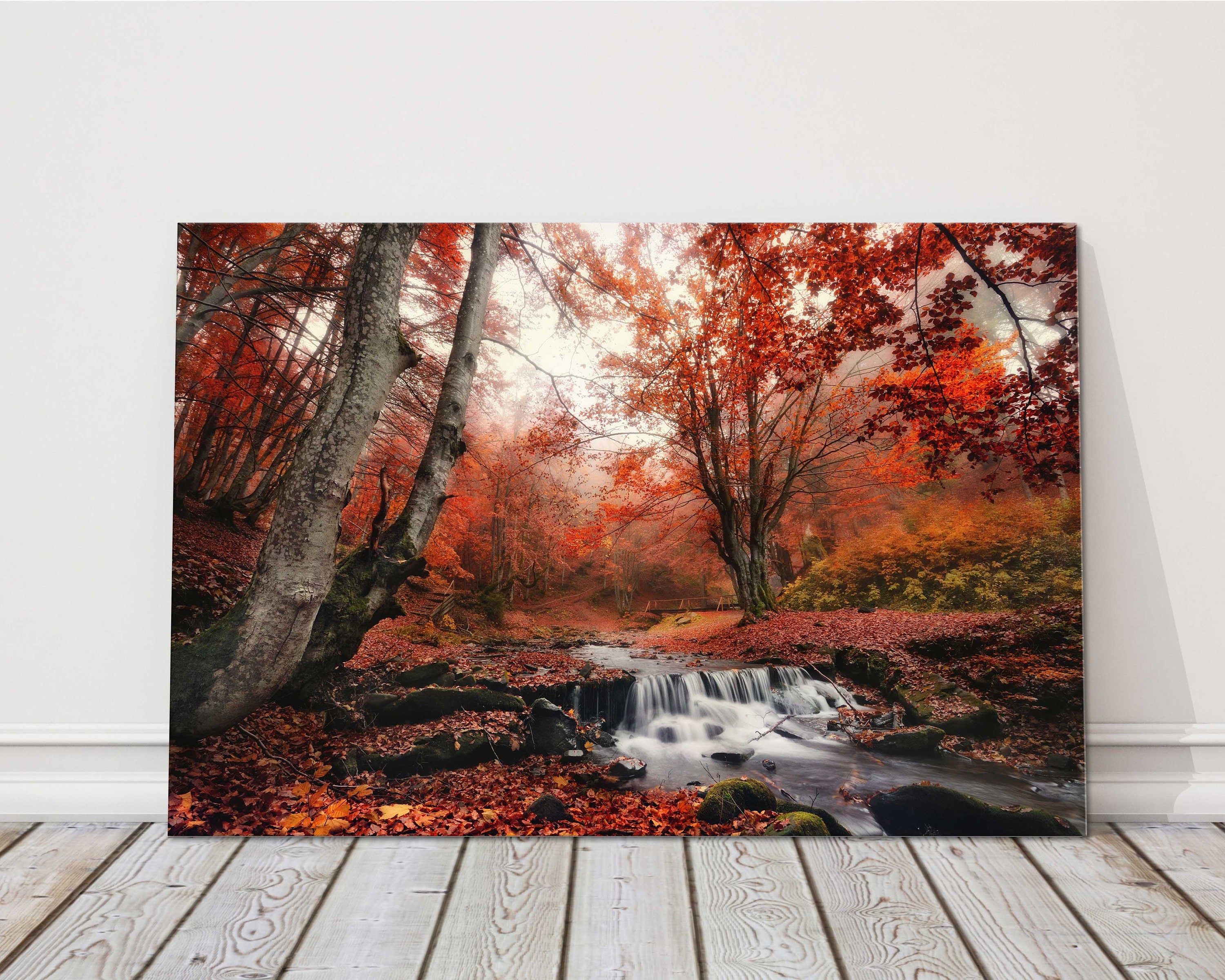 Autumn forest landscape featuring flowing creek and small bridge. Printed as a canvas picture print. Autumn scene. Available in a... Read more