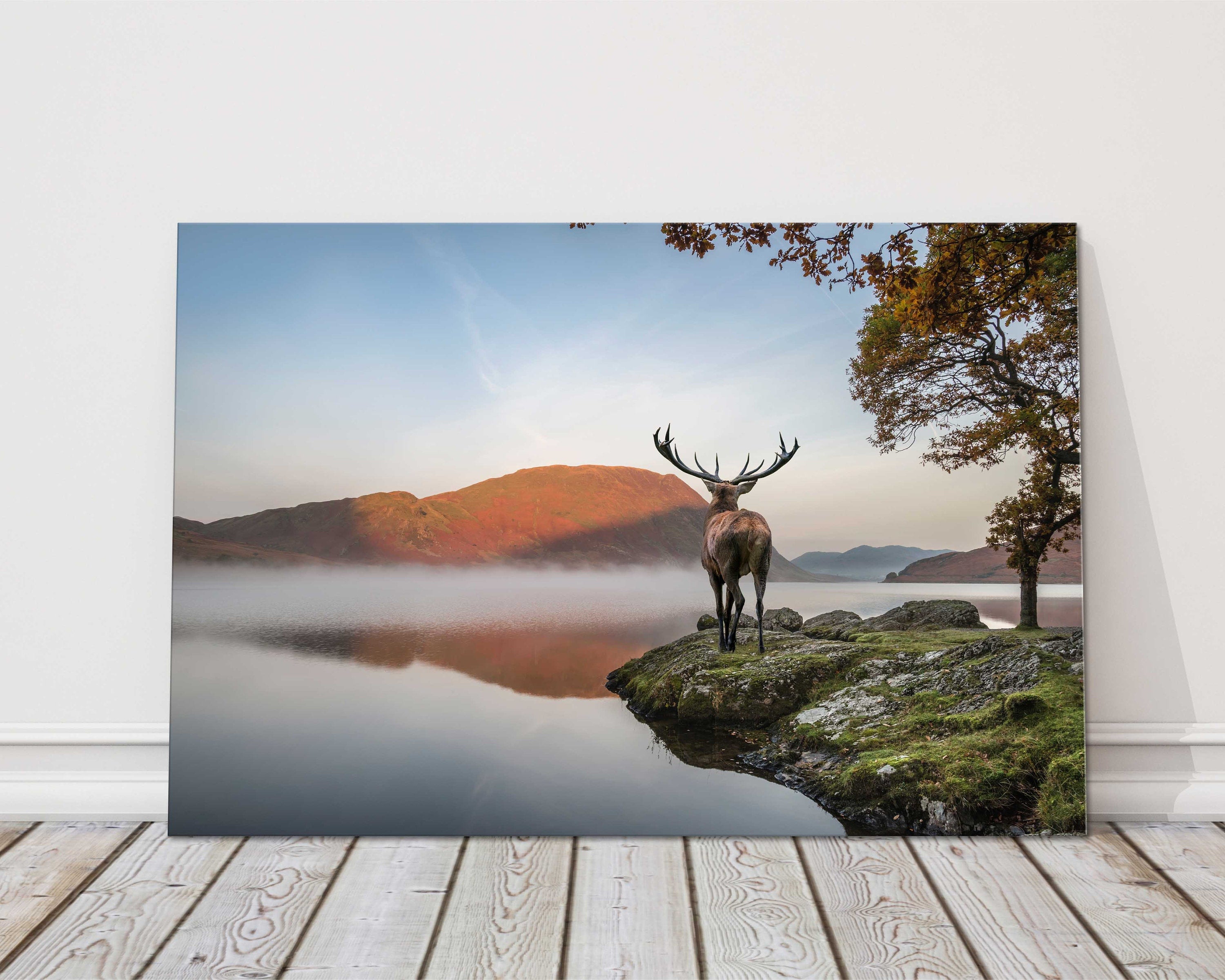 Red Deer stag looking over lake and mountain landscape. Printed canvas picture