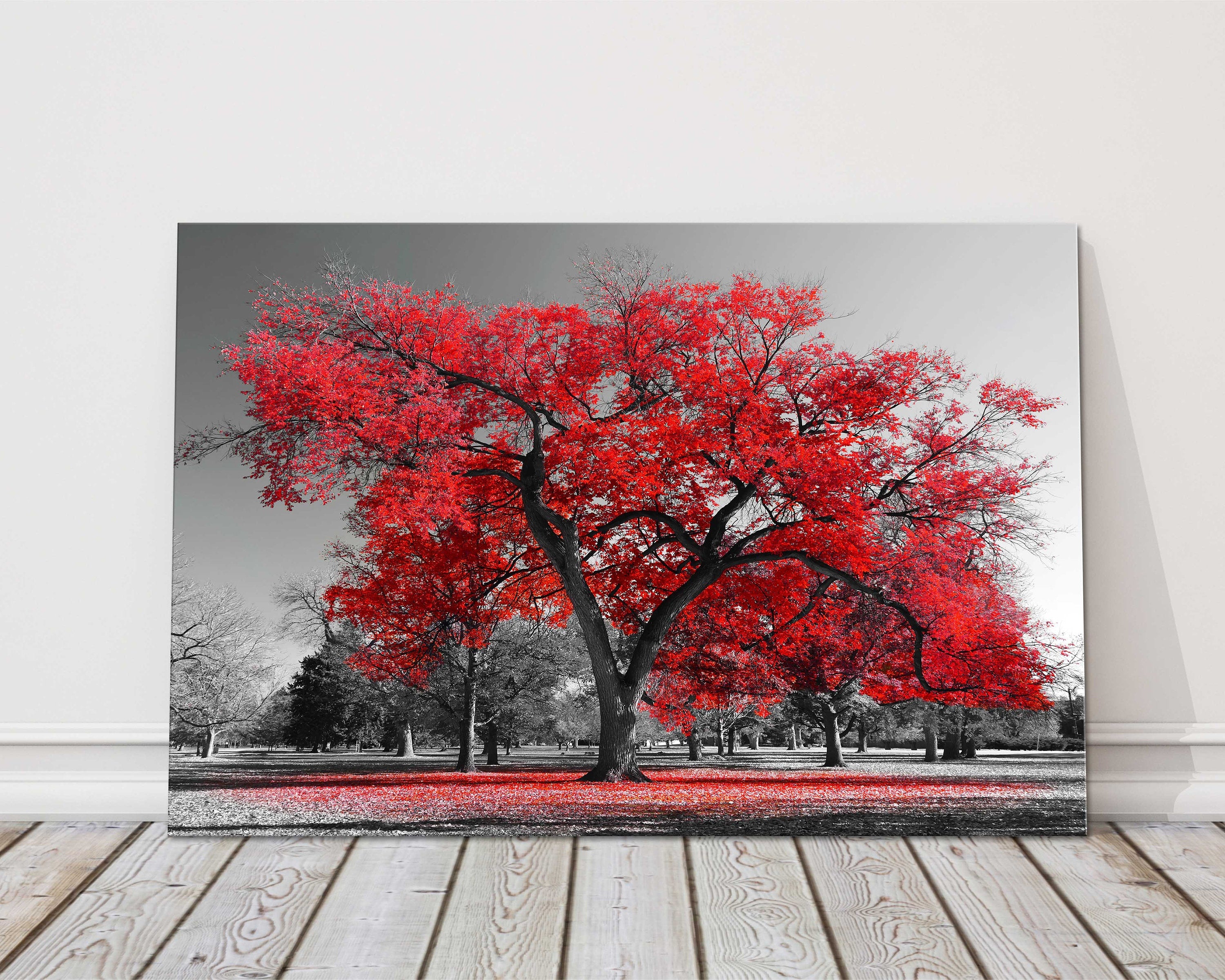 Red leaf tree, standing in a black and white background. Beautiful landscape scene. Printed as a canvas picture print. Autumn... Read more