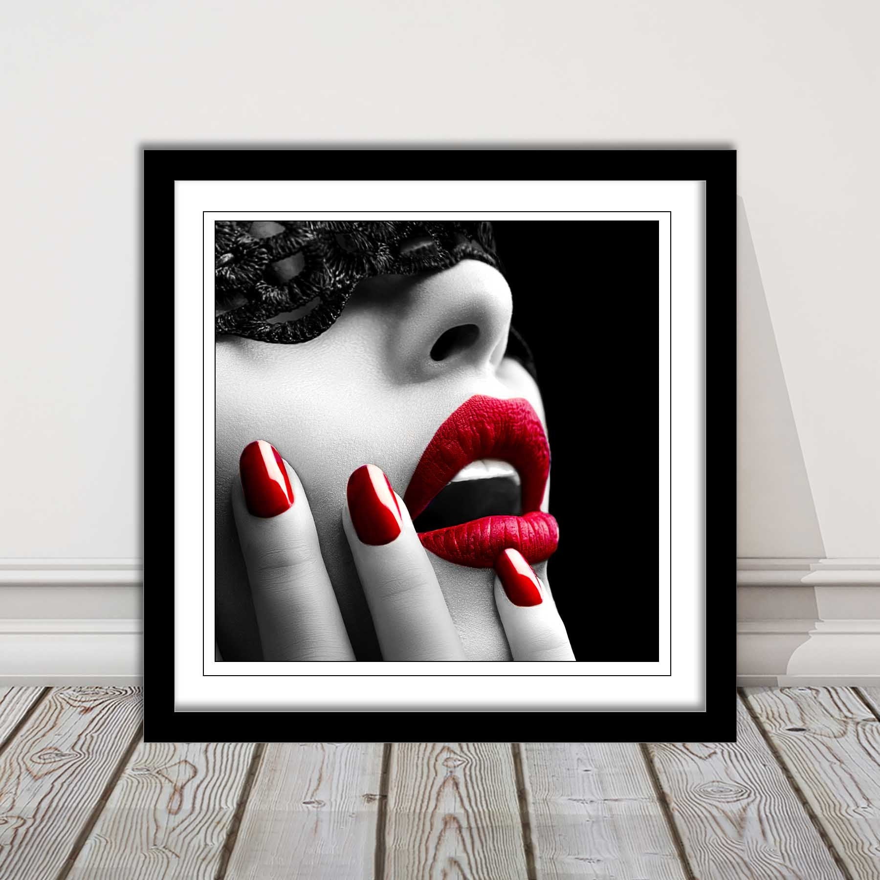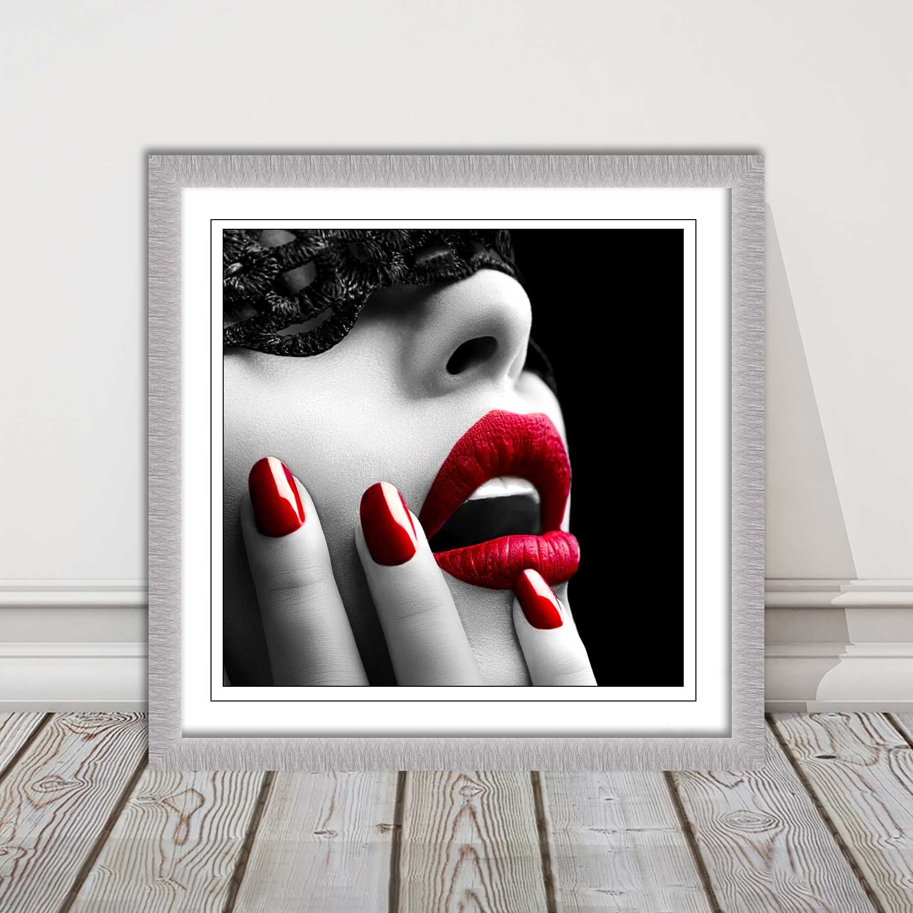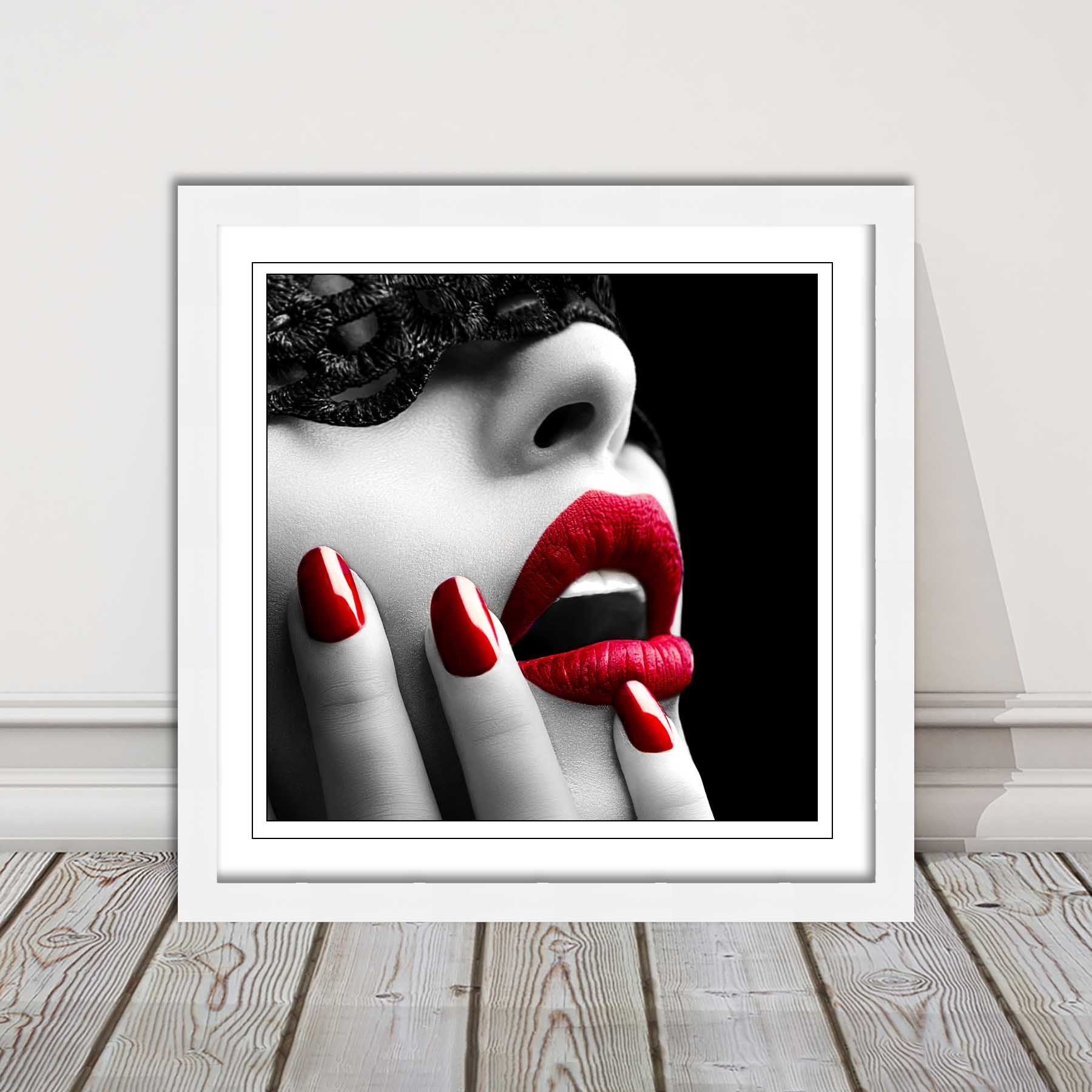 Framed picture print. Red lips, nails. Choose from a choice of frame styles and sizes. Square frame.