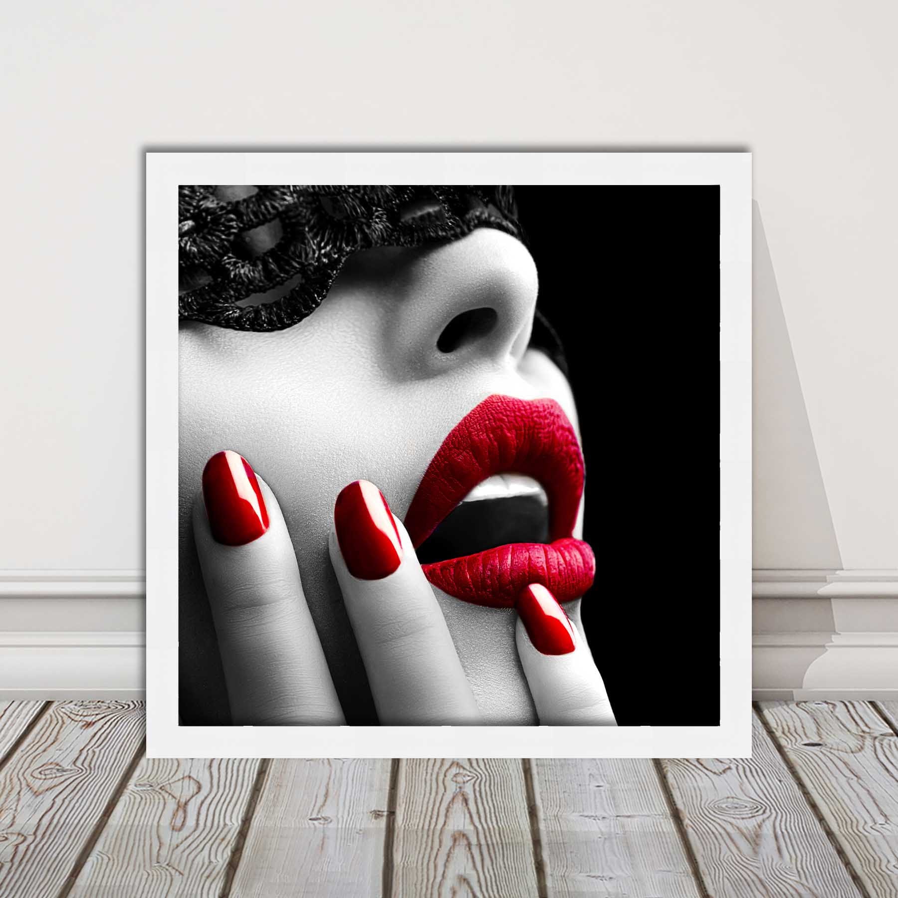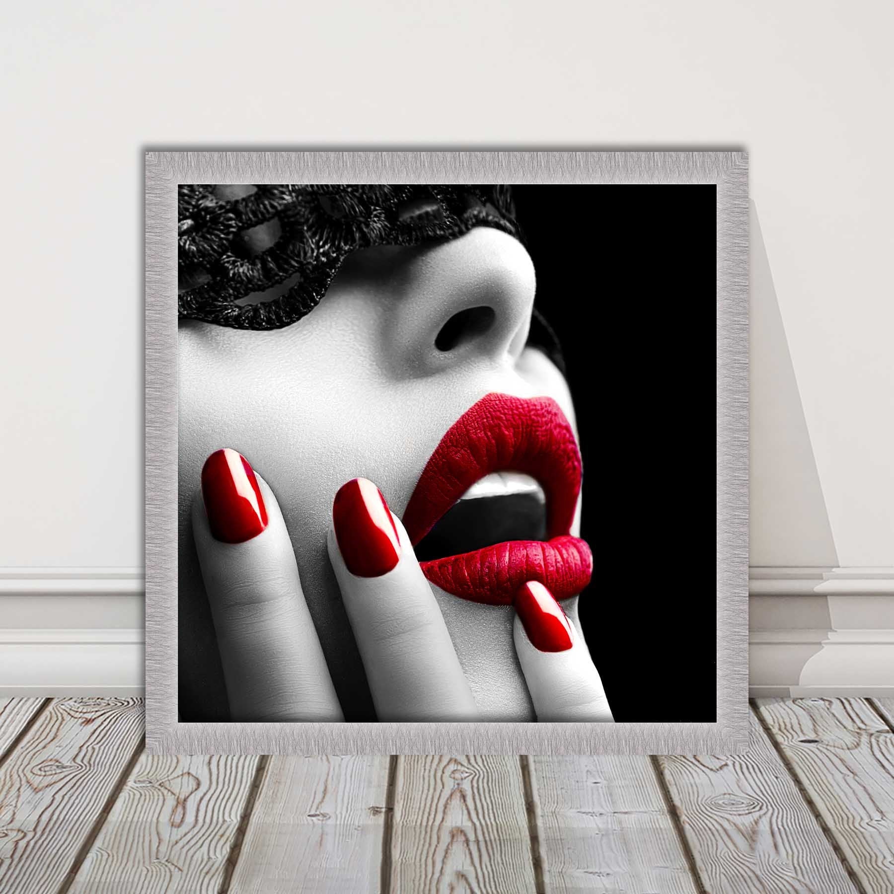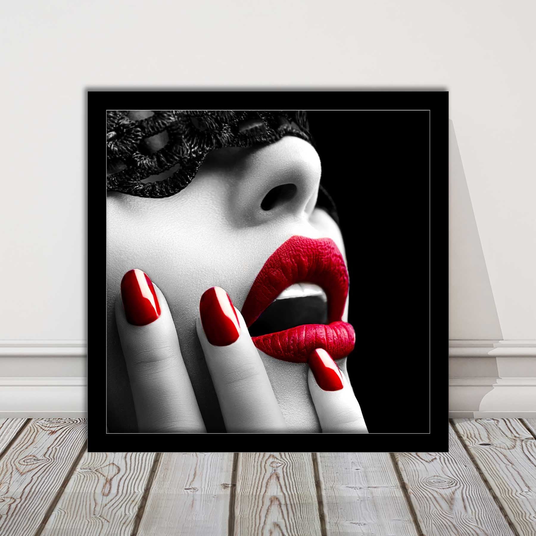 Framed picture print. Red lips, nails. Choose from a choice of frame styles and sizes. Square frame.