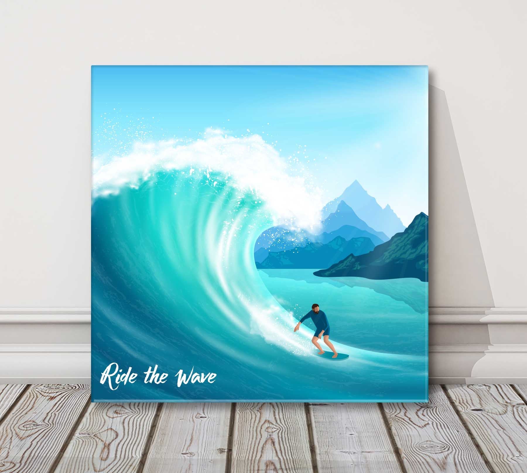 Surfer riding the wave, wall art. Beautiful shades of tropical blue. Printed and framed as a canvas picture print. Available in a choice of sizes.