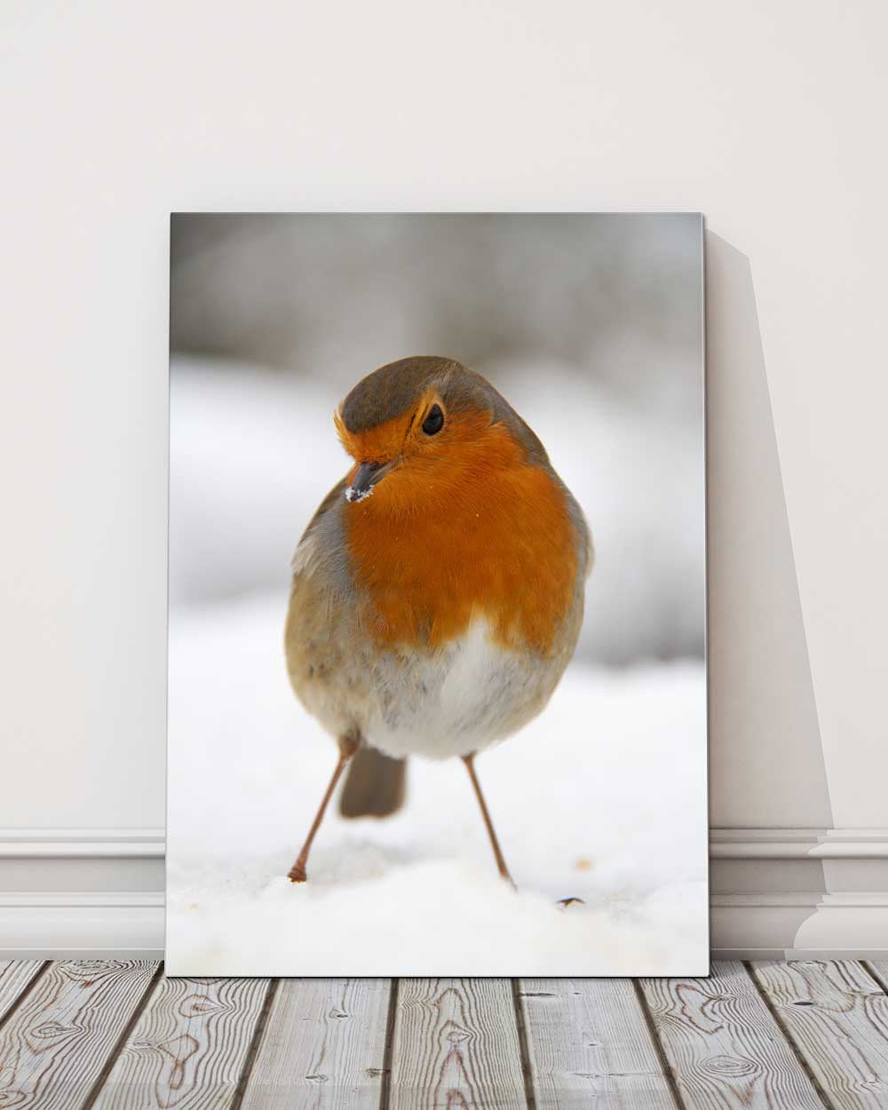 Robin standing in the snow, canvas print. Wildlife image of the Autumn and winter season. Choice of sizes available to... Read more
