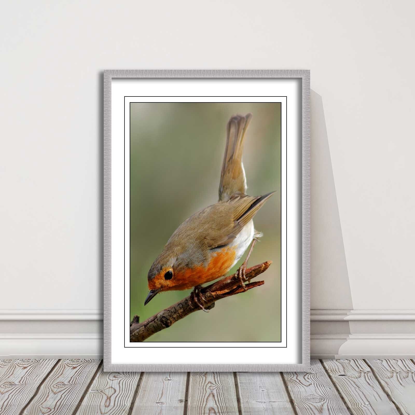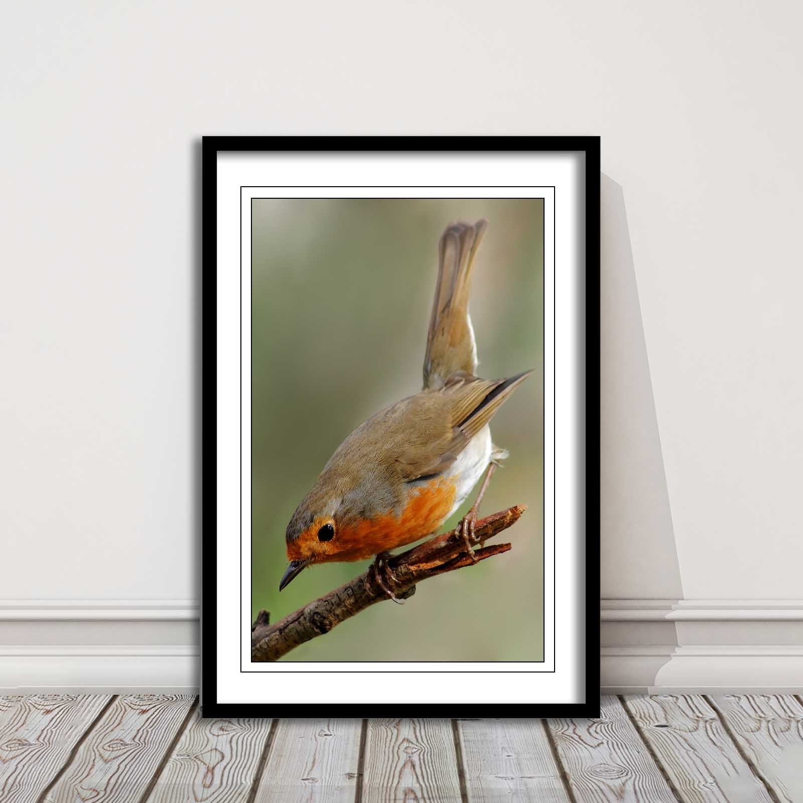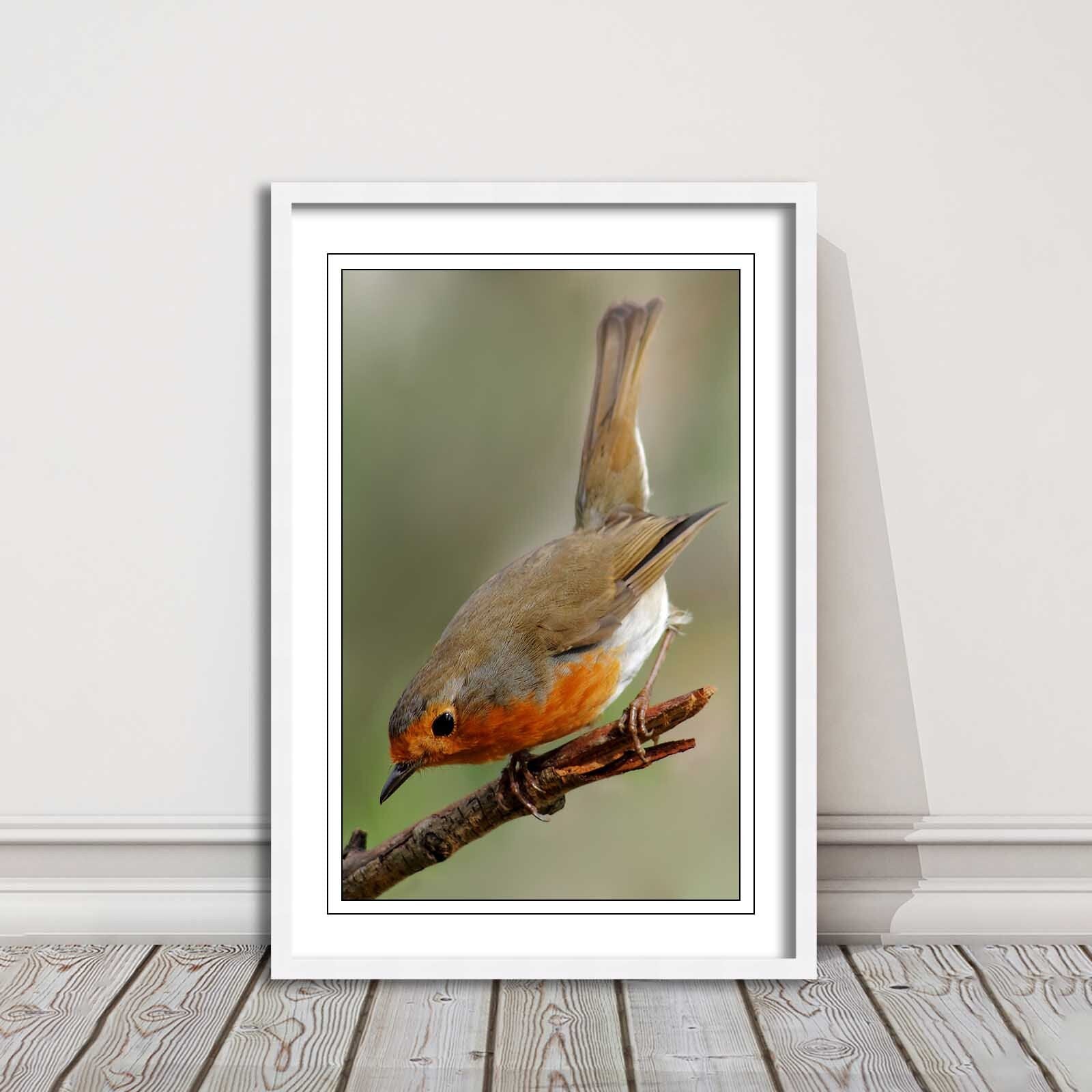 Robin photograph. Printed framed picture. Wildlife image. Birds. A choice of frame styles and borders.