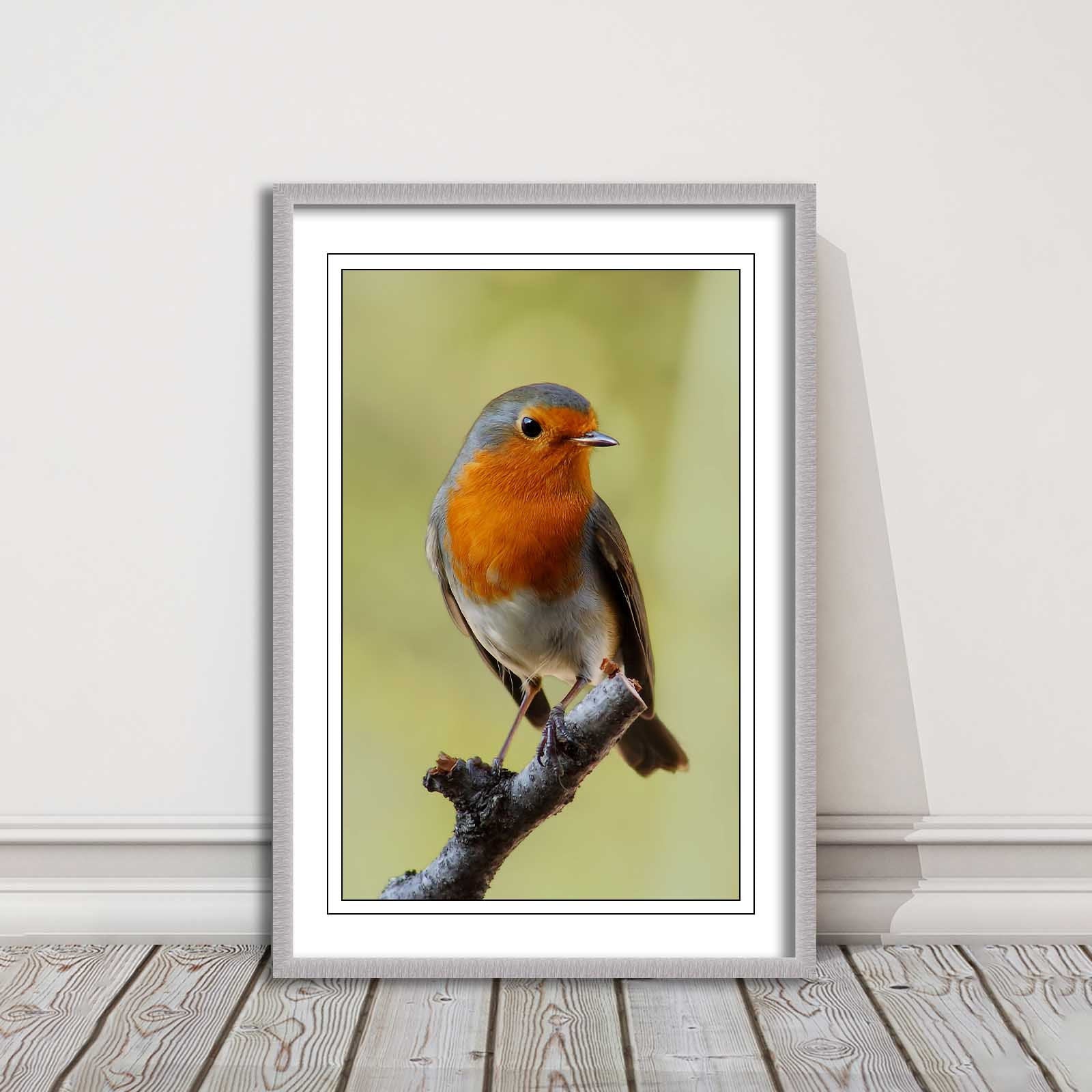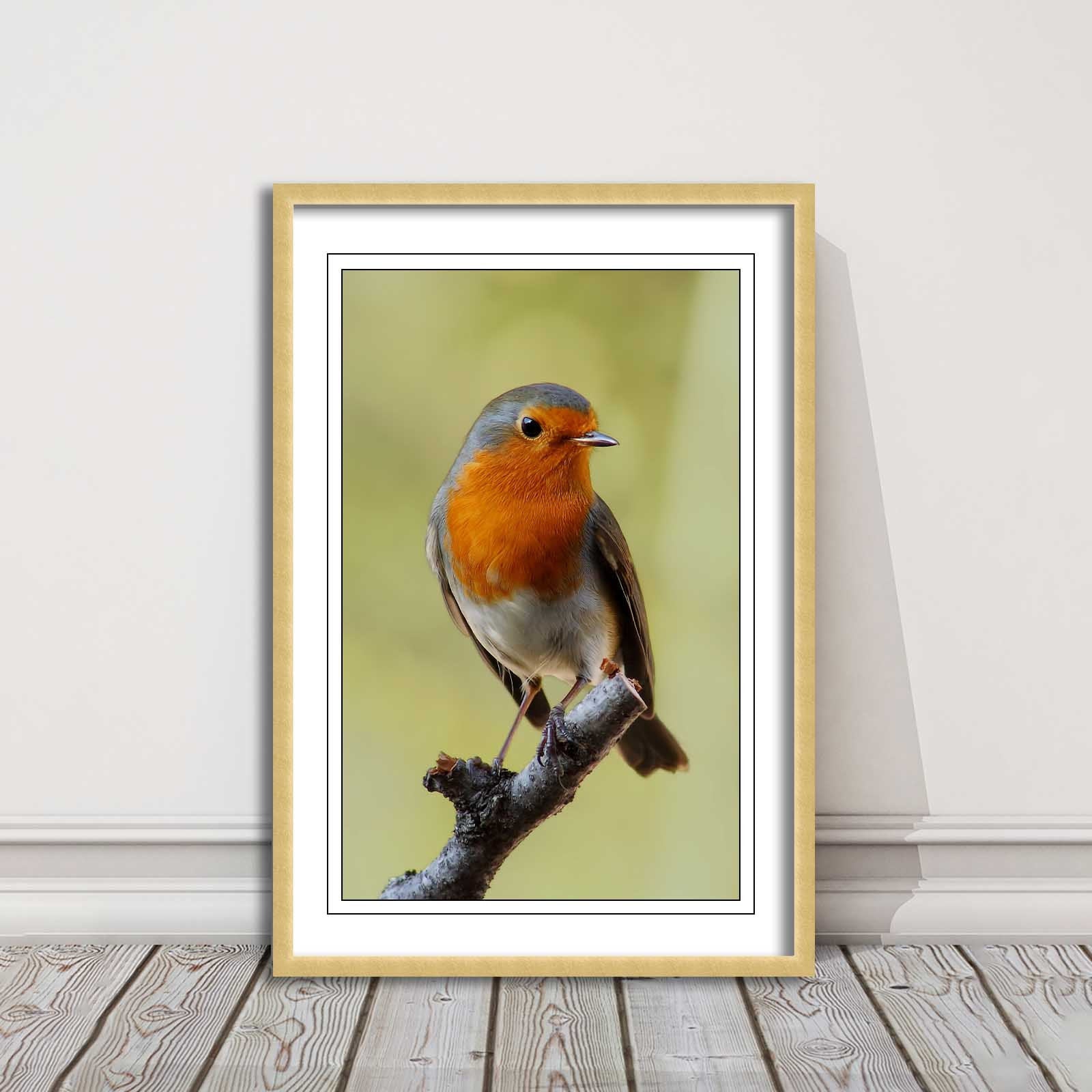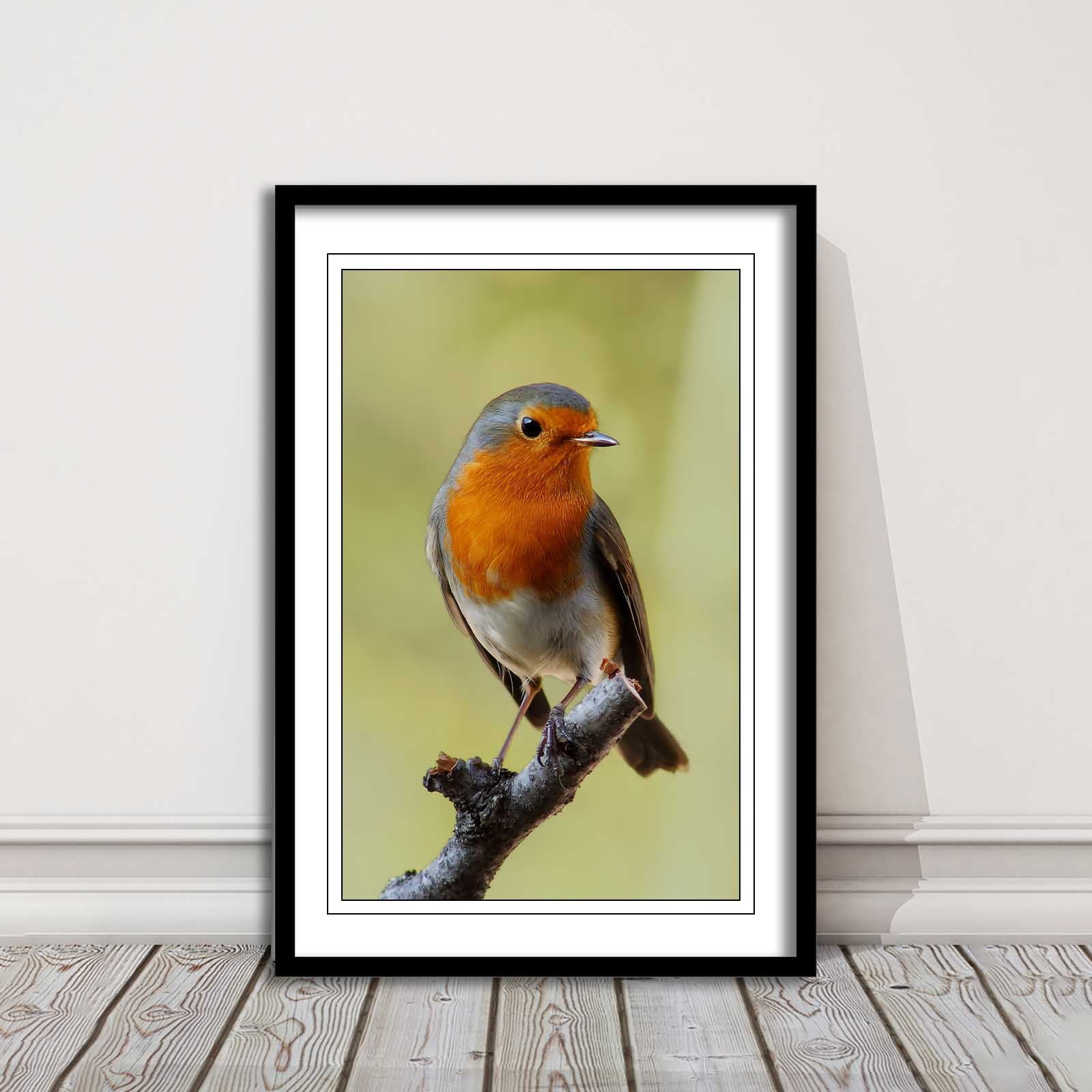 Robin photograph. Printed framed picture. Wildlife image. Birds. A choice of frame styles and borders.