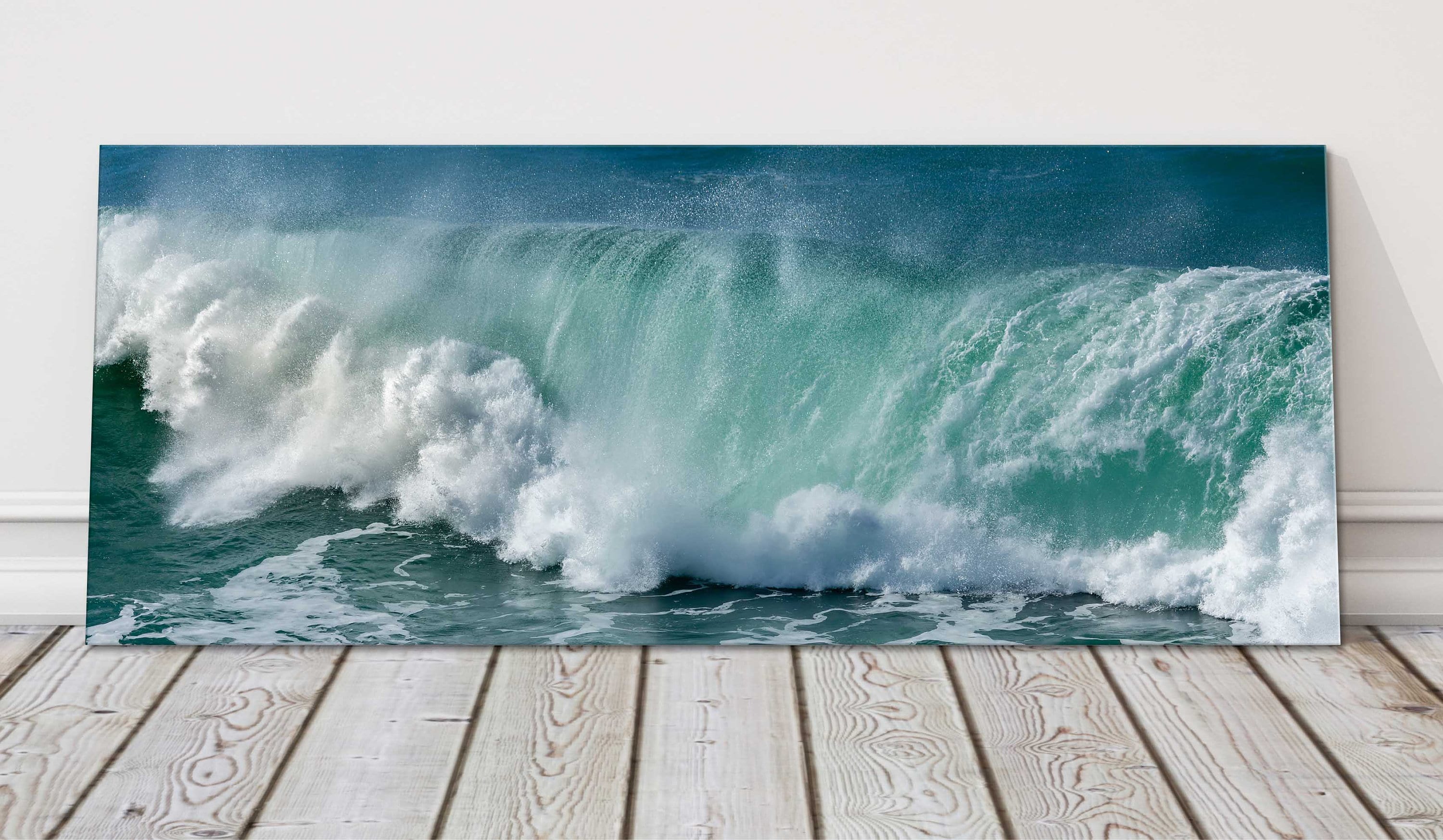 Turquoise and white waves rolling in and crashing along the coast of Fistral Beach, North Cornwall. Surfers beach. Stunning seascape.