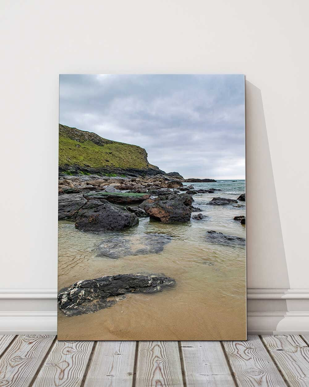 Rugged Cornish coastline. Canvas picture print portrait rock sand and sea