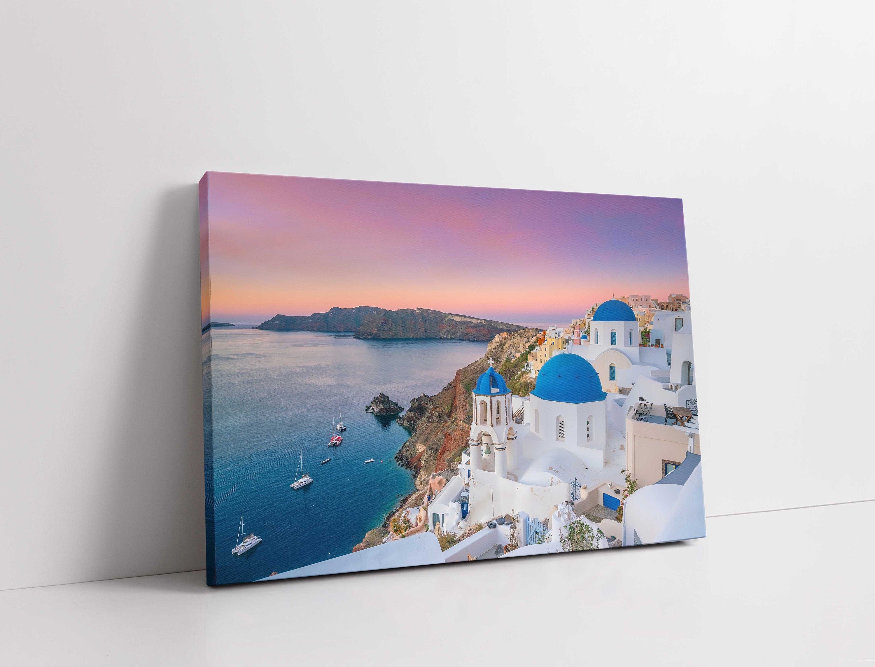 Santorini, Greece. View of Oia village at sunset with the blue domes of St Stephanos church. Picture printed and framed... Read more