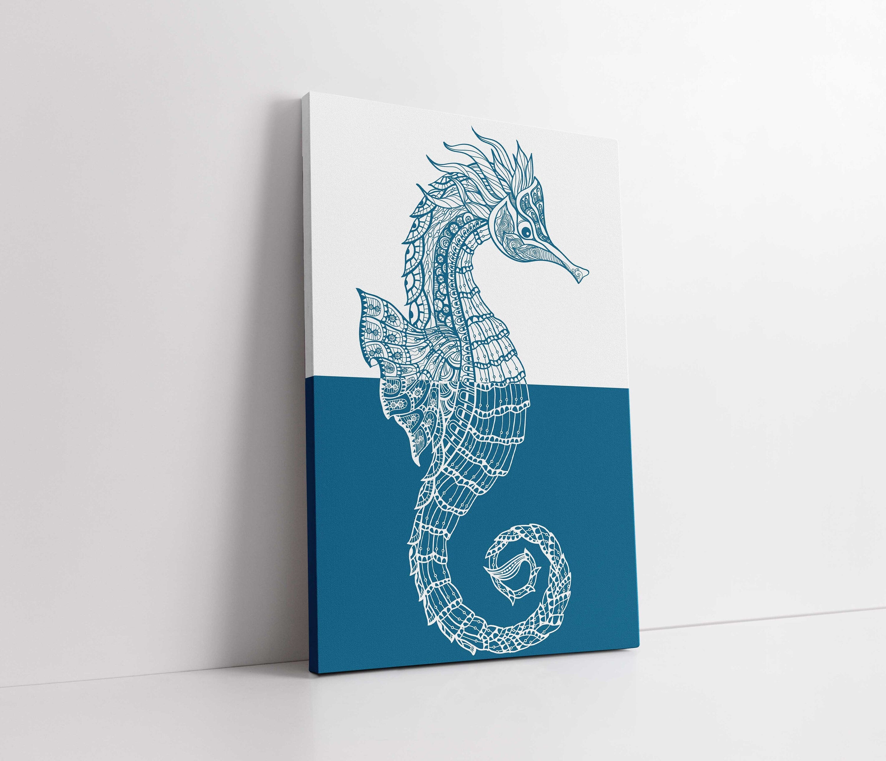 Seahorse in pattern form on a two toned background. Any colour combination available to match decor. Printed and framed as a canvas picture print. Nautical themed. Choice of sizes available to order.
