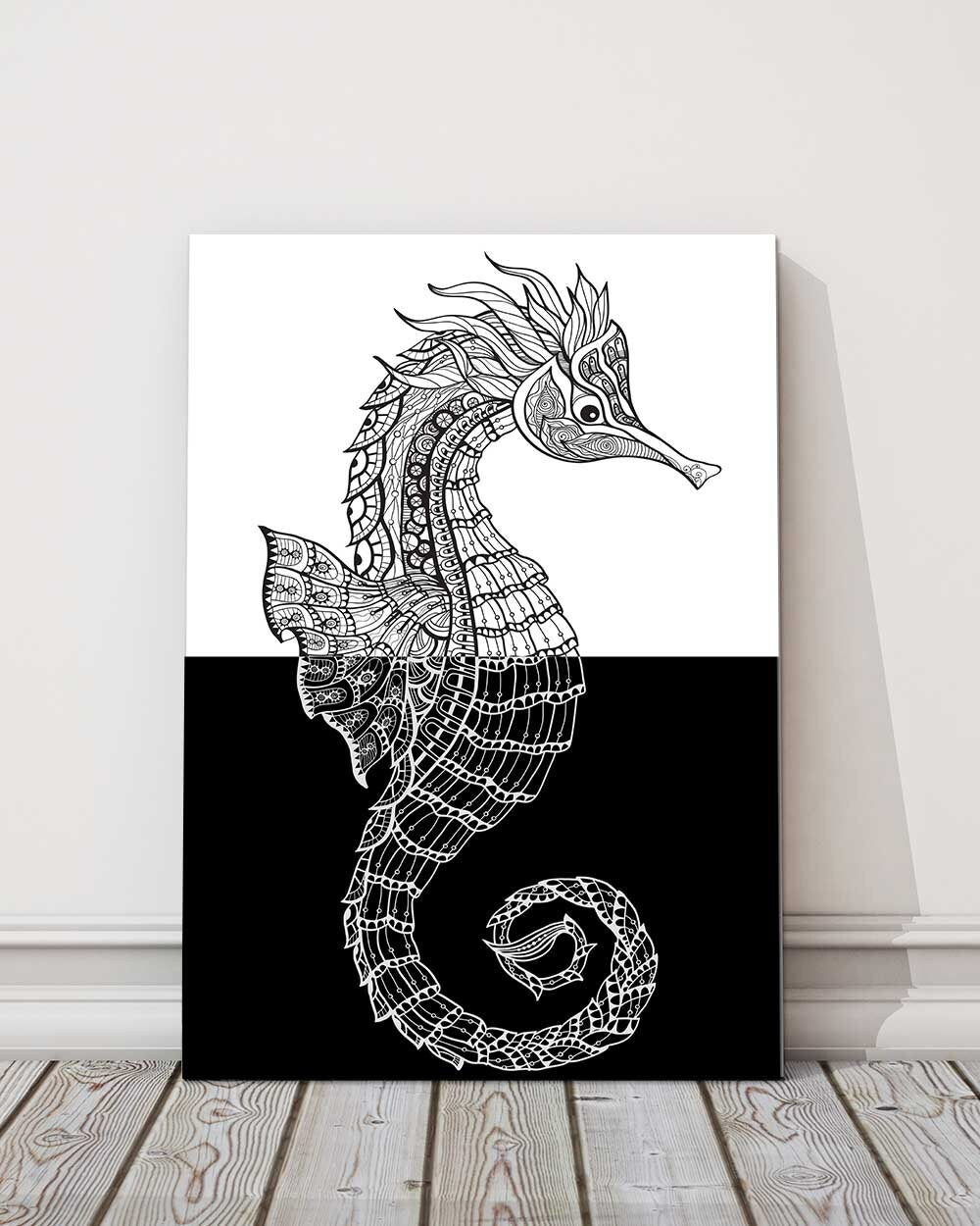 Seahorse in pattern form on a two toned background. Black and white image. Printed and framed as a canvas picture print. Nautical themed. Choice of sizes available to order.
