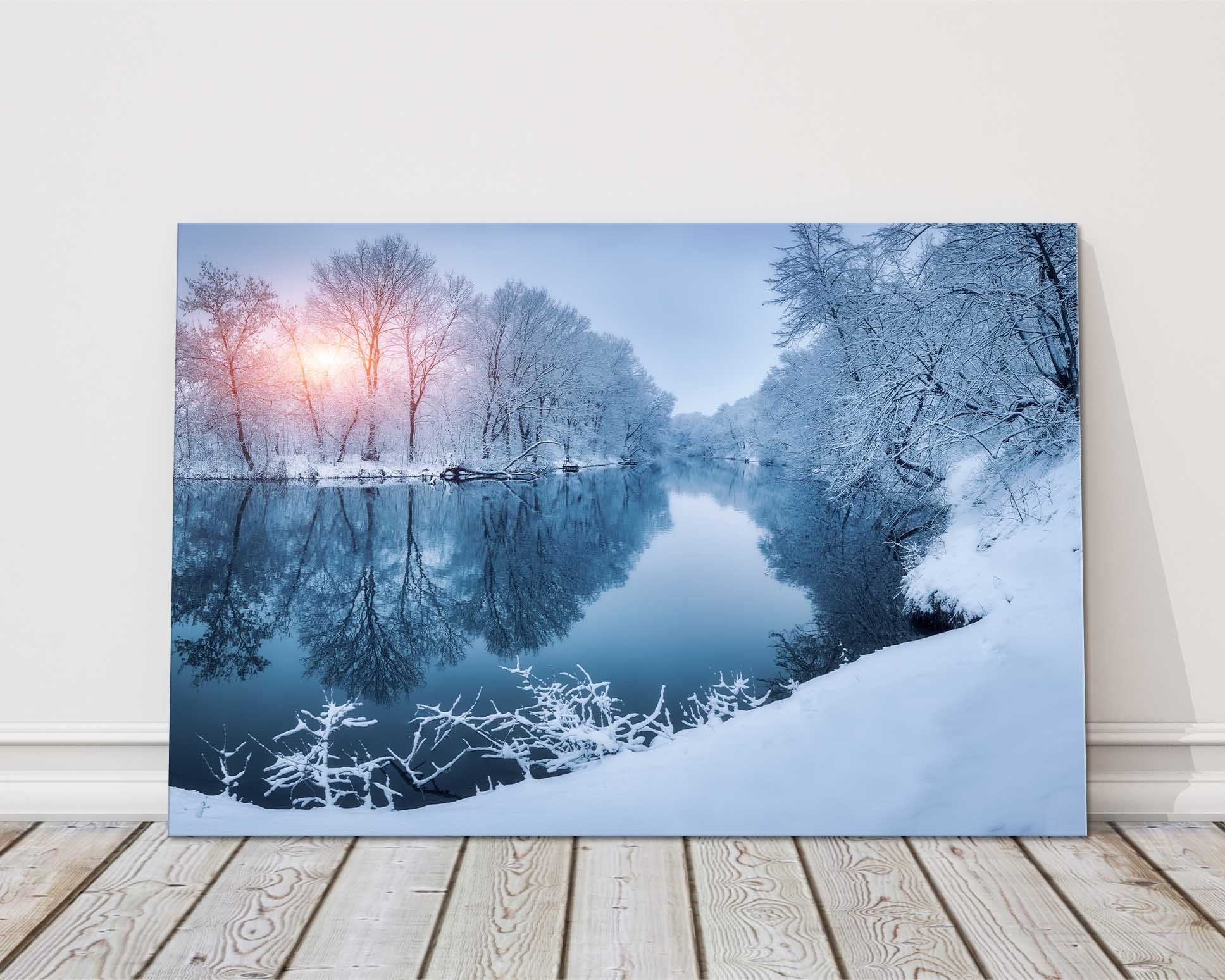 Snowy Winter scene frosty trees and sunset canvas picture print frozen lake