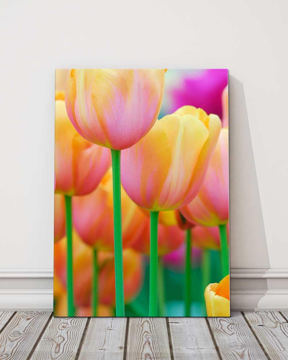 Tulips in bloom. Springtime flowers. Printed and framed as a canvas picture print. A range of sizes available. Colourful floral wall art for the home. Ideal as a gift.