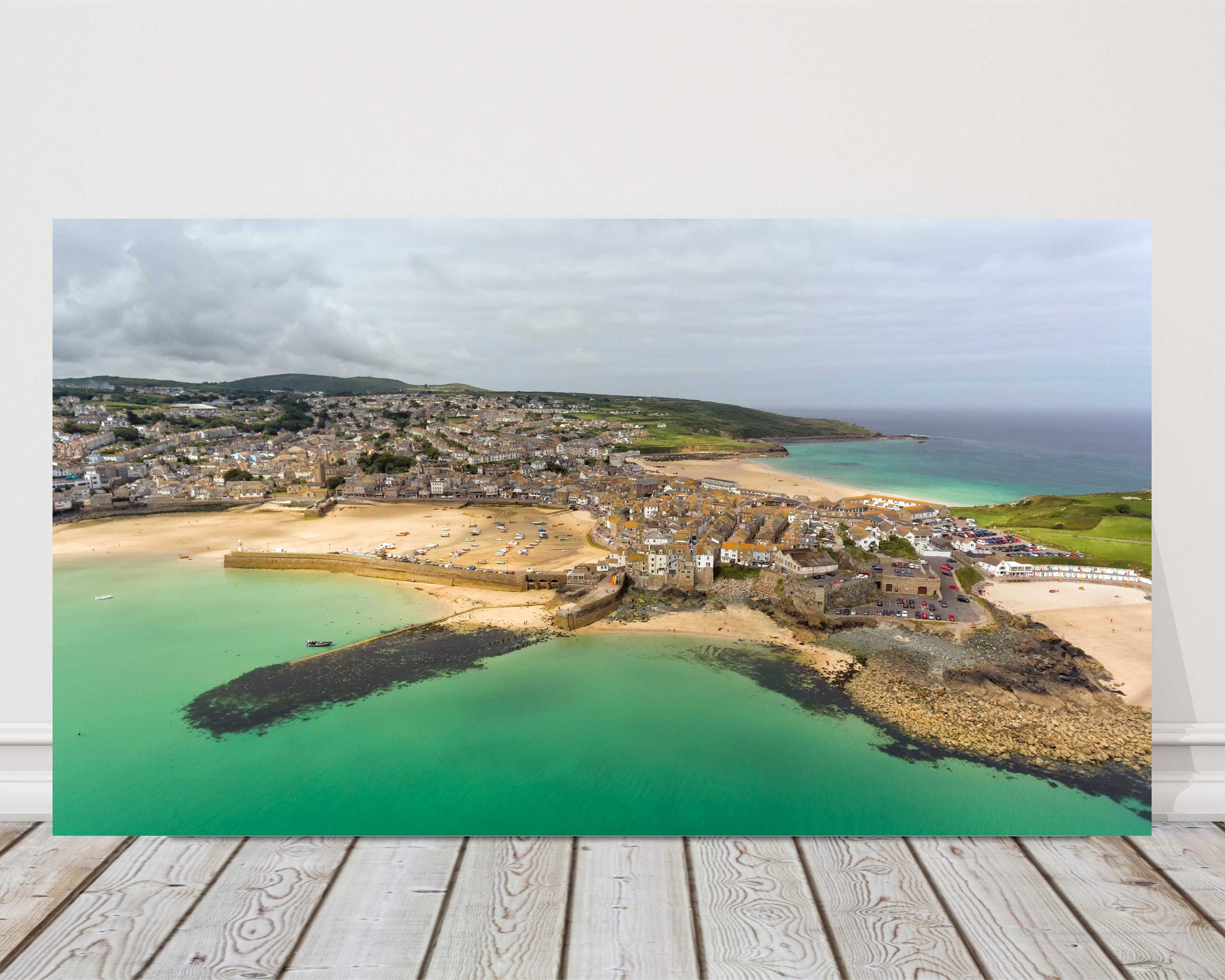 St Ives Harbour, Cornwall. Air view over town, sandy beach Canvas picture print.