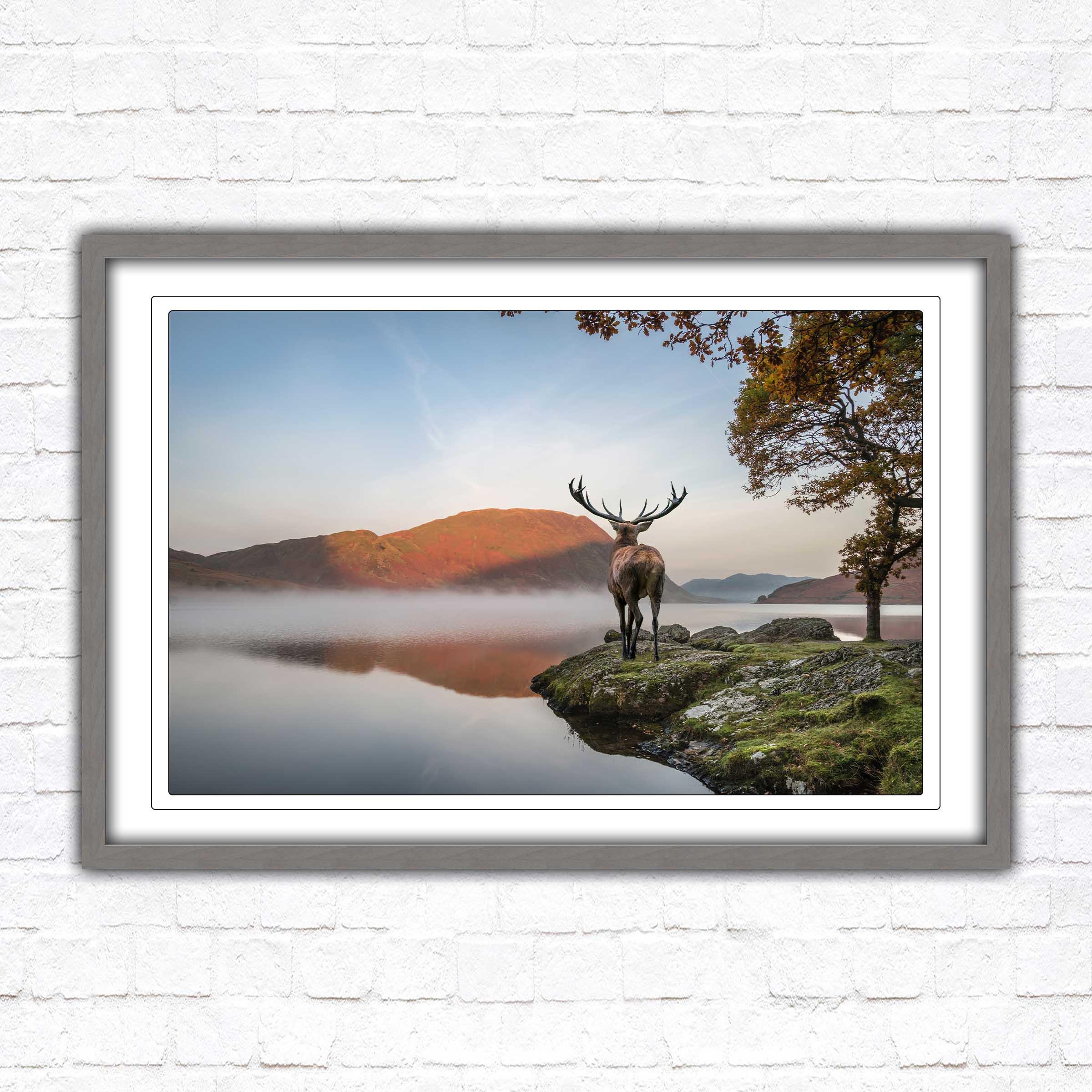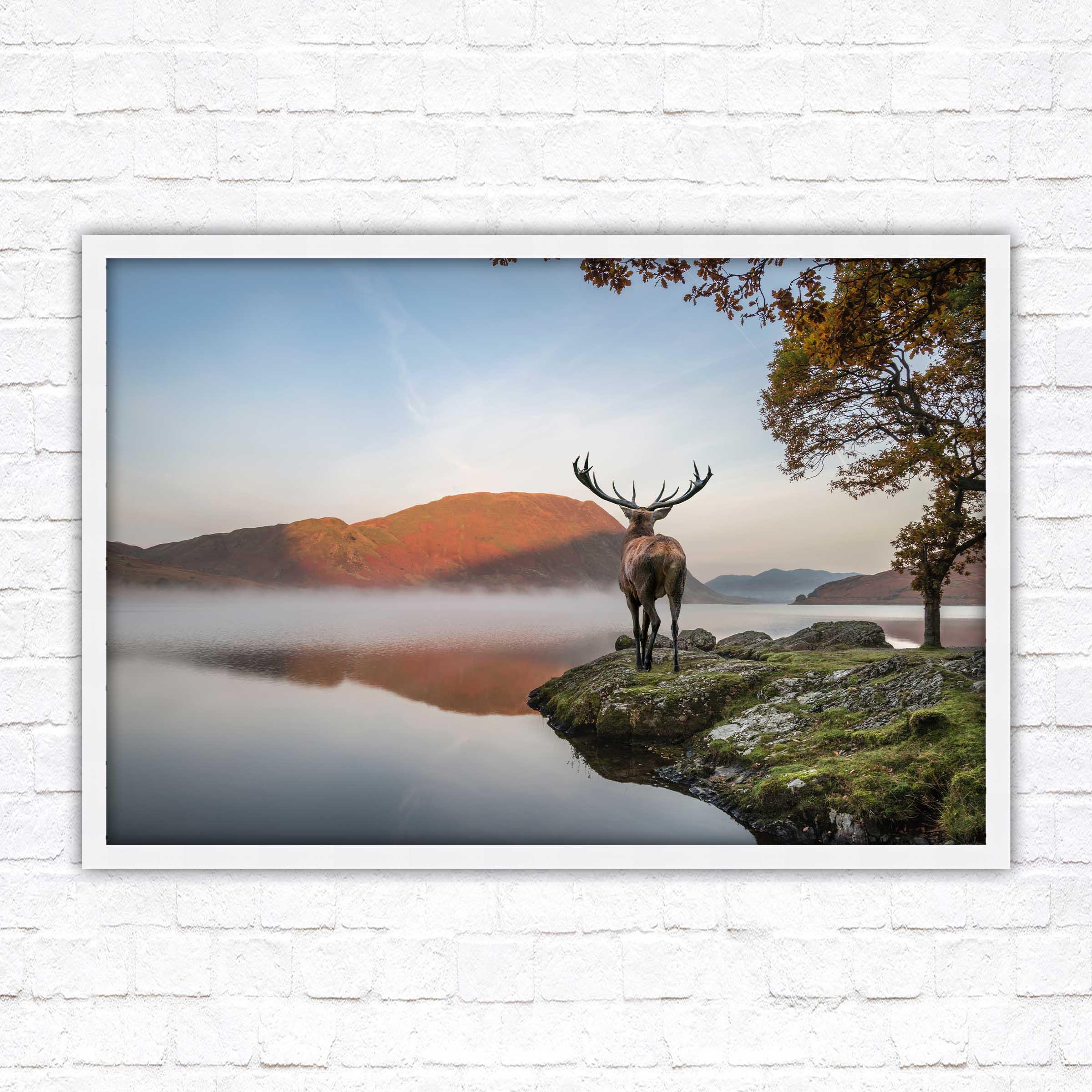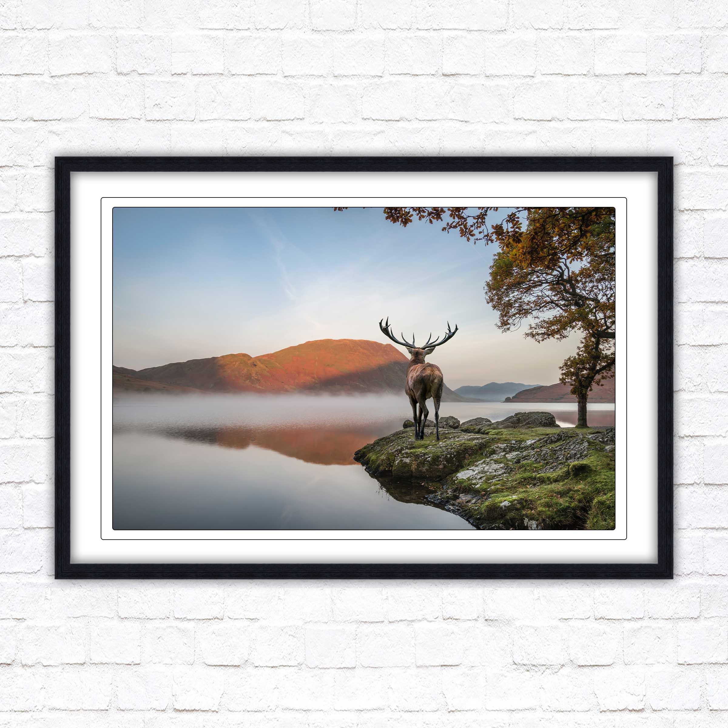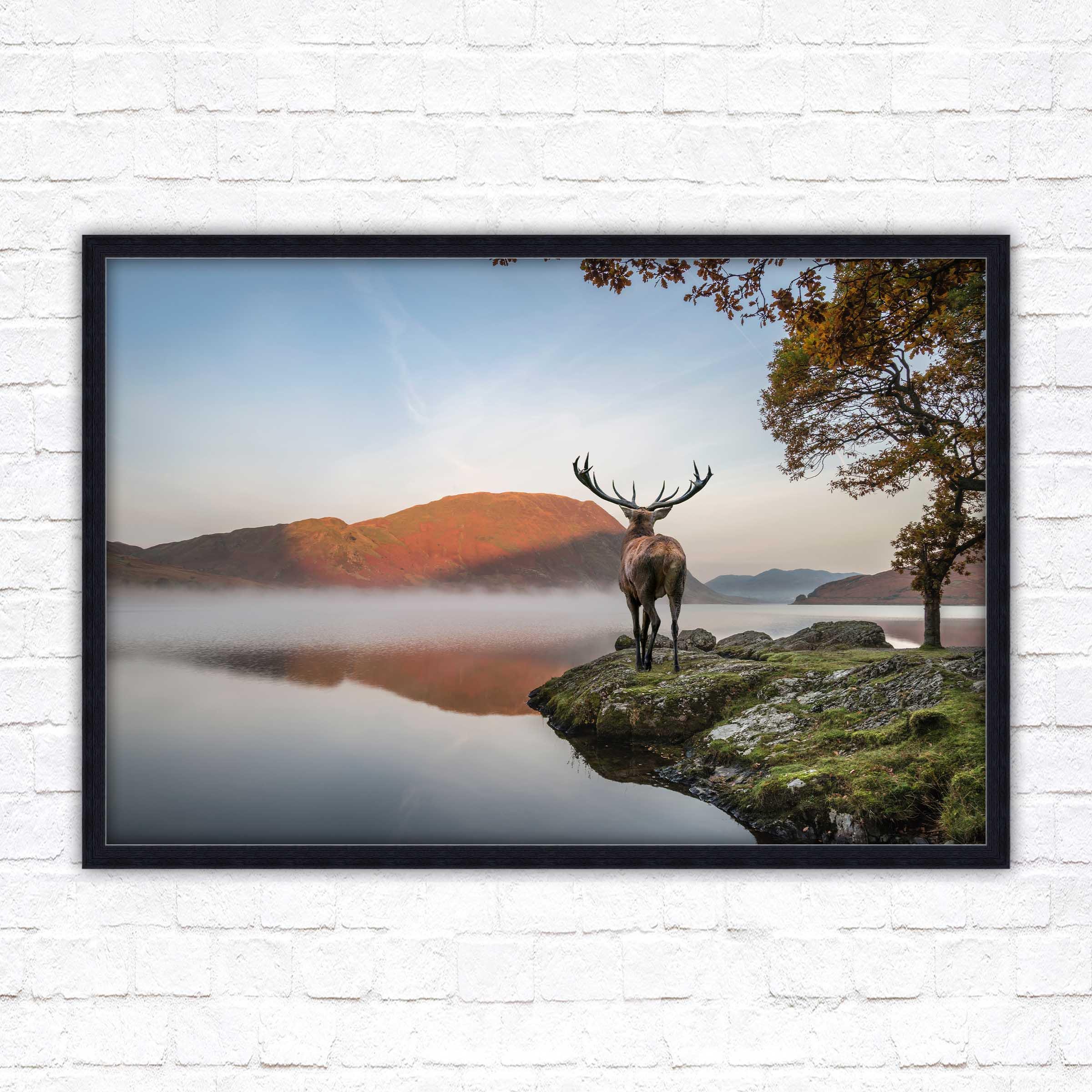 A beautiful framed picture of a Stag by the lake, scenic nature image. A choice of frame styles and borders.