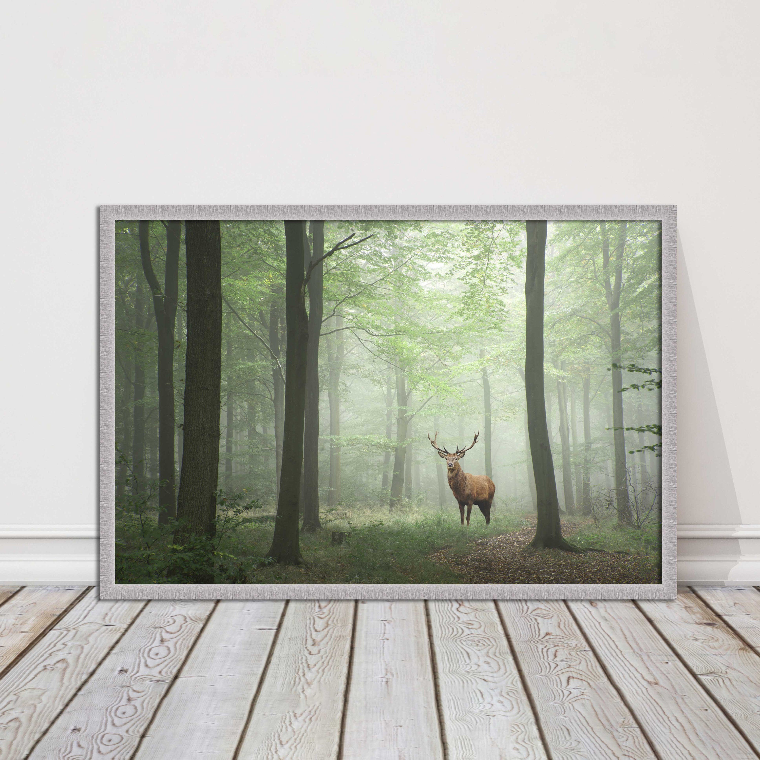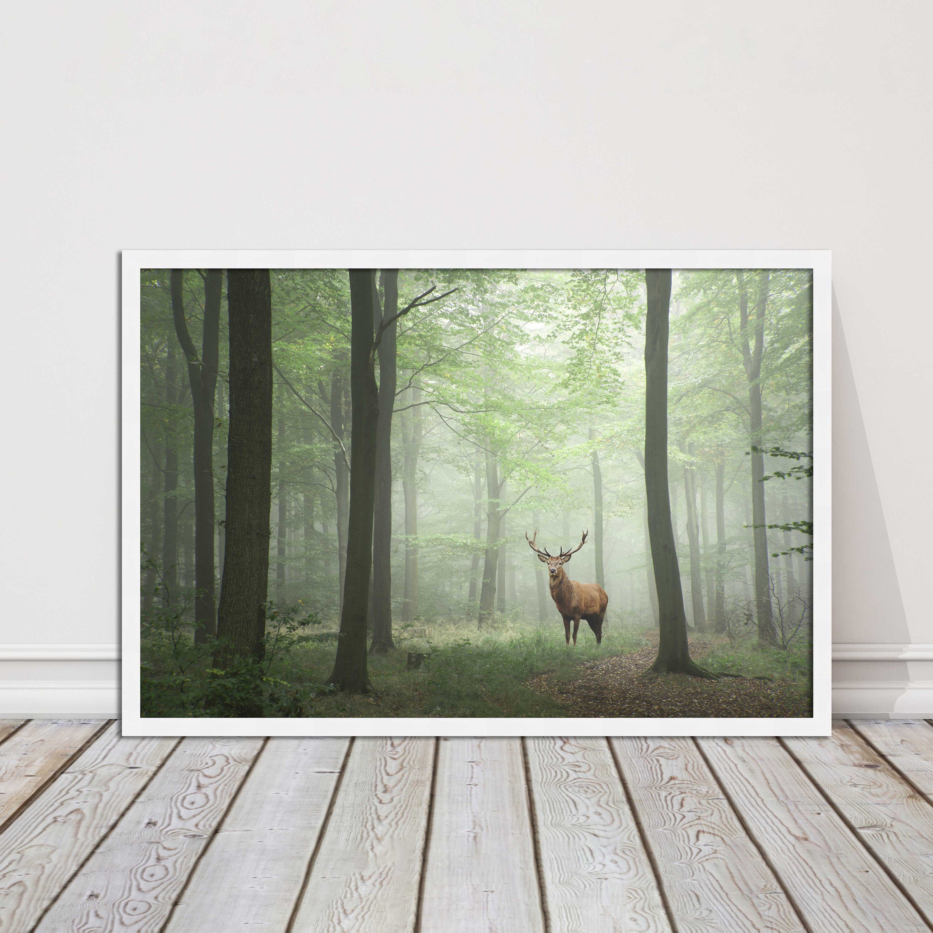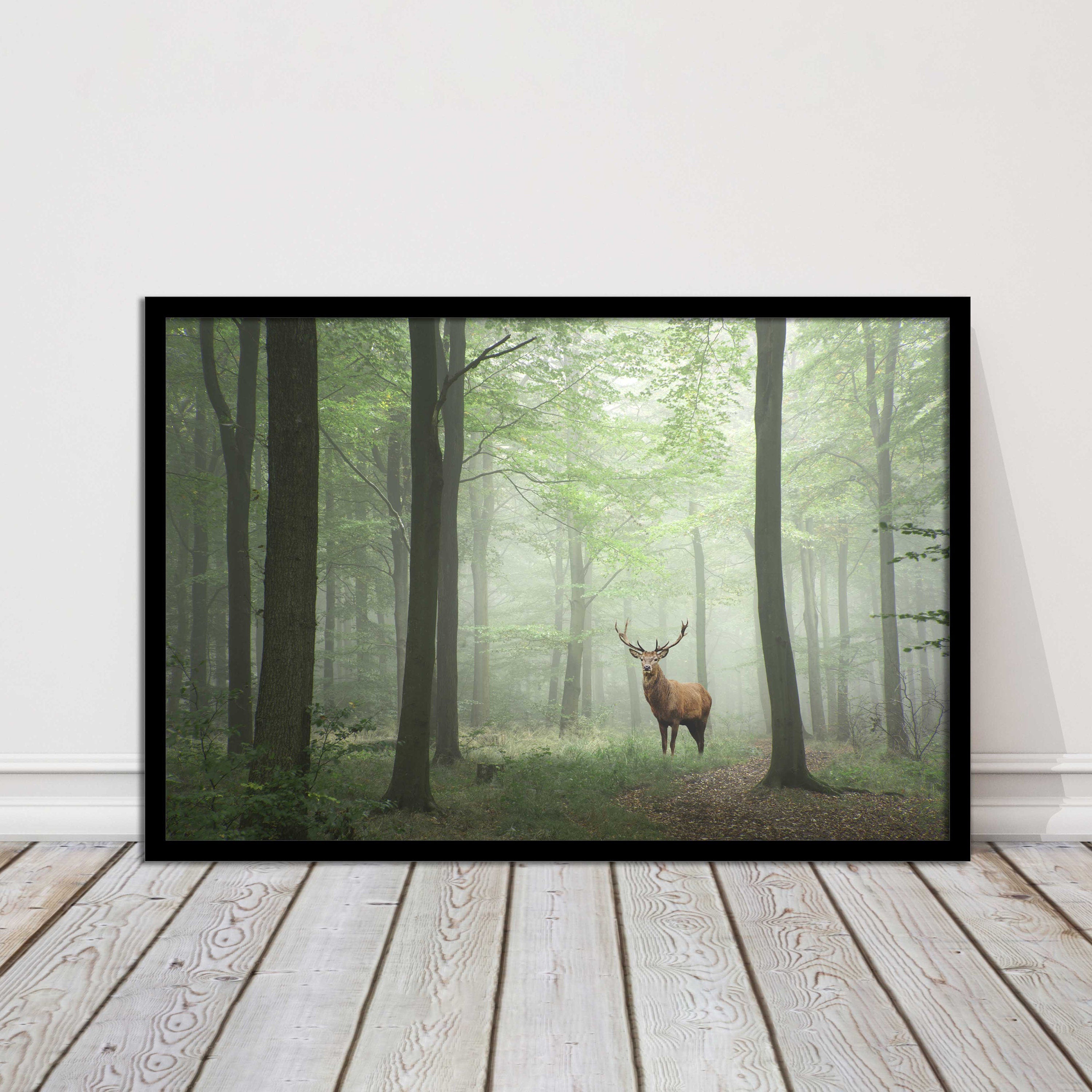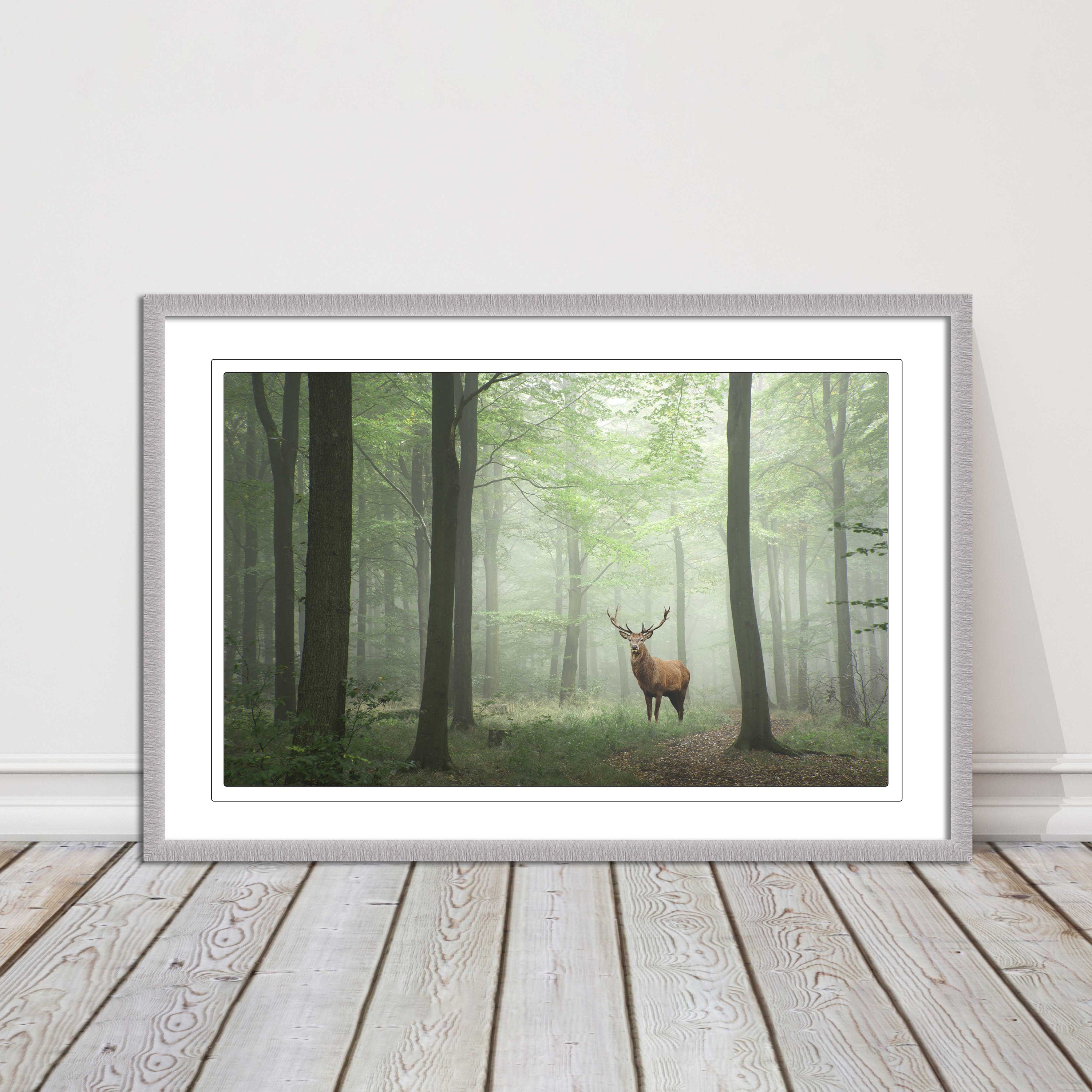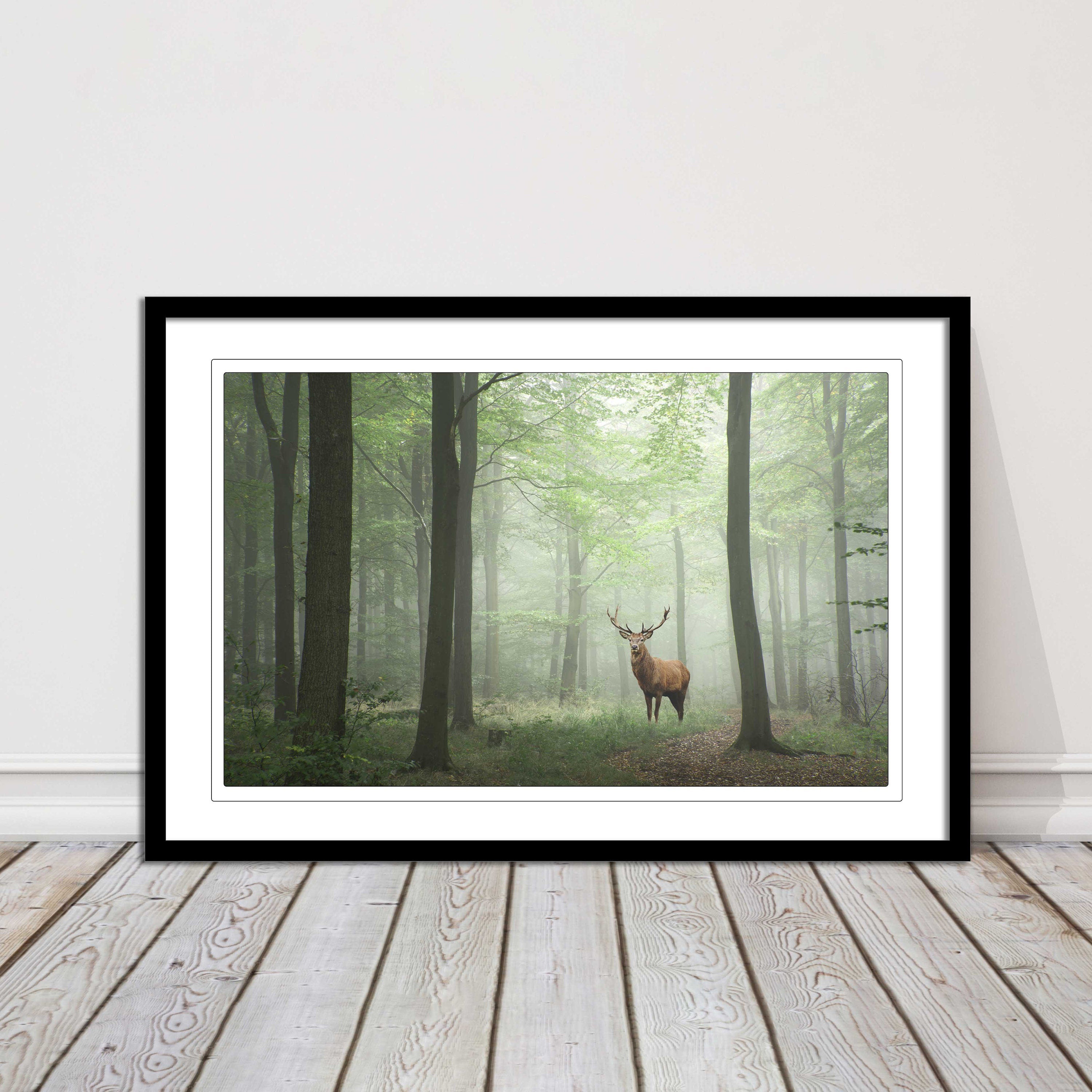 A beautiful framed picture of a Stag in a misty forest sunset. A choice of frame styles and borders.