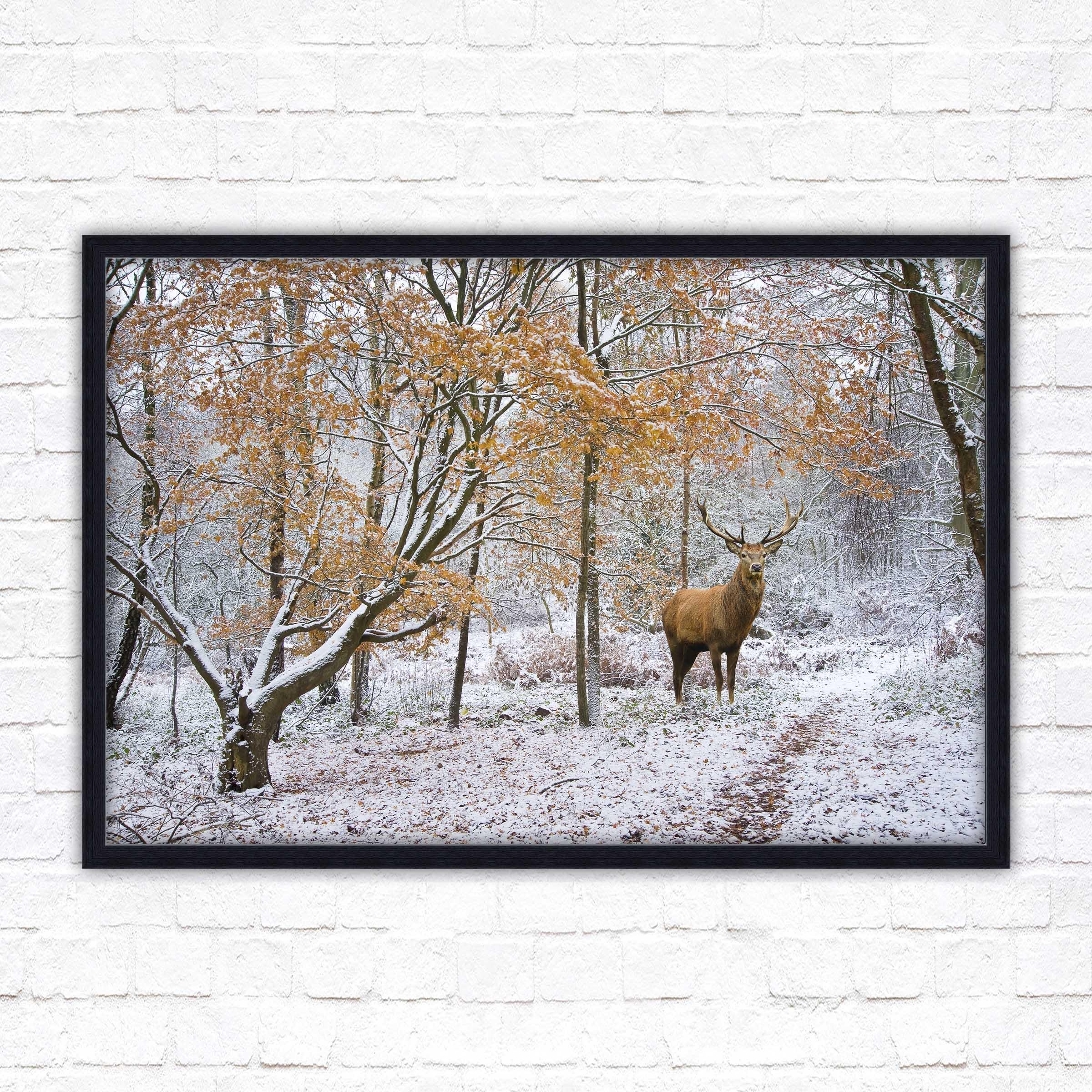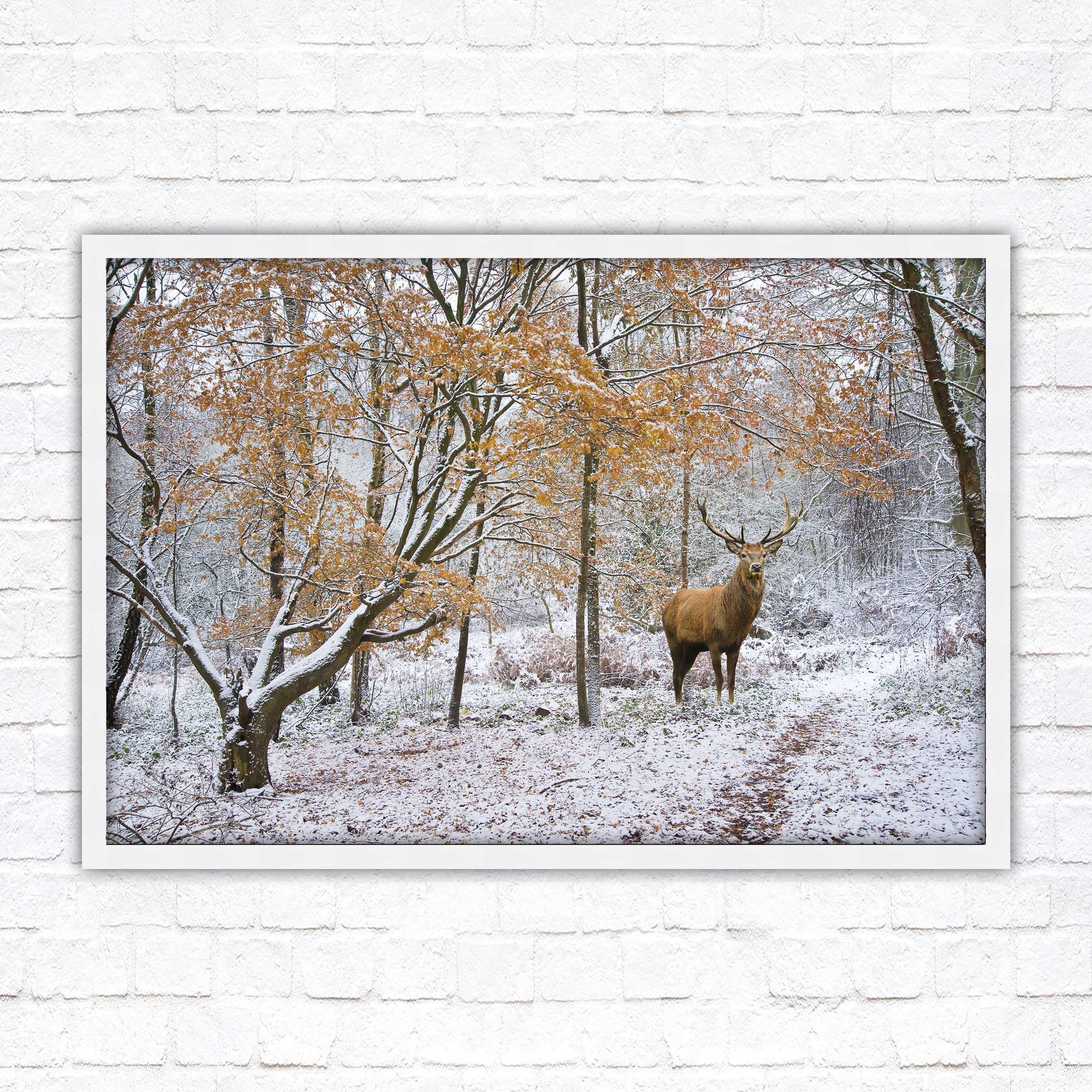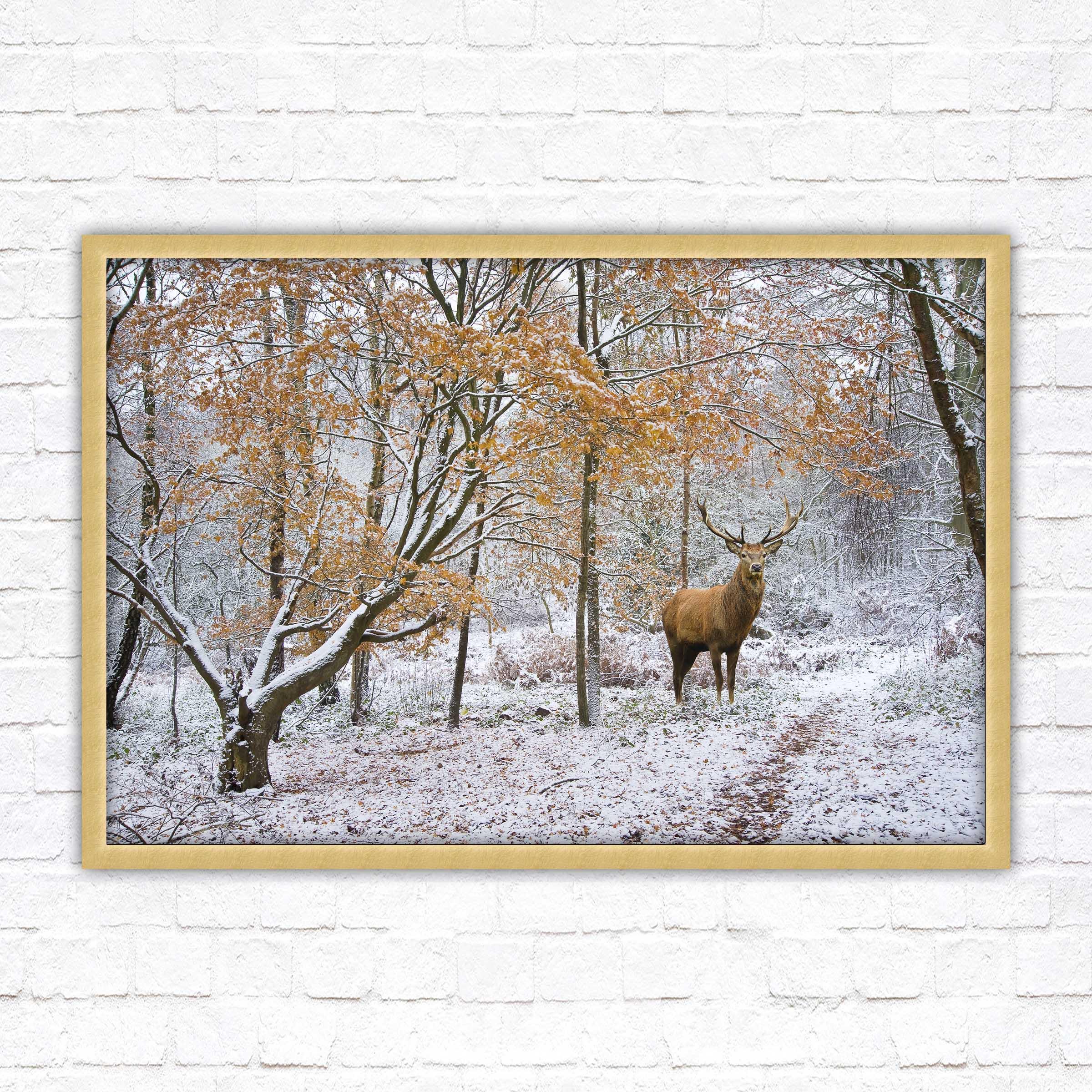Transform your space with the breath-taking beauty of nature! This stunning framed picture features a regal stag standing proud amidst a serene winter forest, where the snow blankets the trees and the crisp, cold air creates a sense of peaceful solitude.