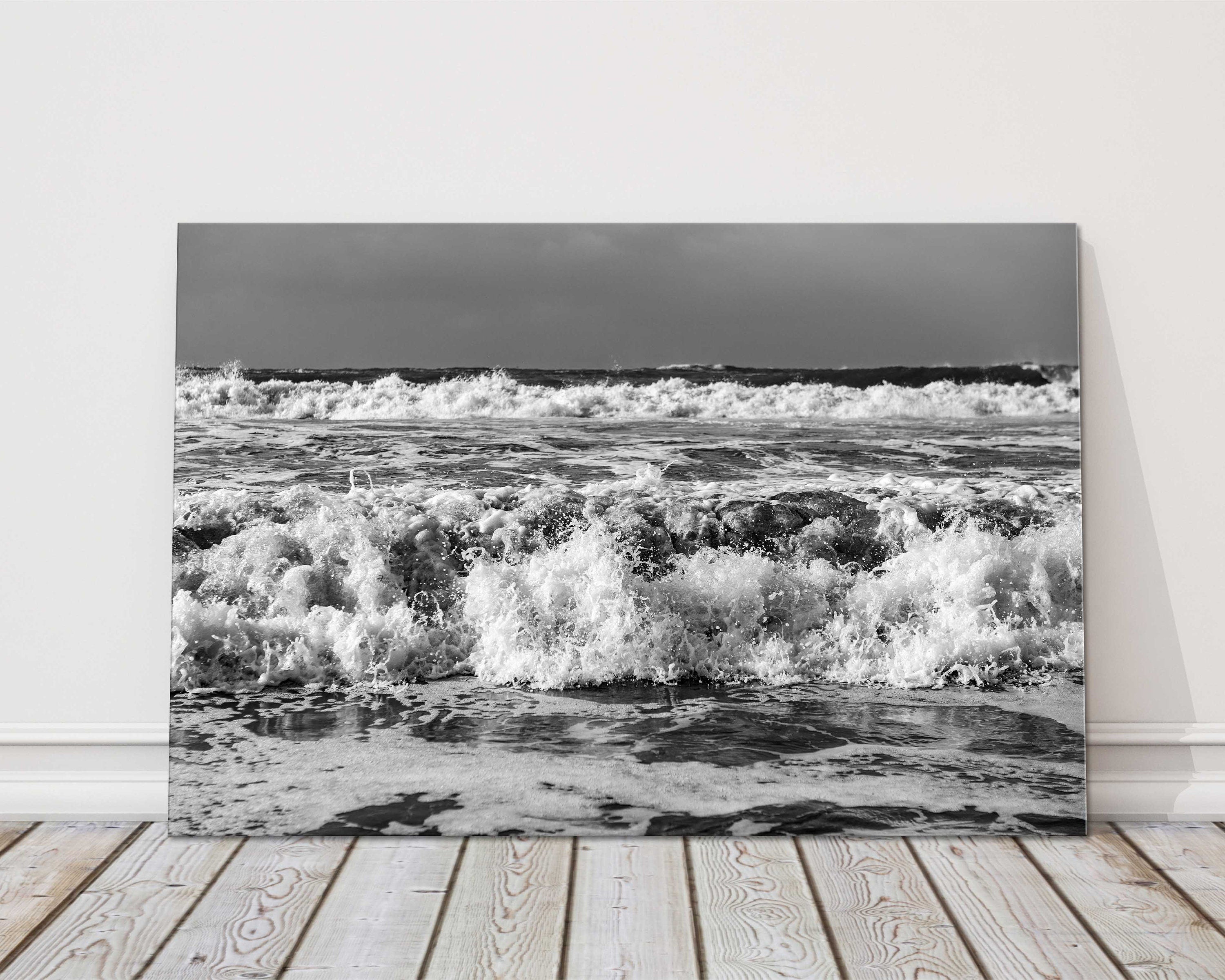Black and white close up image of a stormy day. Portreath beach, Cornwall. Dramatic breaking waves and a stormy sky Printed and framed as a canvas picture.