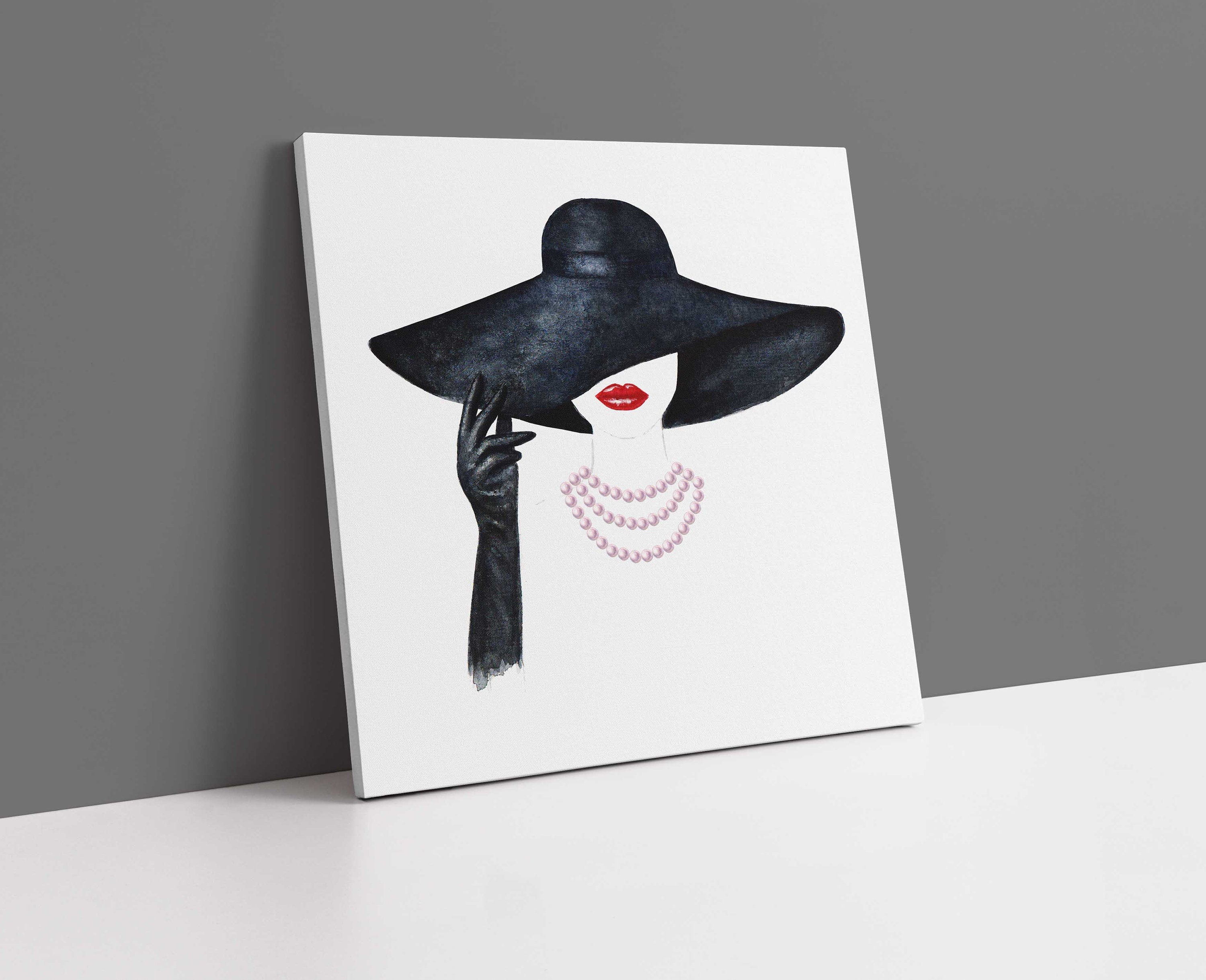 Stylish woman in a black hat, gloves and pearls. Canvas picture print. Available in a choice of sizes. Fashion, beauty.