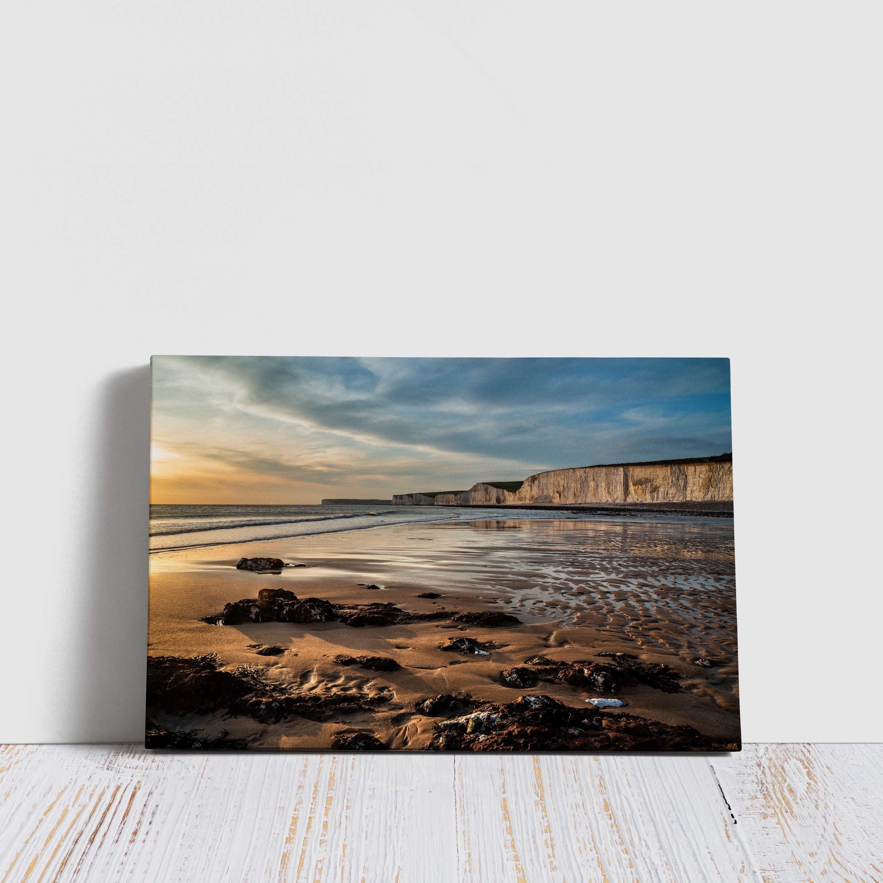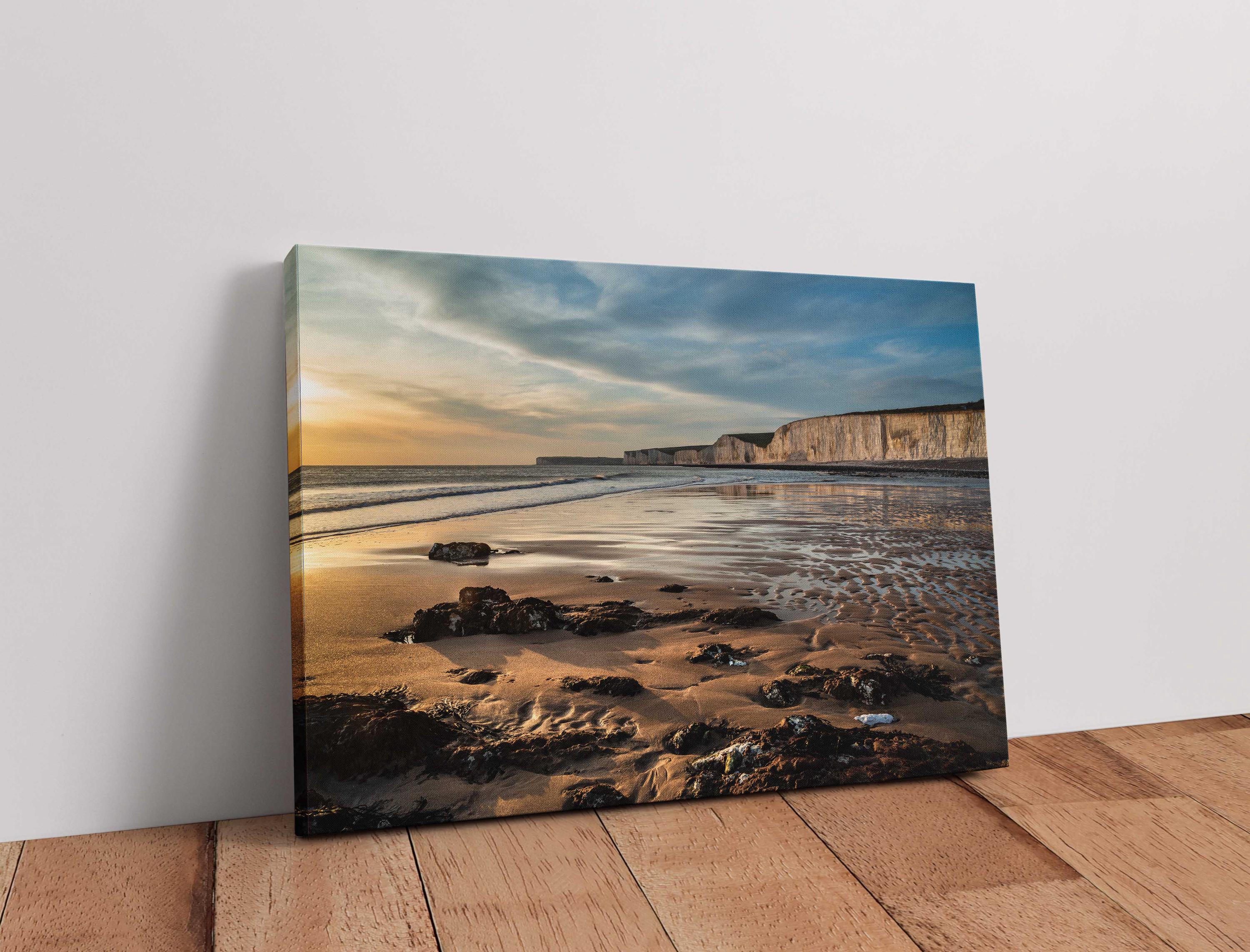 Transform your space with the breath-taking beauty of the English coastline. This stunning canvas picture captures the serene sunset over the iconic White Cliffs, where the warm hues of the setting sun meet the cool blues of the sea. Whether you're looking to add a touch of tranquility to your living room, bring the beauty of nature into your workspace, or gift someone a timeless piece of art, this canvas print brings the majestic English coast to life.
