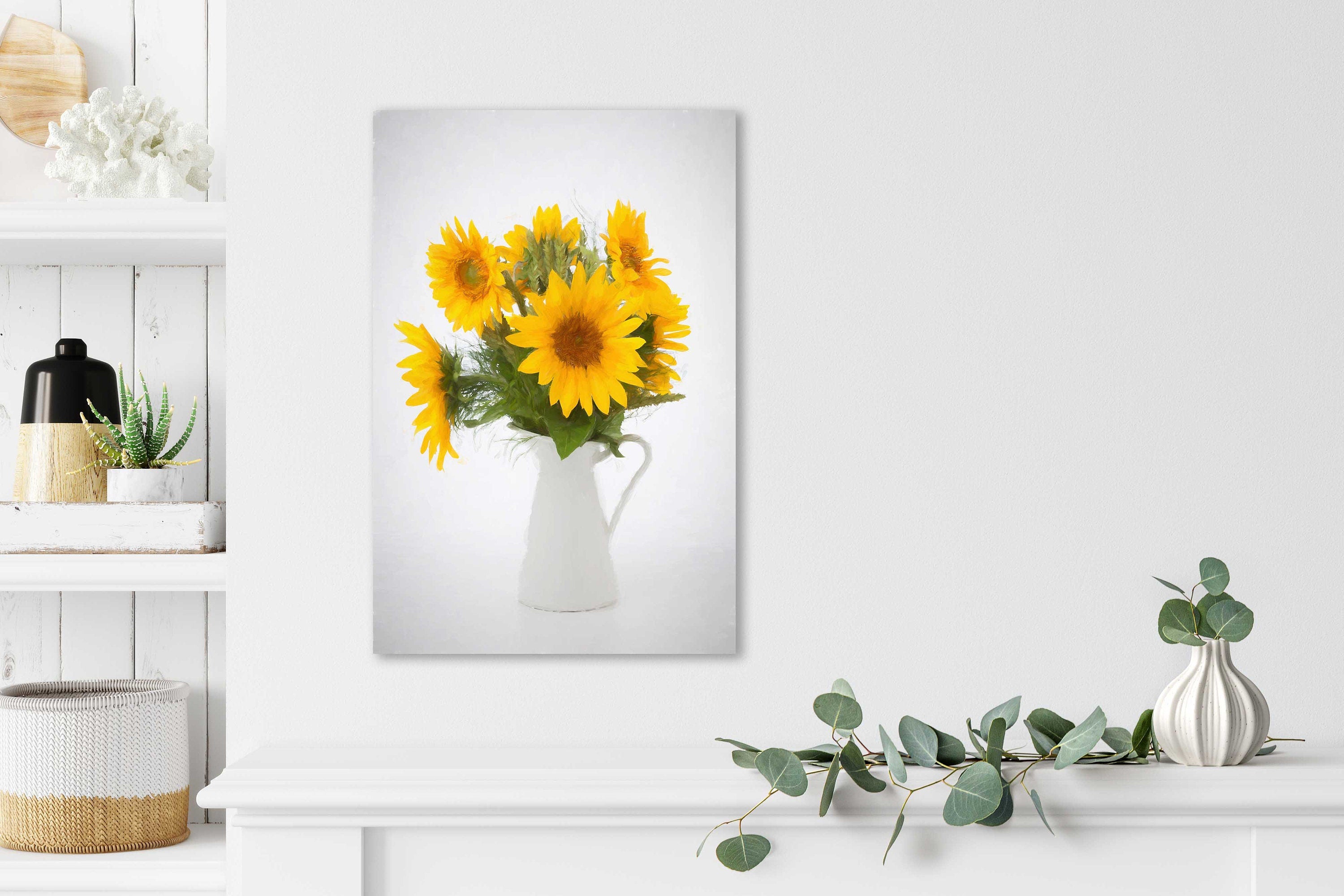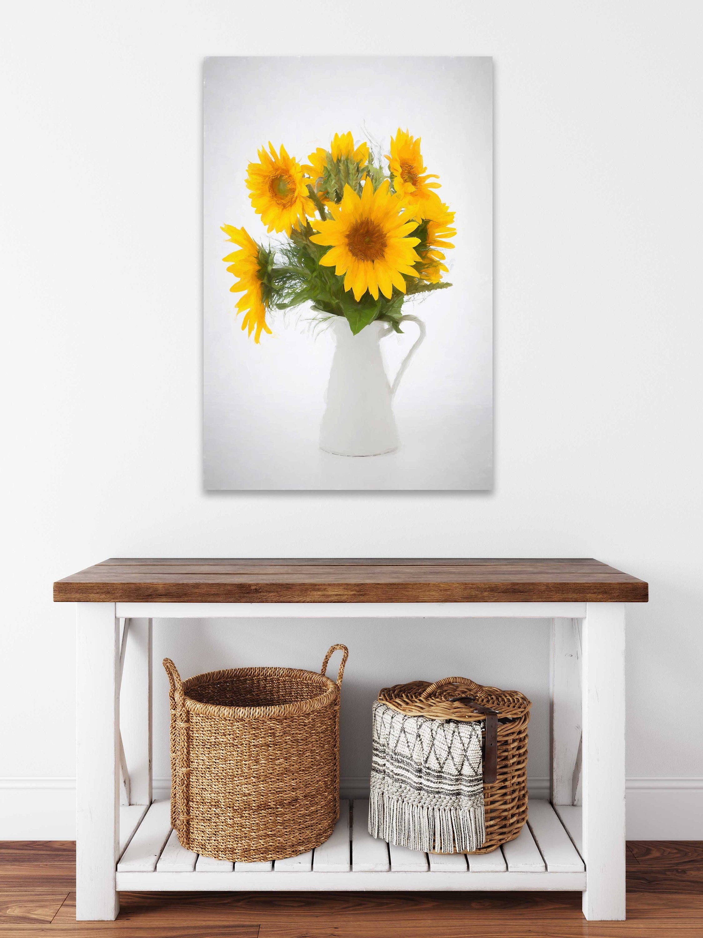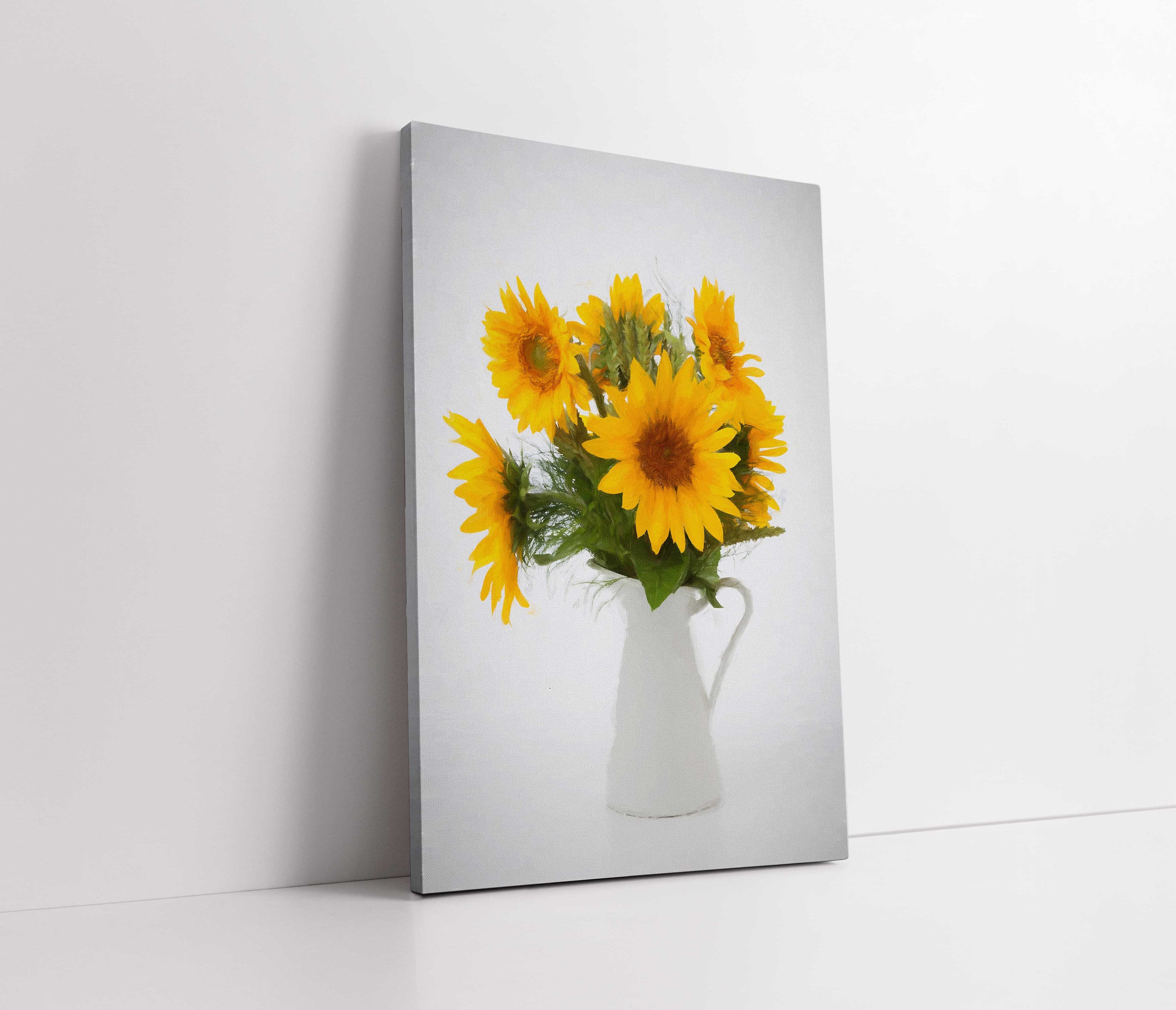 Sunflowers in a jug vase. Printed and framed as a canvas picture print. A range of sizes available. Colourful wall art for the home. Ideal as a gift. Summer sunshine.