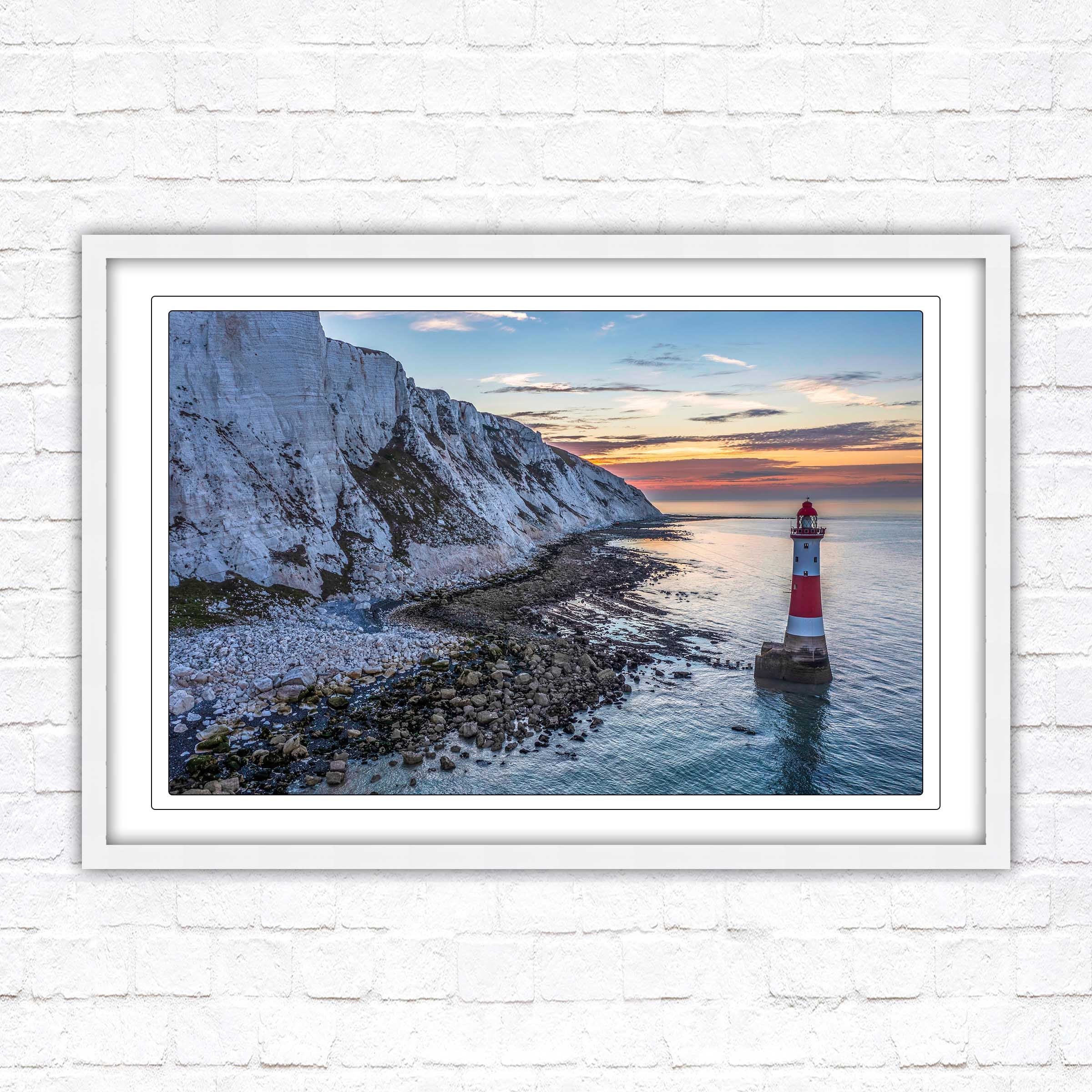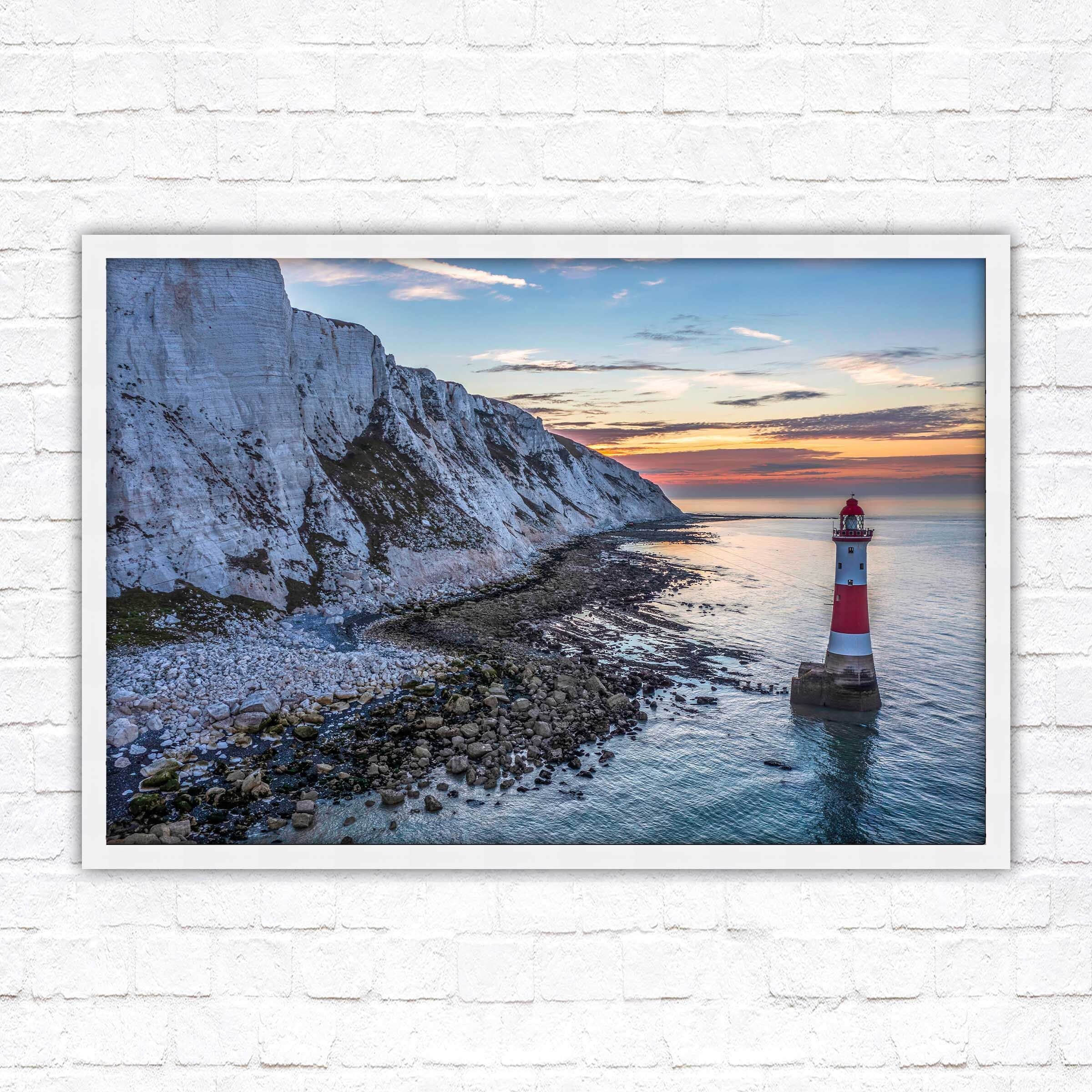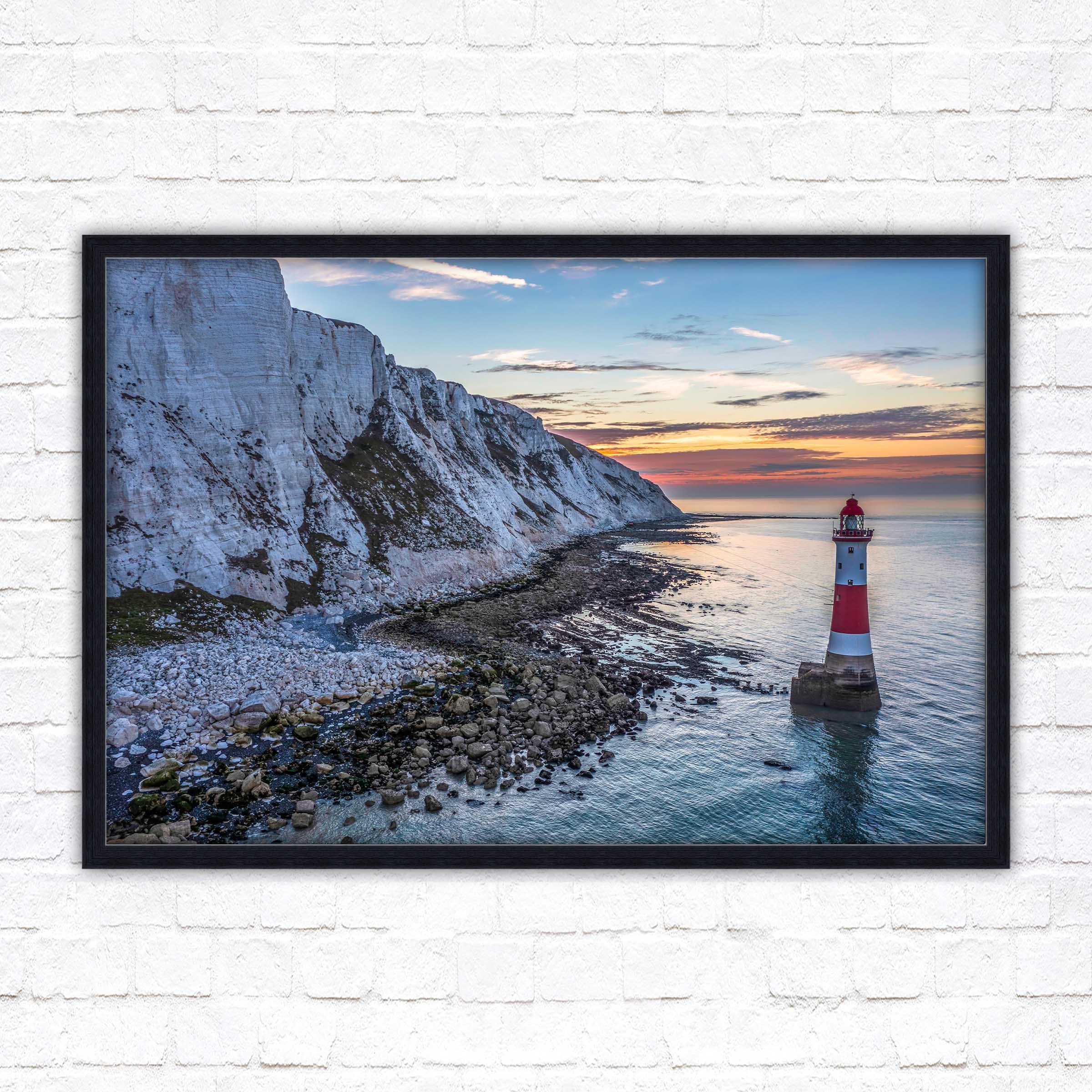 A beautiful panoramic framed picture of Sunrise at Beachy Head Lighthouse, Eastbourne, England. Chalk sea cliffs.