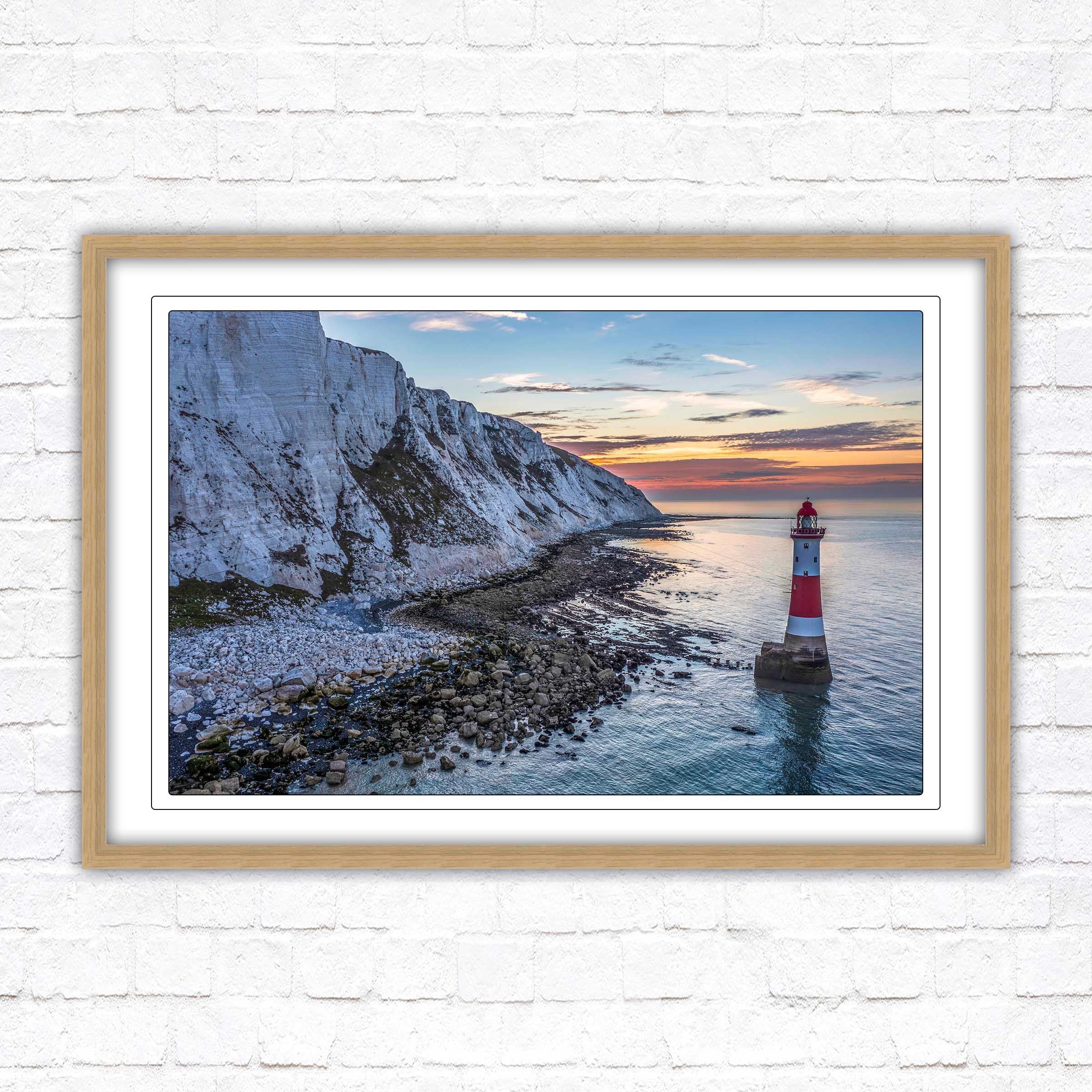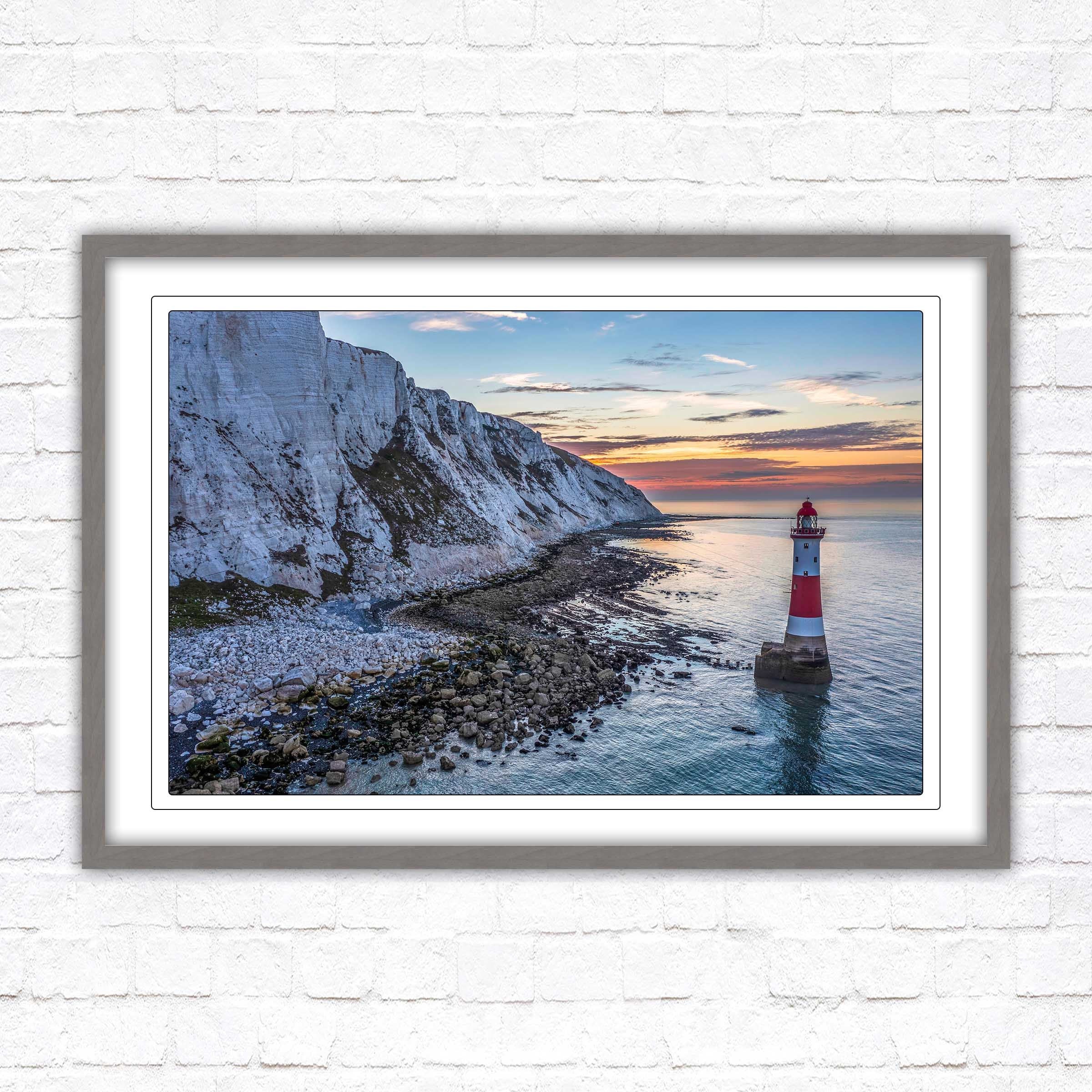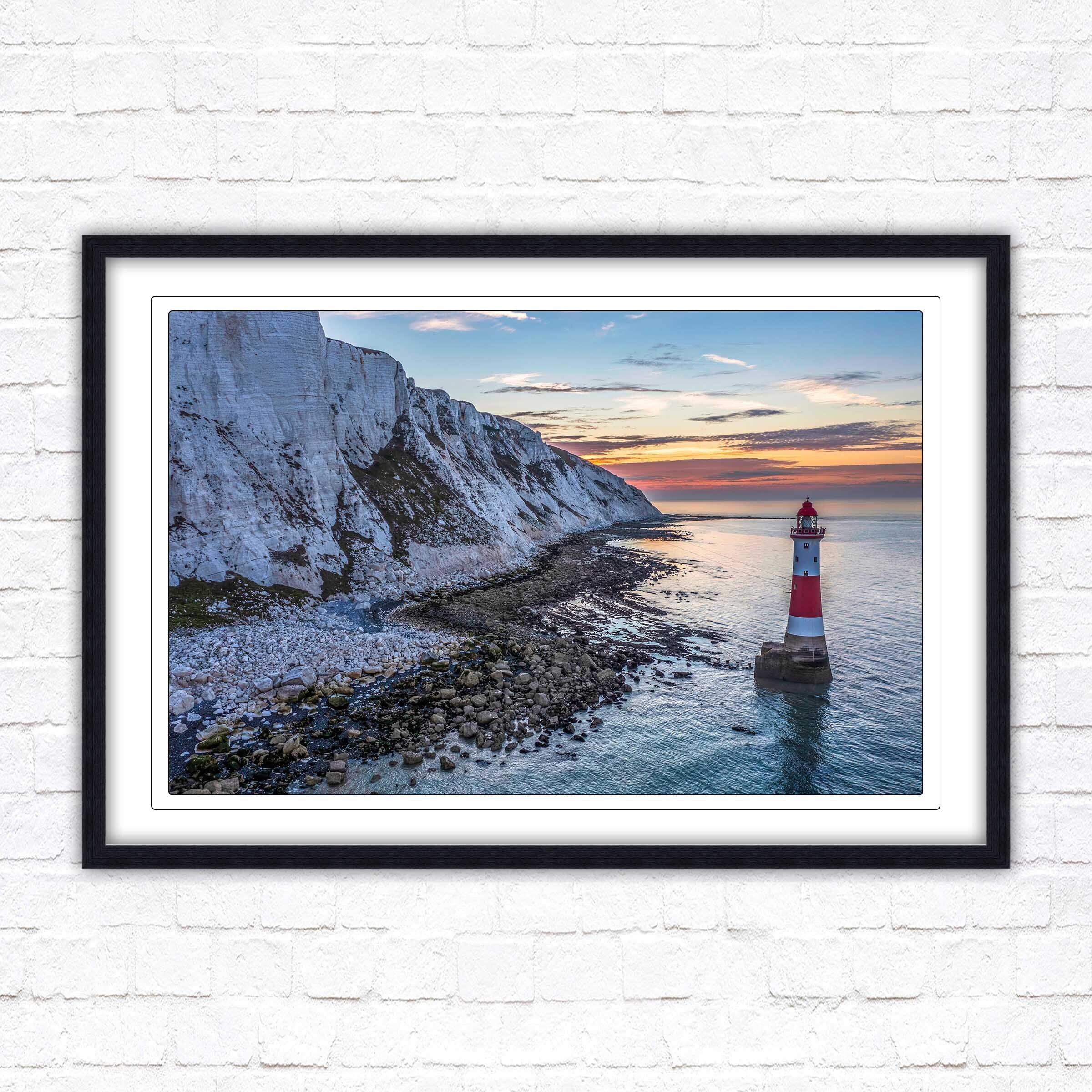A beautiful panoramic framed picture of Sunrise at Beachy Head Lighthouse, Eastbourne, England. Chalk sea cliffs.