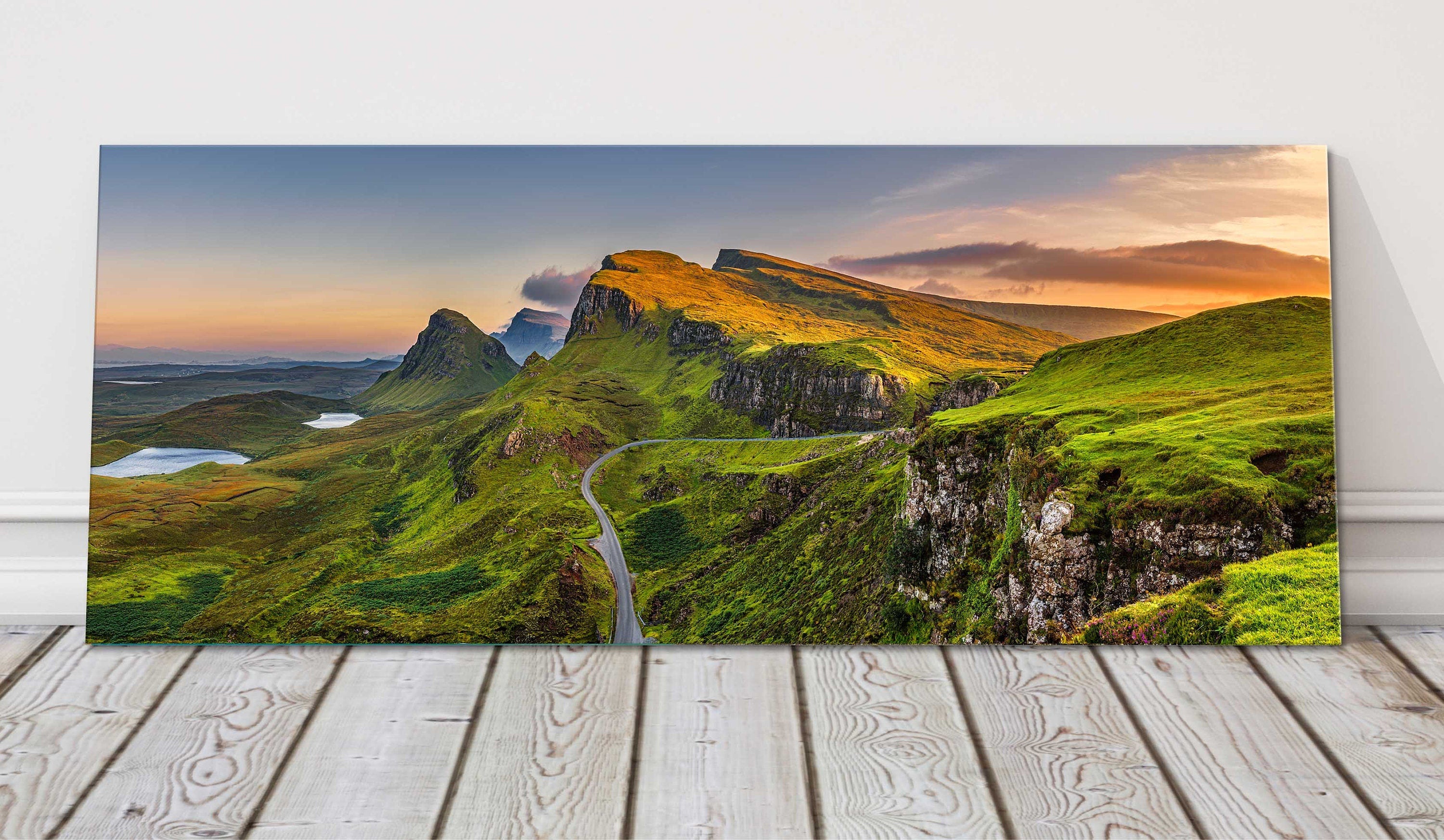 Sunset over the Quiraing mountains on the Isle of Skye, Scottish Highlands. Beautiful panoramic scene ideal image for home or office.