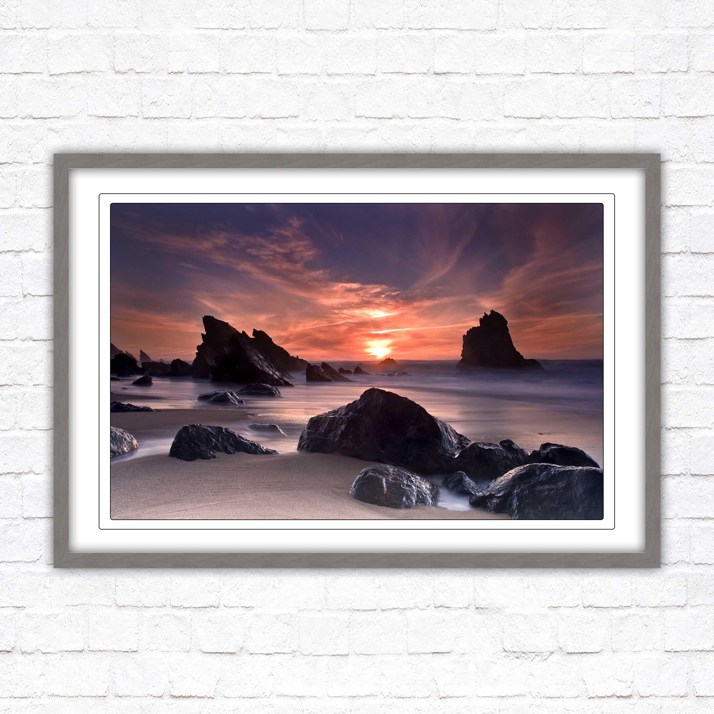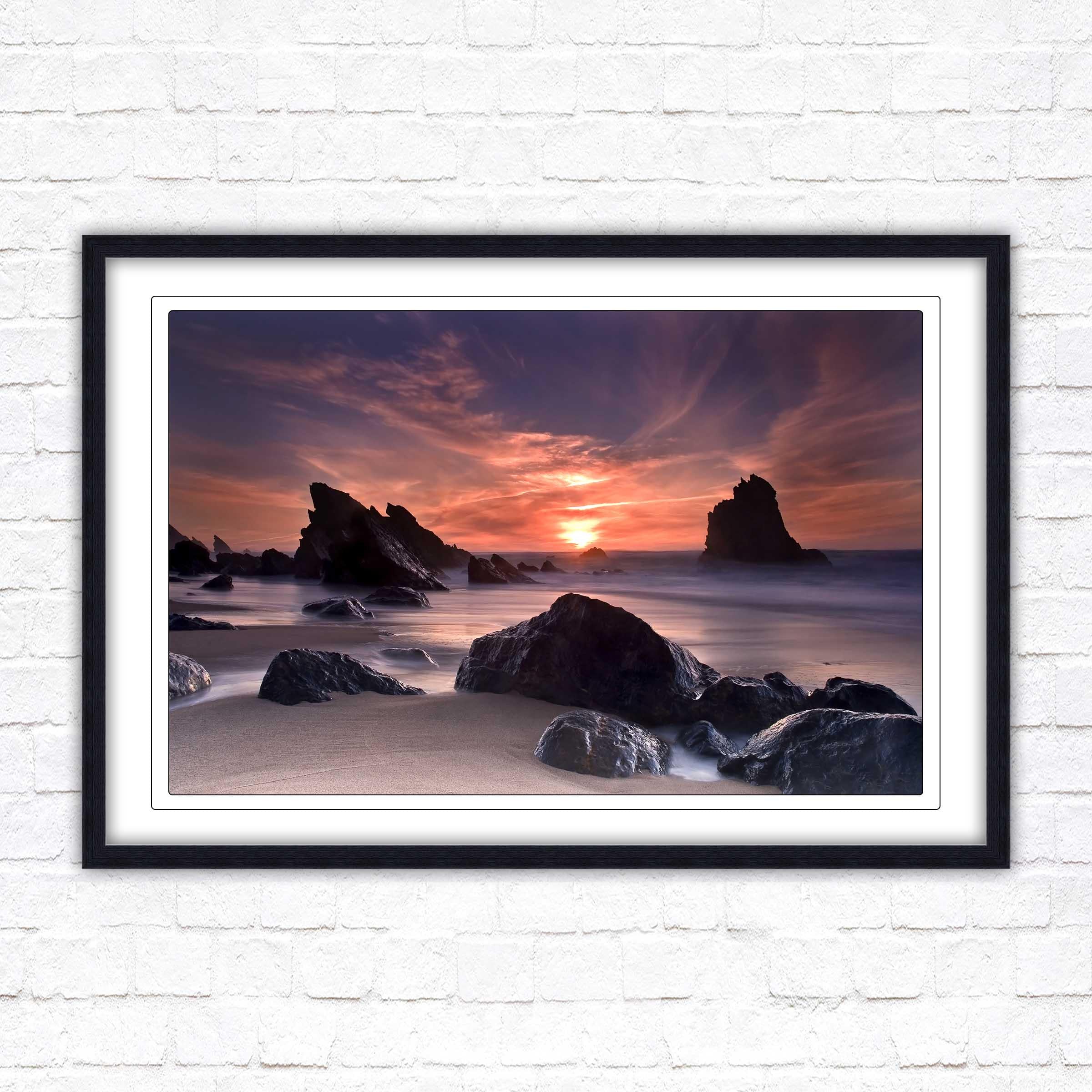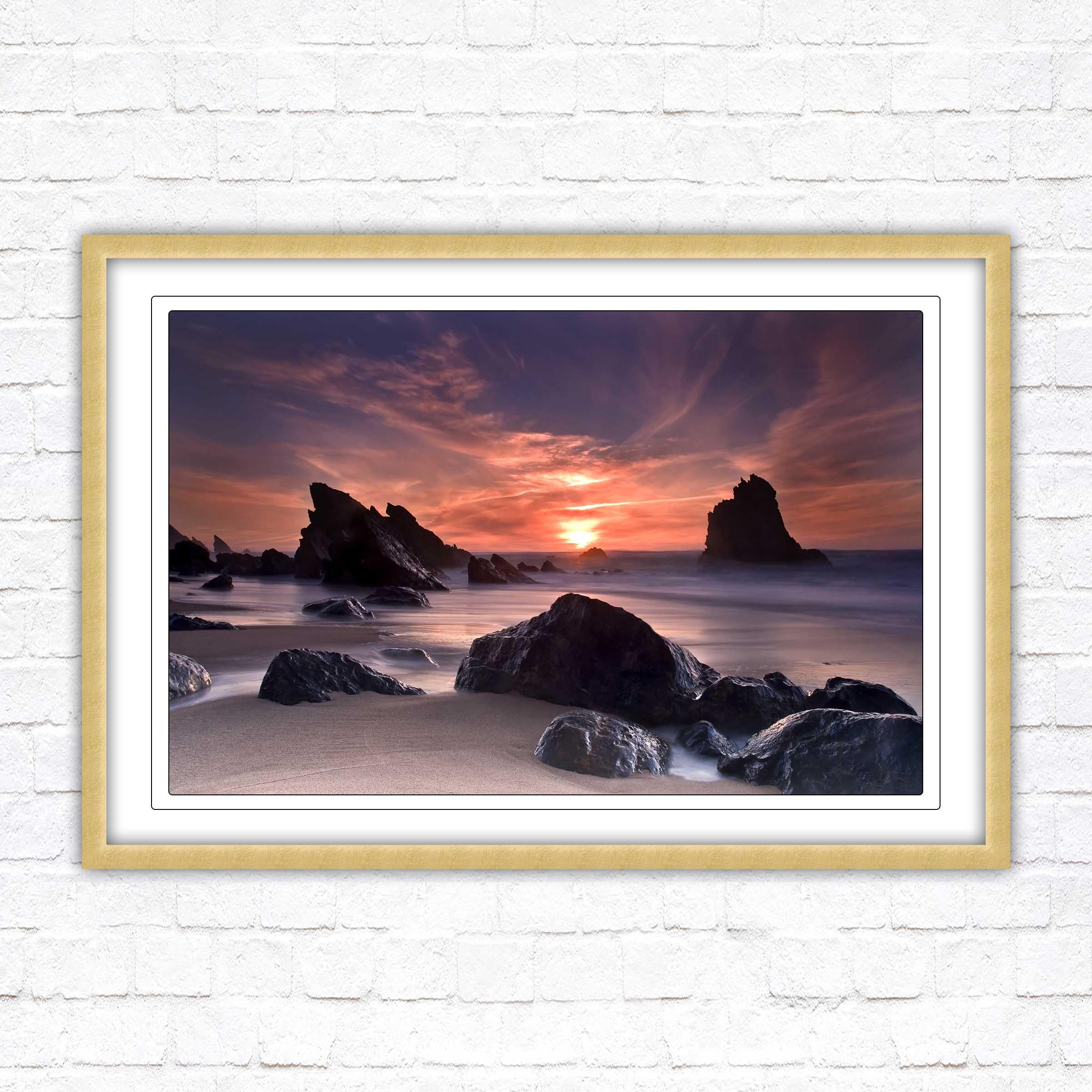 Sunset picture of Adraga beach, Portugal. Framed picture print with a choice of frame colours. Beautiful sunset picture.