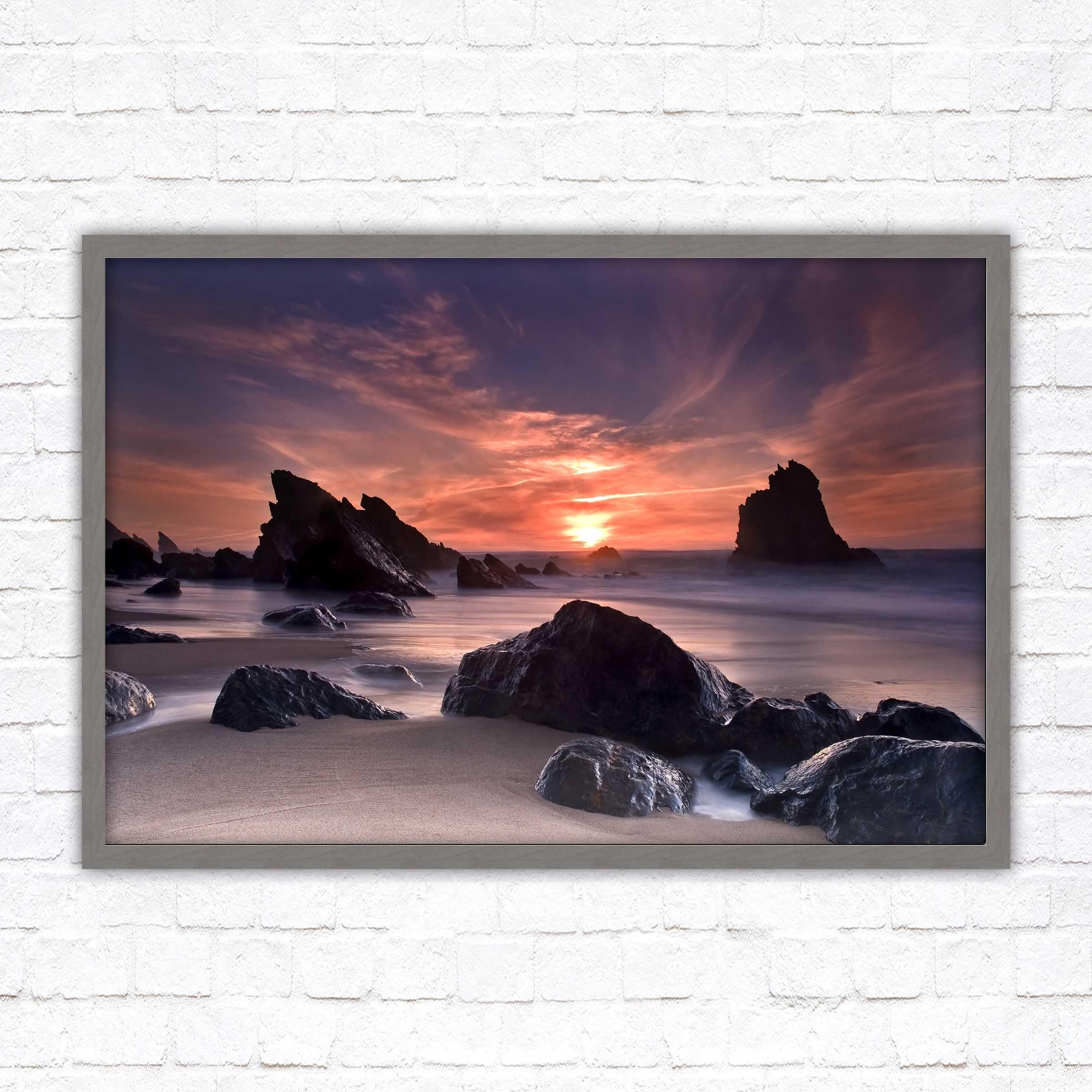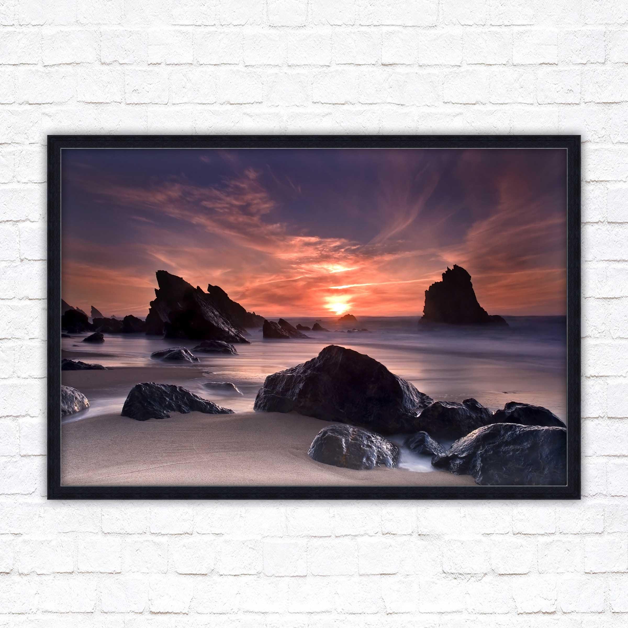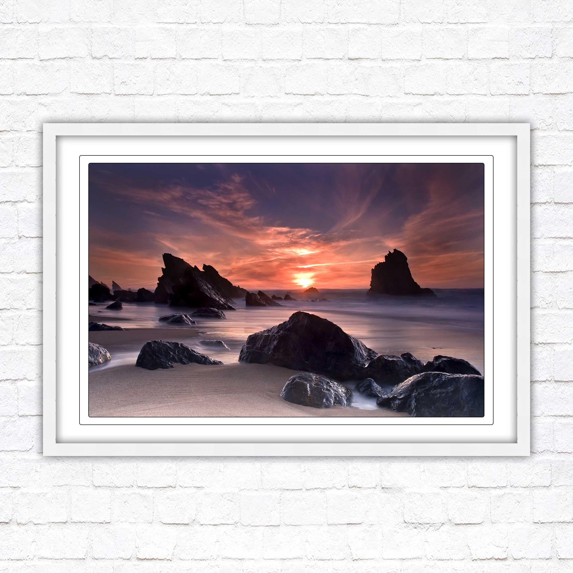 Sunset picture of Adraga beach, Portugal. Framed picture print with a choice of frame colours. Beautiful sunset picture.
