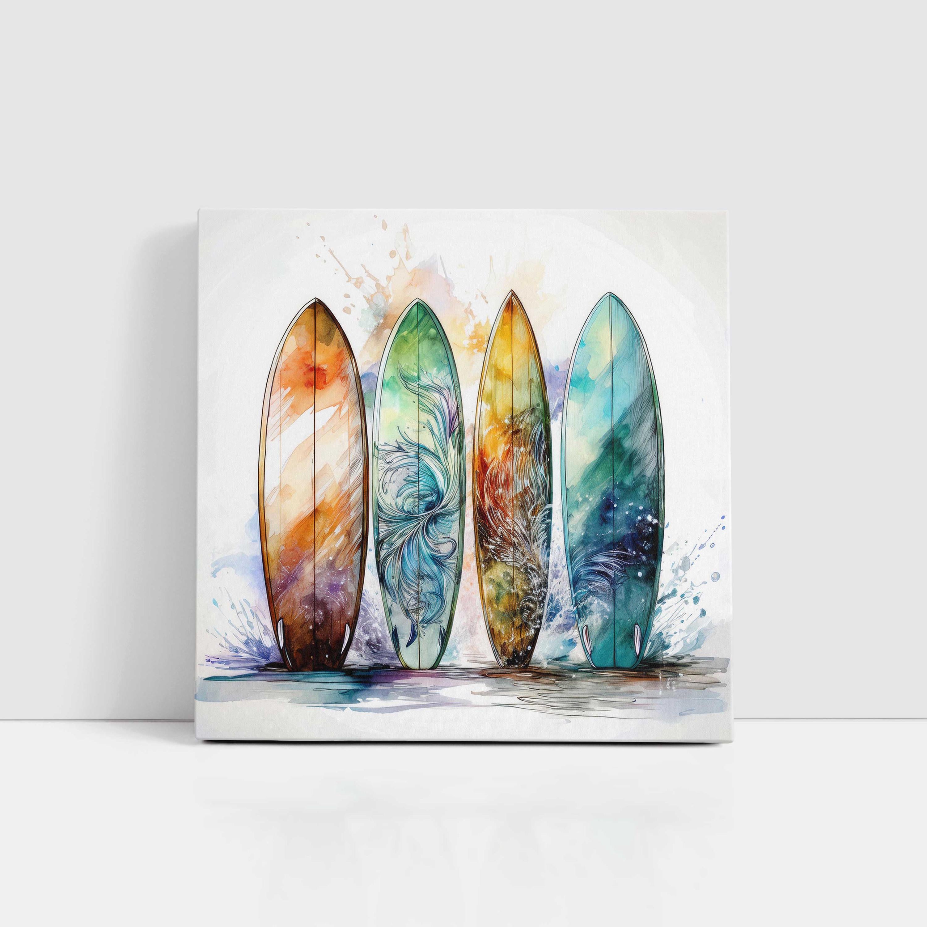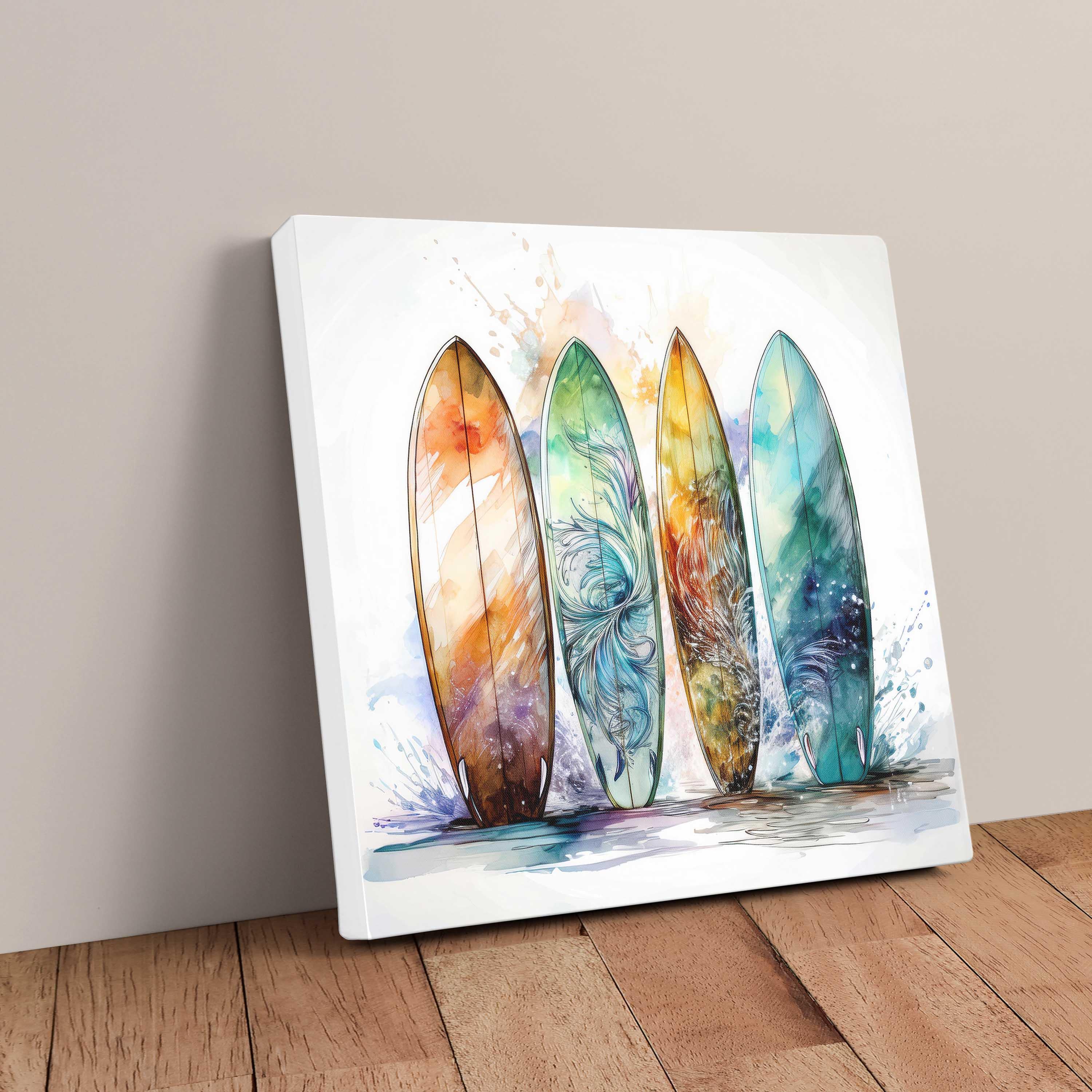 Surf boards watercolour painting. Printed and framed as a canvas picture print. Colourful coastal image. Available in a choice of sizes.