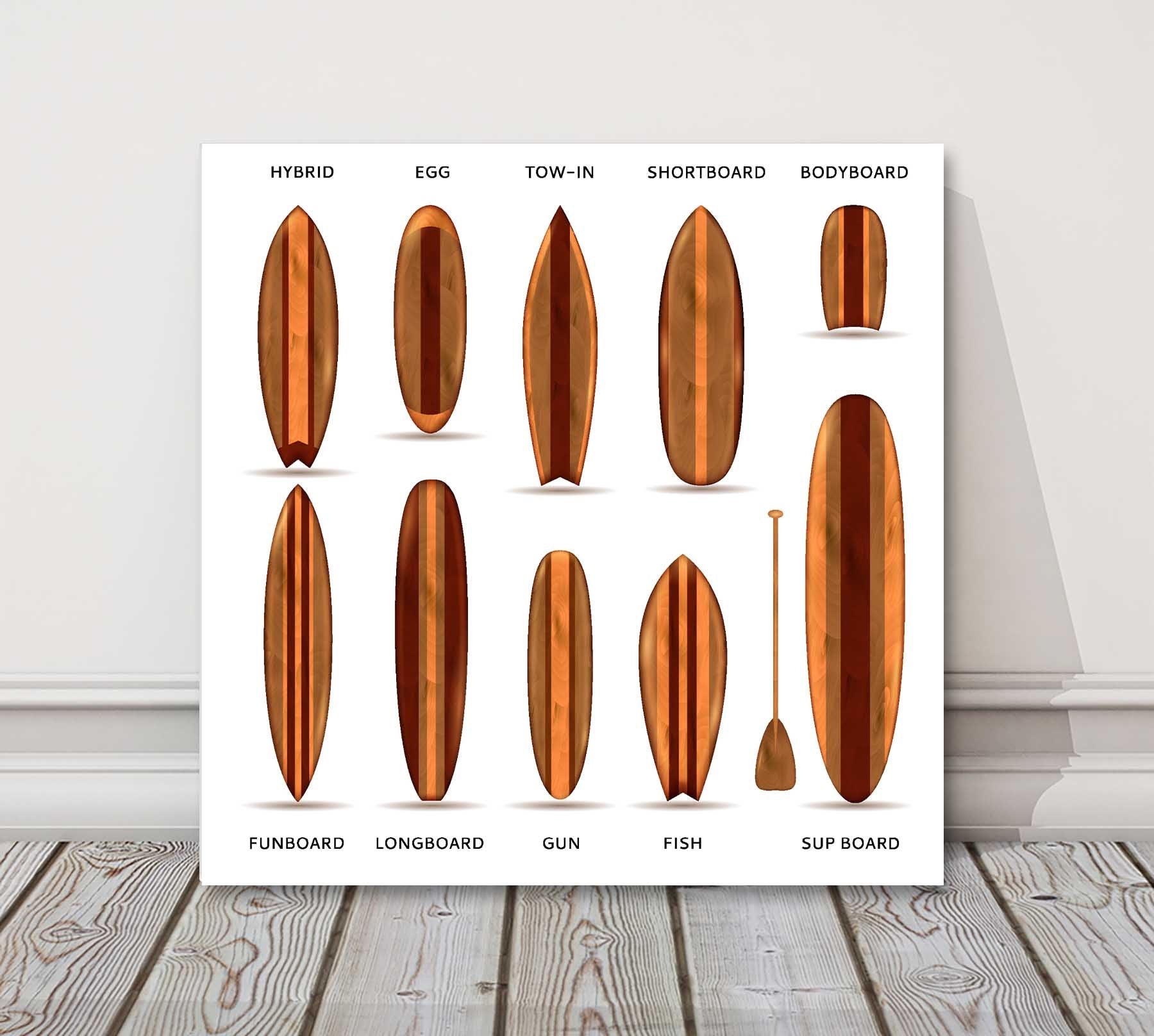Surfboard styles, displayed on a white background. Printed as a canvas picture print. Available in a choice of sizes.