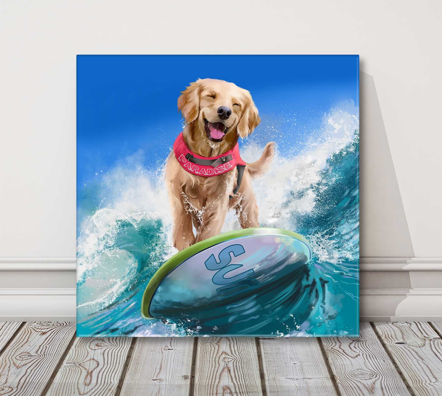 Surfing dog, Golden Retriever. Fun canvas picture print. Available to order in a choice of sizes.