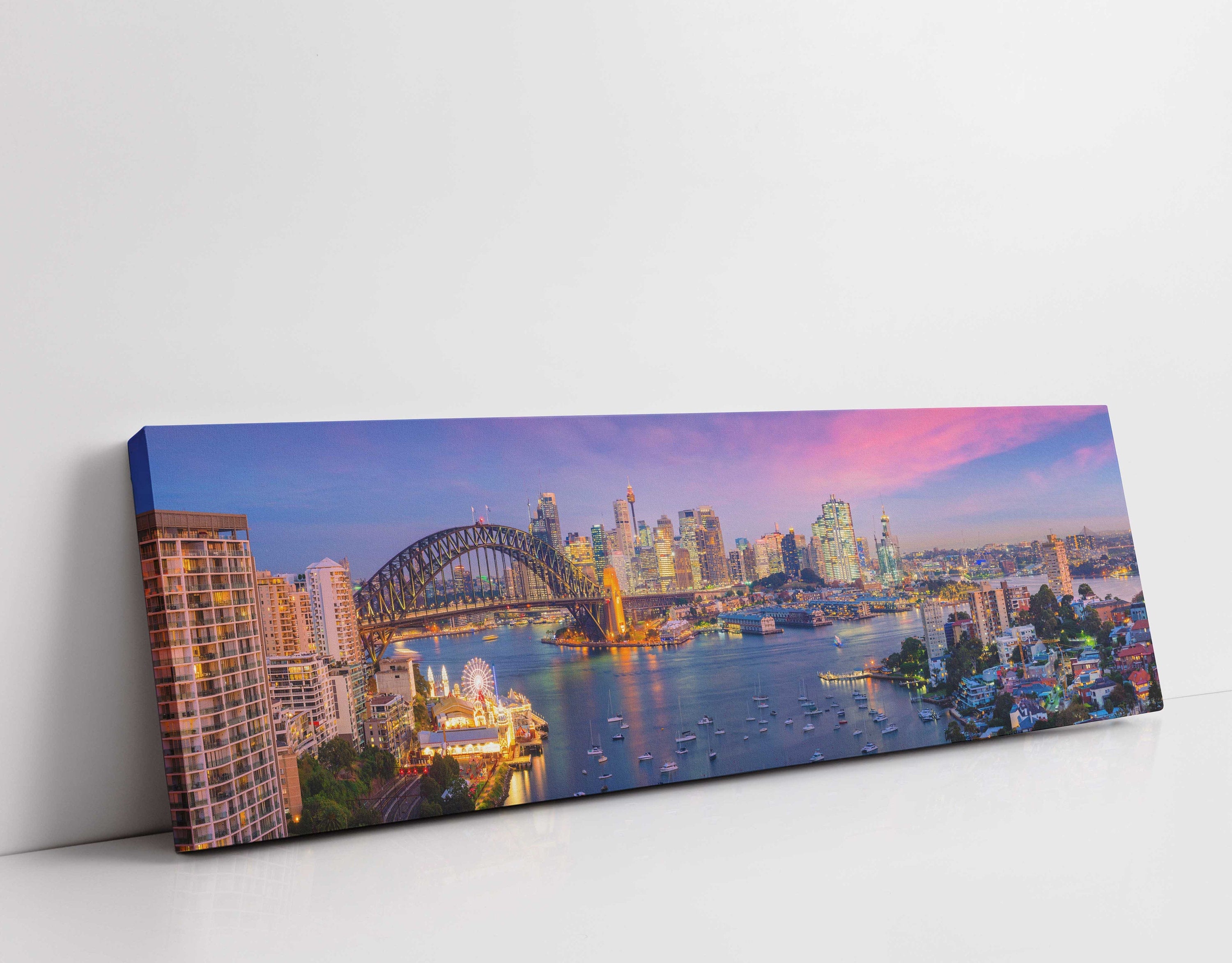Sydney skyline at sunset, Australia. Panoramic canvas picture print. Sydney harbour bridge. Cityscape.