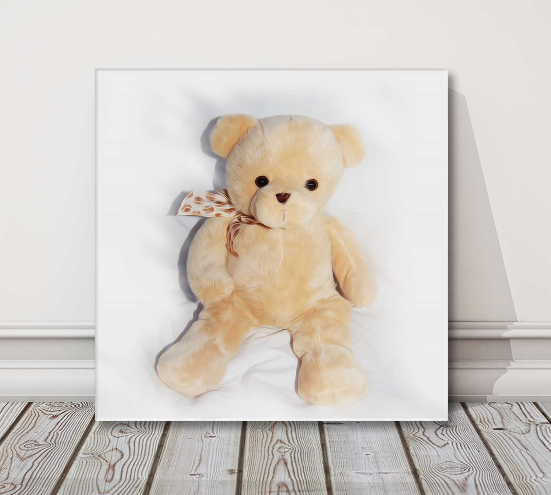 Teddy Bear pictured on a white blanket. Cute canvas picture print, available to order in a choice of sizes. Lovely gift. Ideal for nursery/childrens bedroom.