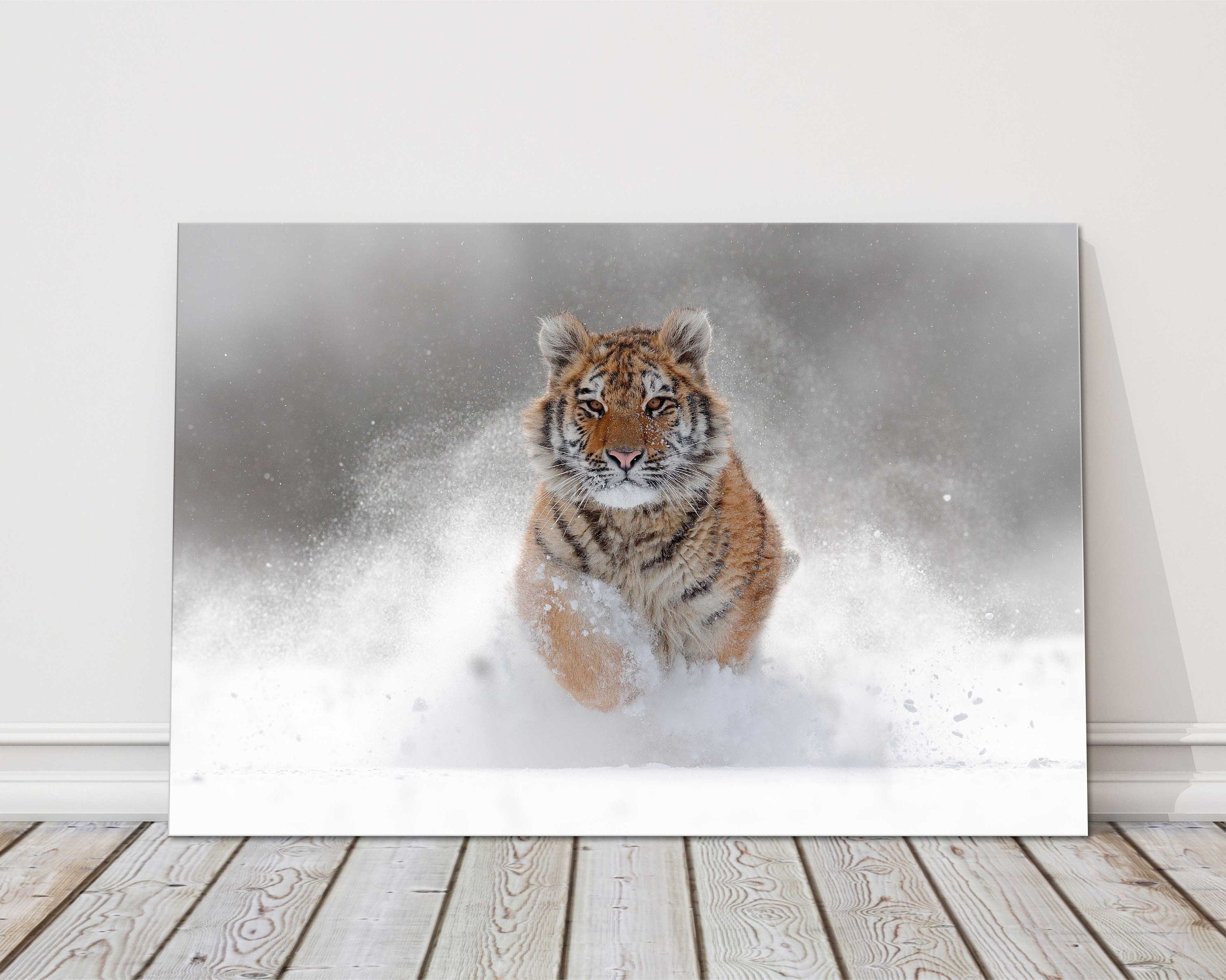 Tiger running in the deep snow. Wildlife in winter scene. Pictured on a snowy grey background. Printed as a canvas picture print. Choice of sizes available.