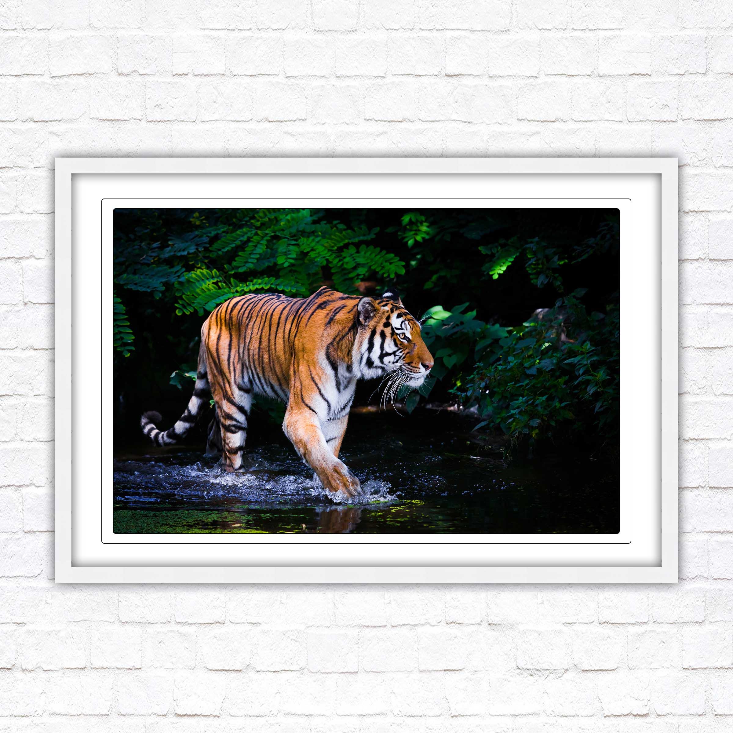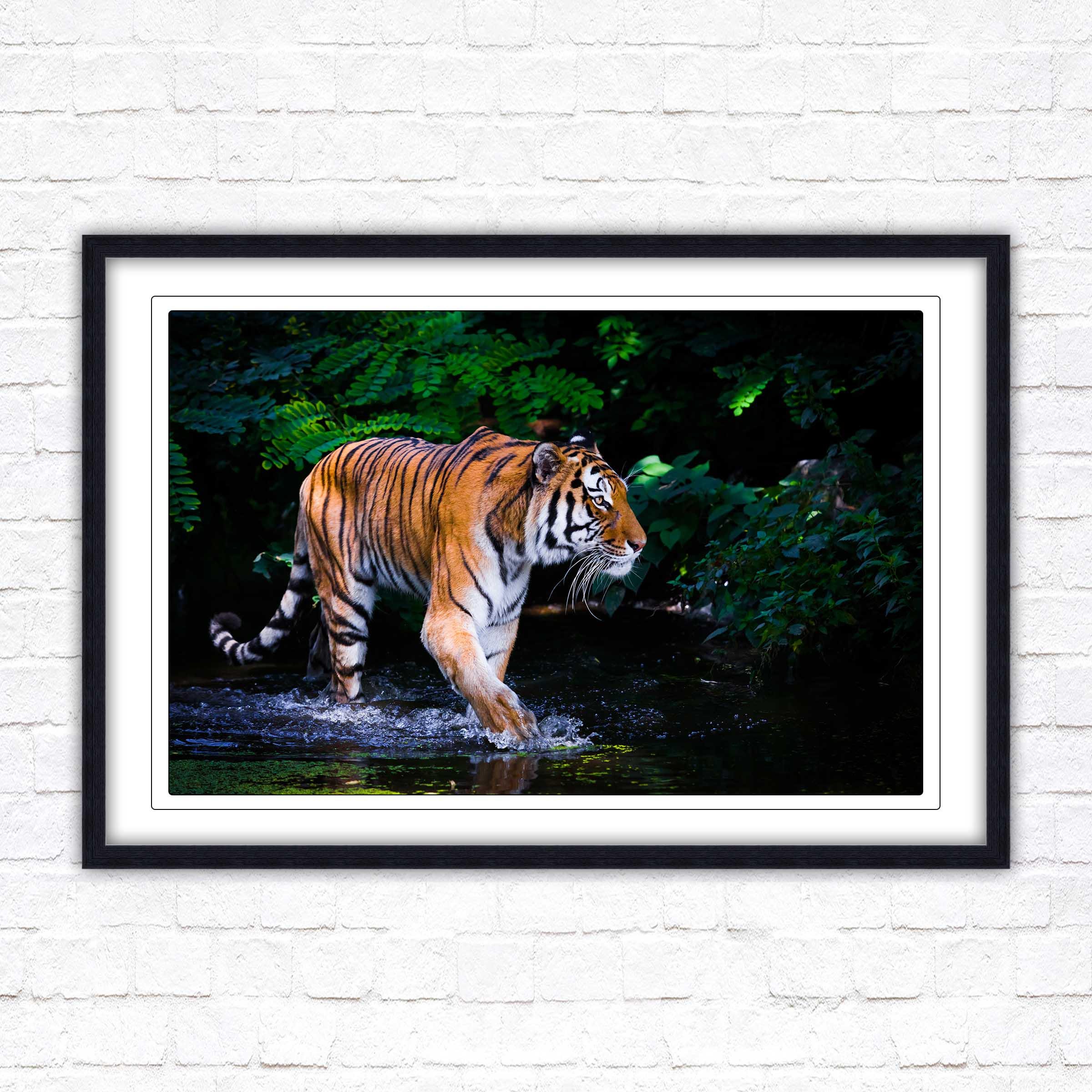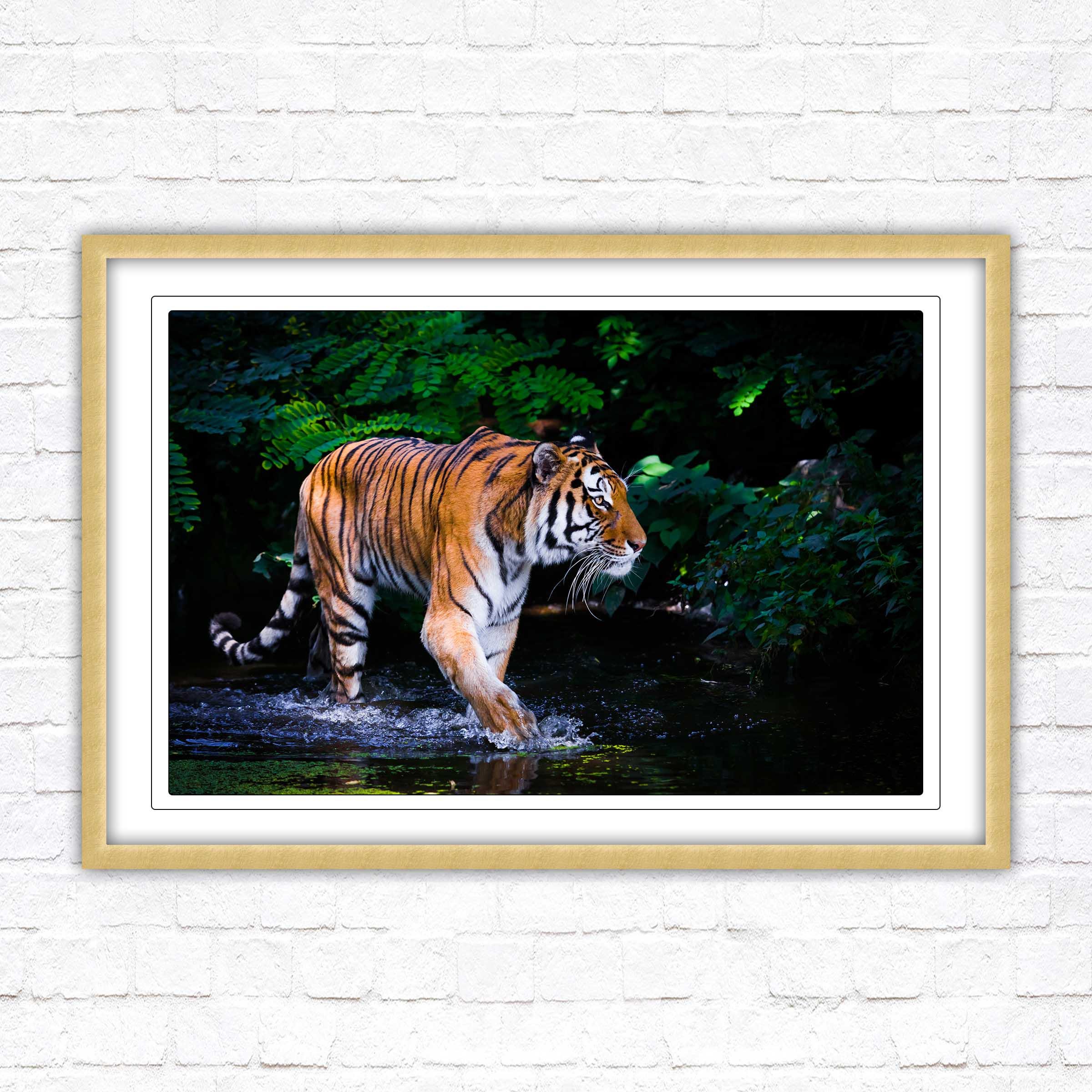 Tiger in the wild. Prowling though shallow stream, hunter instinct. A choice of frame styles and borders. Big cat, wildlife picture.
