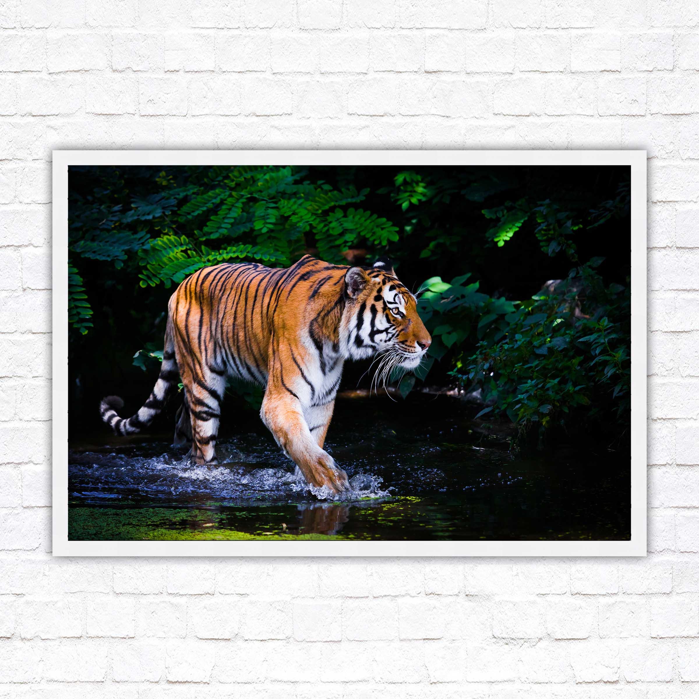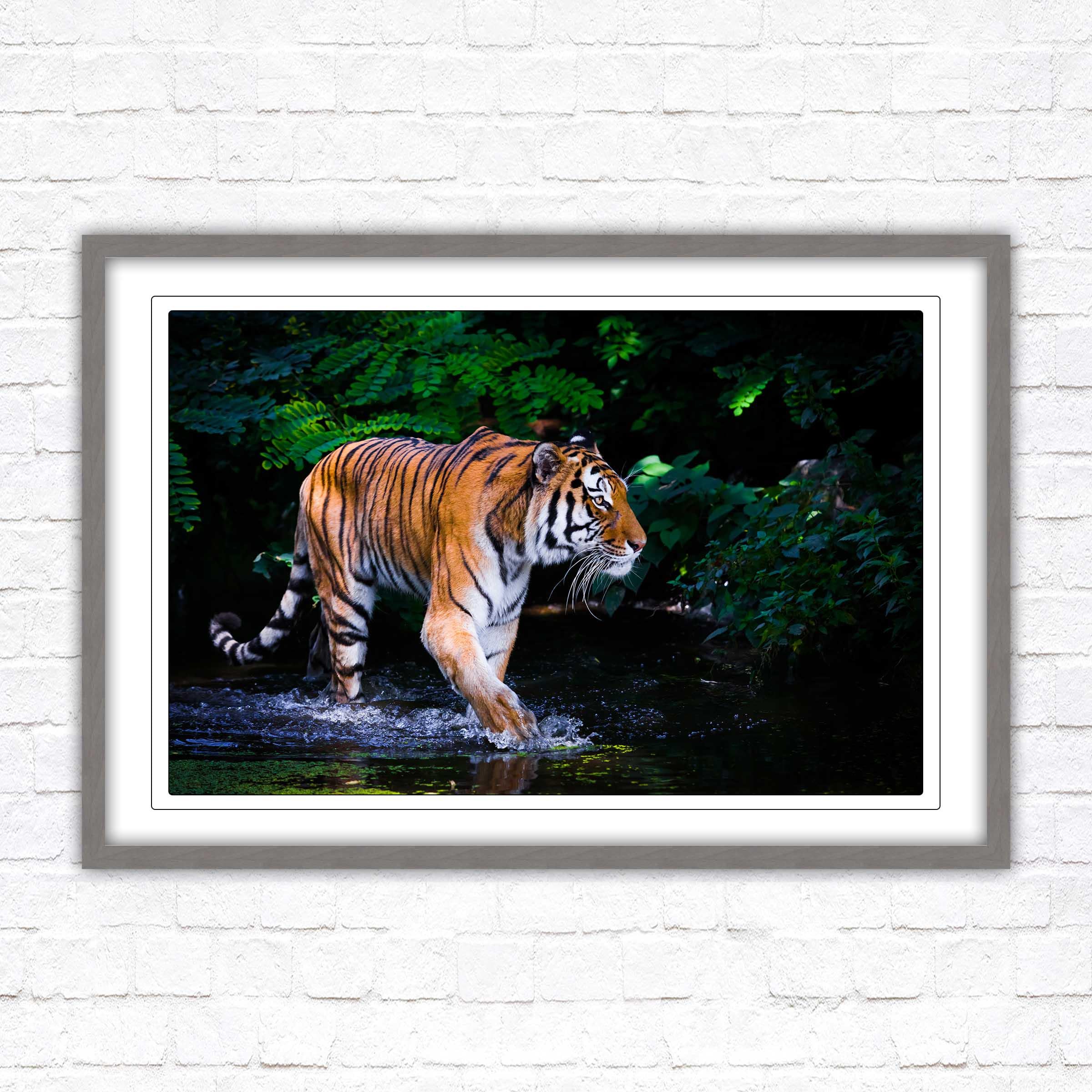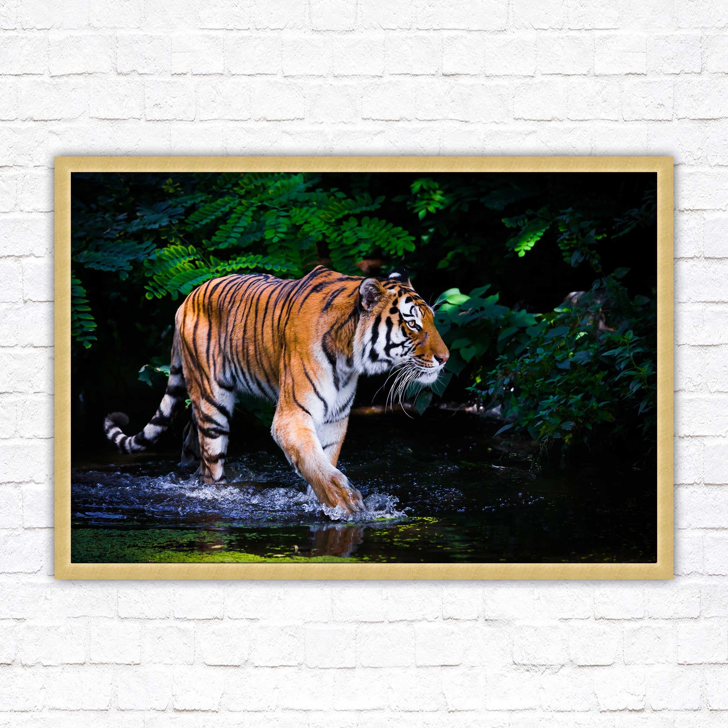 Tiger in the wild. Prowling though shallow stream, hunter instinct. A choice of frame styles and borders. Big cat, wildlife picture.